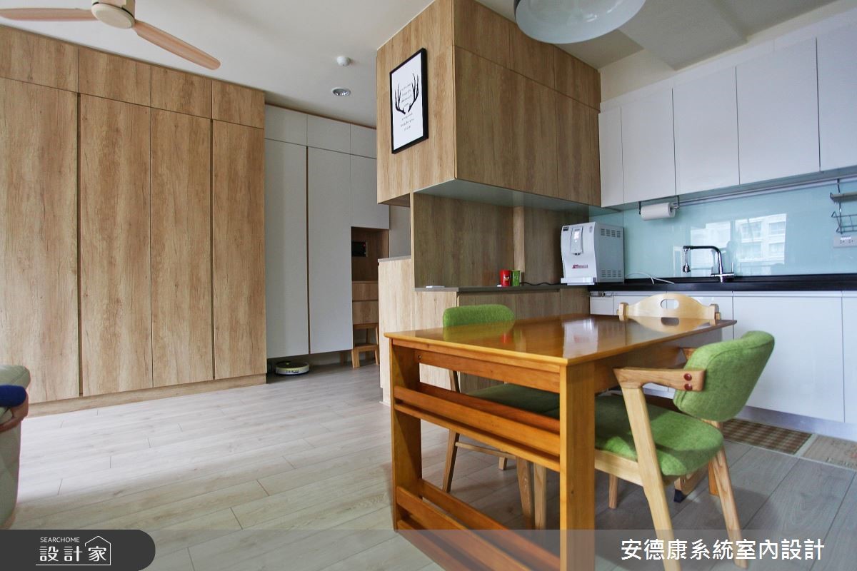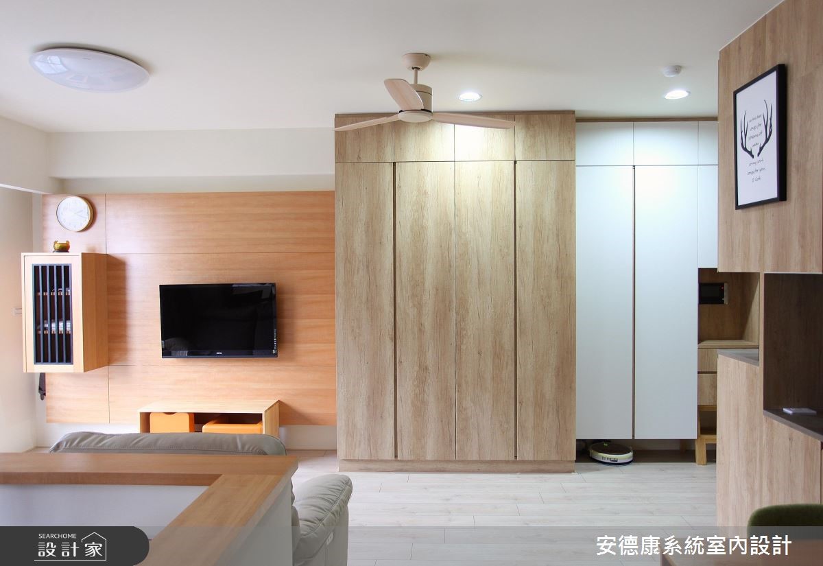 充沛的自然光随窗入室,照亮北欧风的室内情境,烘托木纹肌理的自然简约之美。此外,开阔的公领域除了增添日常所需的收纳机能,更成了孩子平时的游戏空间,也是大人们身心放松之地。 【满满木质调,以系统柜主导收纳】整体空间以木地板铺陈,并以系统柜成为空间的主要收纳设计。同时,为了让成长中的孩子拥有一个无压的舒适空间,特别在公领域营造出开阔、明亮的居家氛围。玄关两侧摆设收纳柜,让入口更显集中,藉此将内外领域清楚划分,餐厨空间与玄关有效区隔。进入公领域,视野随之明亮而辽阔,客、餐厅与书房相融一室,开放的格局配置,让居家生活更显舒心惬意。电视墙以温润的原木质感打造,与空间里不同色泽的木纹相互配搭,创造视觉渐层,左侧搭佐悬空的电视柜,采用格栅造型避免柜内的电线配置一览无遗。沙发后方为书房领域,配置一座开放式的系统书柜,再搭配飘窗设计,轻享悠闲时光。