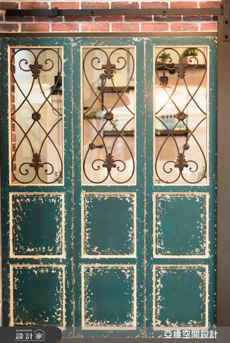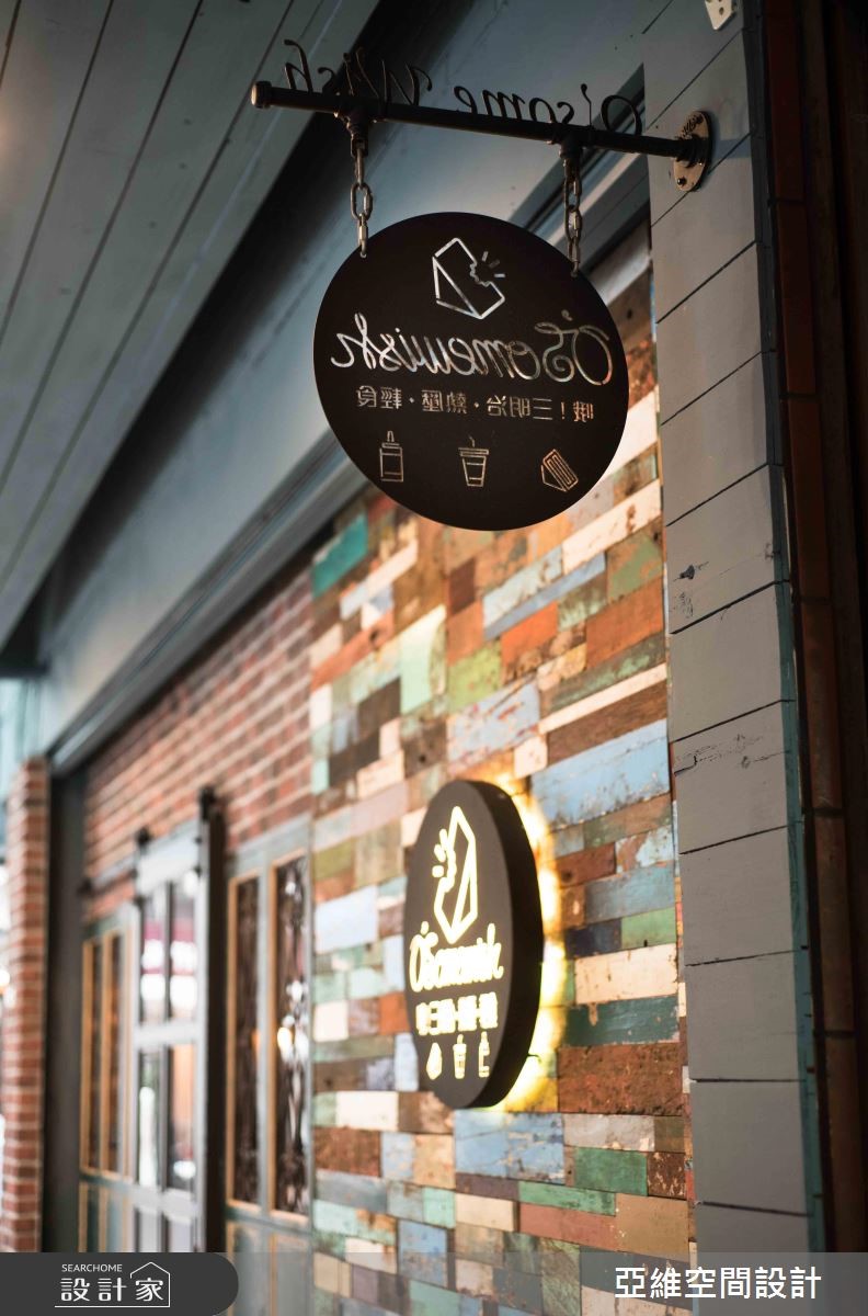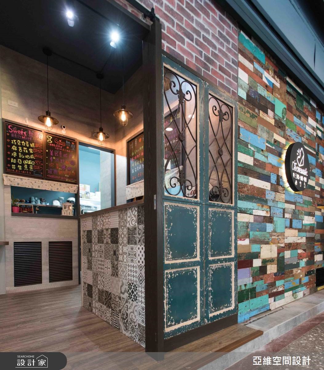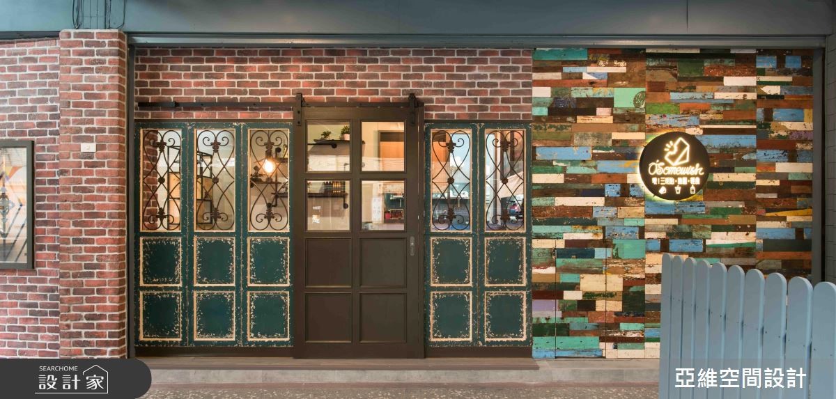 43平方米的二手屋商业空间,为"O'somewish"三明治轻食店,设计师加入乡村风格,透过拆卸下来的铁木旧船板,融合混搭而复古的色彩,搭配着老件窗花、古董门片与光影穿透,使空间有如童话绘本般缤纷梦幻!【怀旧木栈板,打造童话小屋质感】店面外观采用回收木栈板错色处理,营造手感况味十足的门面印象,同时以怀旧感复古红砖叠砌墙面,搭配斑驳且醒目的绿色门板,在反差色调之下,形构有如童话小屋般的特色场景。【铁件古典雕花,连结景观与光线】此外,也特别挑选国外运回的镂空铁窗,以欧式古典的雕花线条,运用清玻与镂空设计,连结室内与户外的景观,促进视线和光线流转;室内则规划面窗的吧台区与普通座位区,呈现不同用餐情境,不规则的层架设计,更增添变化与趣味!