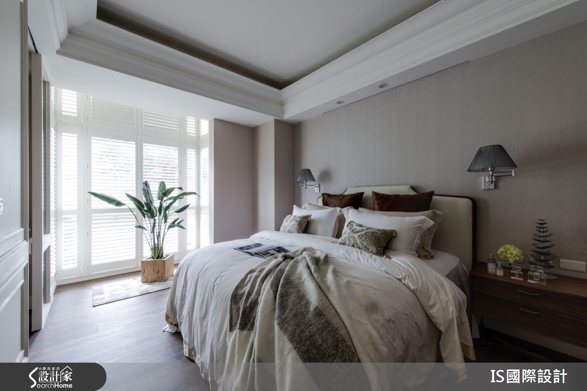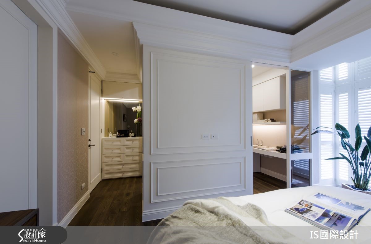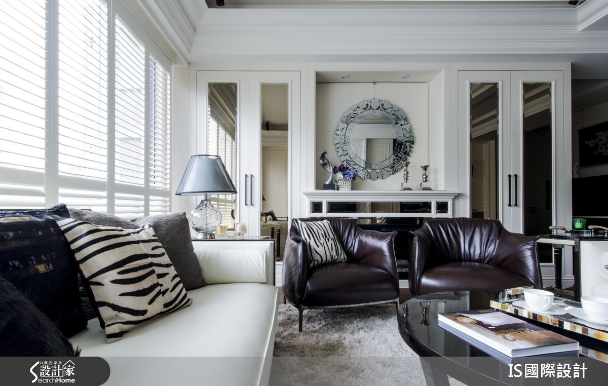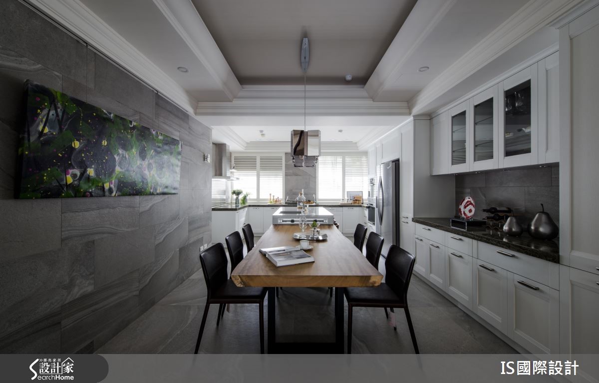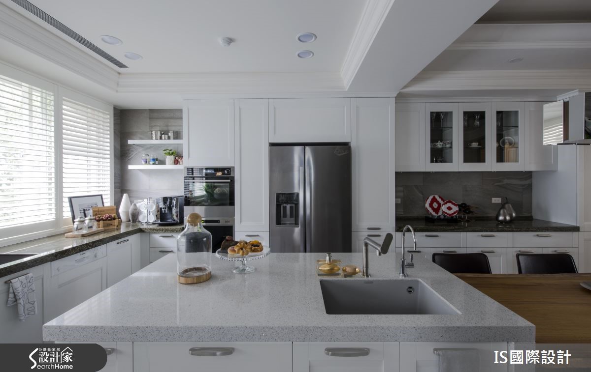 此案经典的美式元素布满空间每一处,其经由白色百叶窗引入自然光,烘托空间里的精湛细节,并透过镜面材质延伸室内情境,拉阔视觉尺度,营造宽敞气度。【白色线板,打造细腻雅致】全室以白色系为基底,天花板藉由线板堆叠的手法,创造开阔的室内感受,加上偶尔百叶窗的开启,纳入户外的自然风光,替室内风格添染绿意。以细腻纹理的大理石做为电视主墙,两侧则结合线板的立面造型,交织平衡与和谐之美。沙发后方融入经典美式壁炉,搭配对衬收纳柜,并以茶镜展现轻奢质感。餐厨区则以推拉门界定,餐桌与中岛紧密串连,成为家庭聚会、亲友相聚的空间。而原木质感的餐桌摆设,表面以鲜明的木纹描绘,与粗犷质感的壁面相互呼应,展现自然生命力。