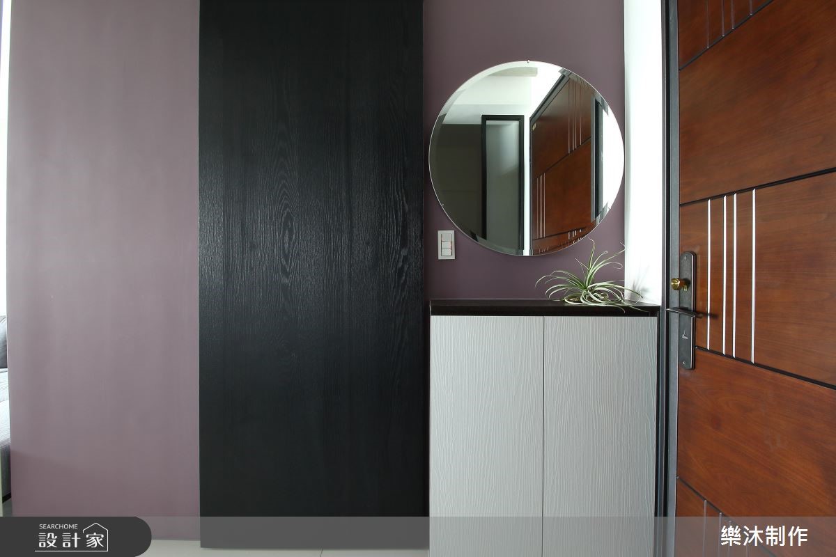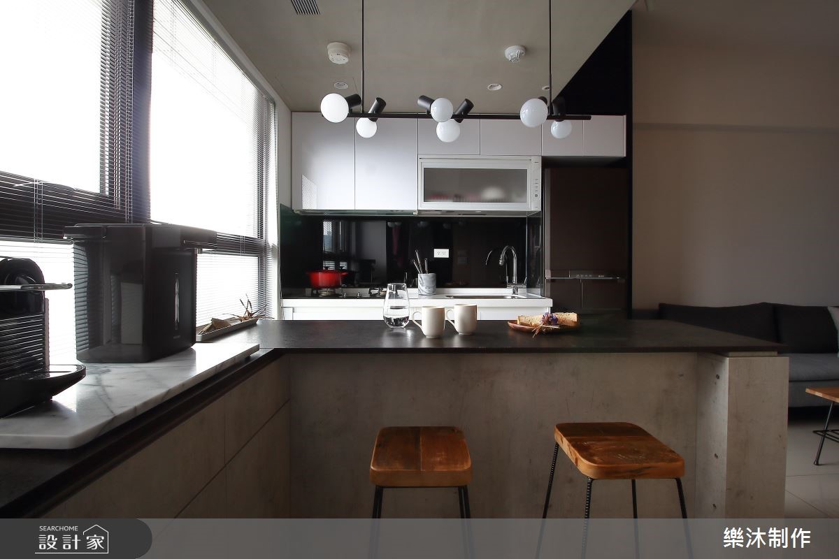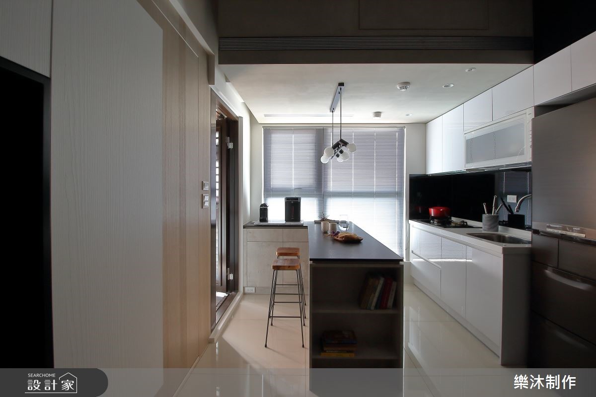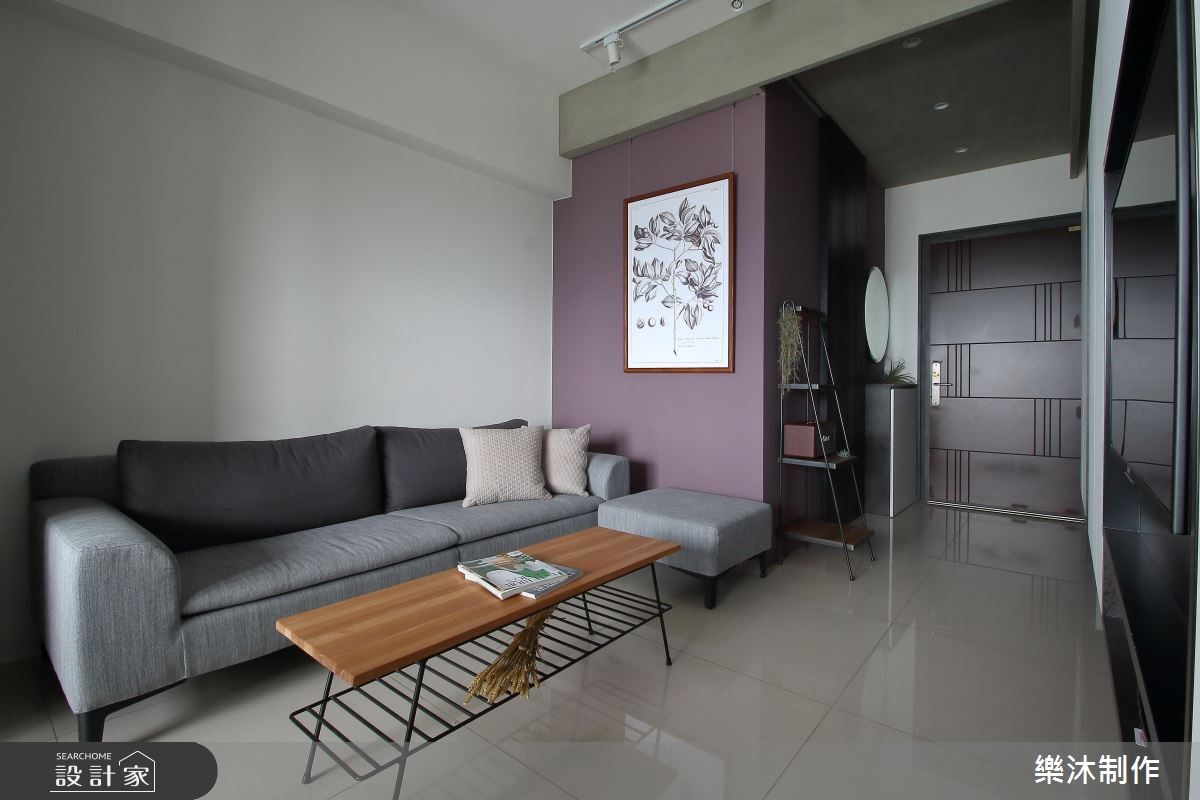 以白、灰色系为基底,调和满室朴实、简约感的现代风尚;设计师在有限的50平方米长形屋内,以开放格局为核心,引入充沛的户外暖阳,增添明亮、温暖感受。【清爽白色调,让空间视觉放大】旋开大门走进室内,紫色壁面悬挂镜子,搭配简约纹理的白色矮柜,注入写实的自然生气;并以黑色木作壁面界定内外领域,搭以阶梯造型的展示柜,可惬意的摆放绿意植栽或风格摆件,展现屋主独特的人文品味。大门左侧以悬空的白色柜体打造鞋柜,并向内延伸转化为电视墙的一部分,墙体底部则以木纹肌理为底,替黑白绝对的视觉呈现,增添些许温暖气息;L型中岛与厨具平行摆设,落地窗的设计让阳光能走进照亮全室,简约朴实的材质堆叠,呈现惬意、自在的用餐氛围。