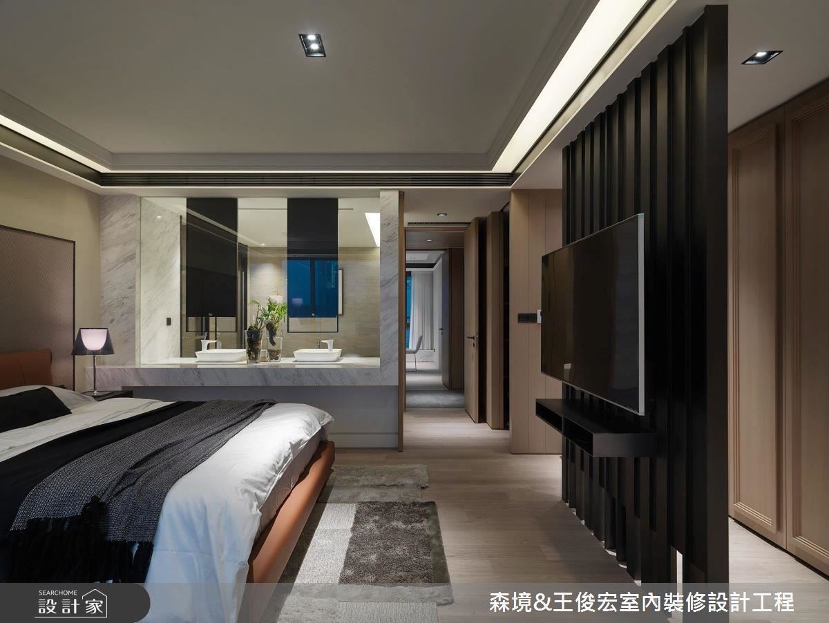 主卧同时容纳电视墙、更衣间和浴室,刻意将洗手台外移,不仅遮住淋浴房,也能兼具化妆台机能;并巧妙运用电视墙格栅区隔更衣间。每区皆无隔断,创造流畅的环状动线。