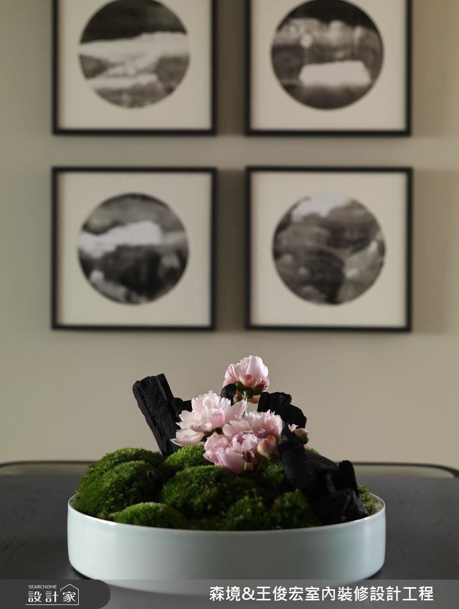 精心安排的花艺、画作,向来是森境设计团队着墨甚多的部分。以"方中有圆、圆中带方"的设计概念,运用画作、盆景串联空间,不凿痕迹的安排,让生活品味随之大幅提升。