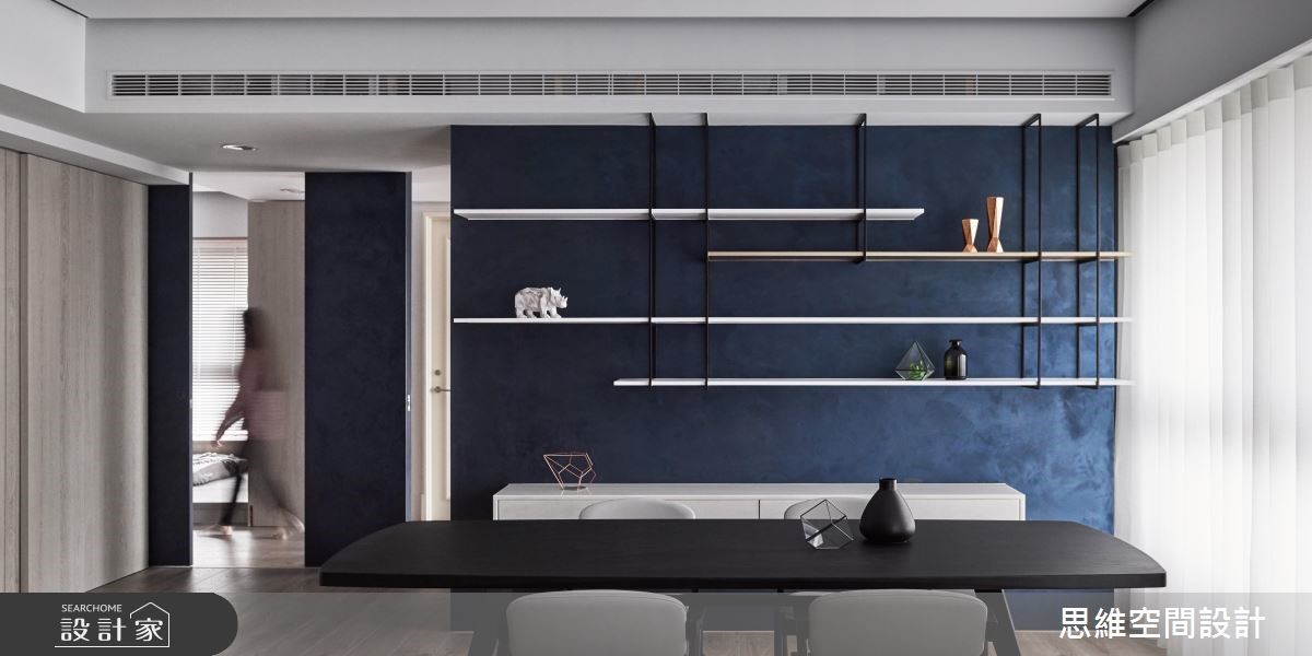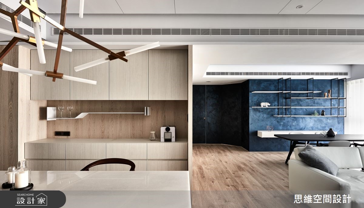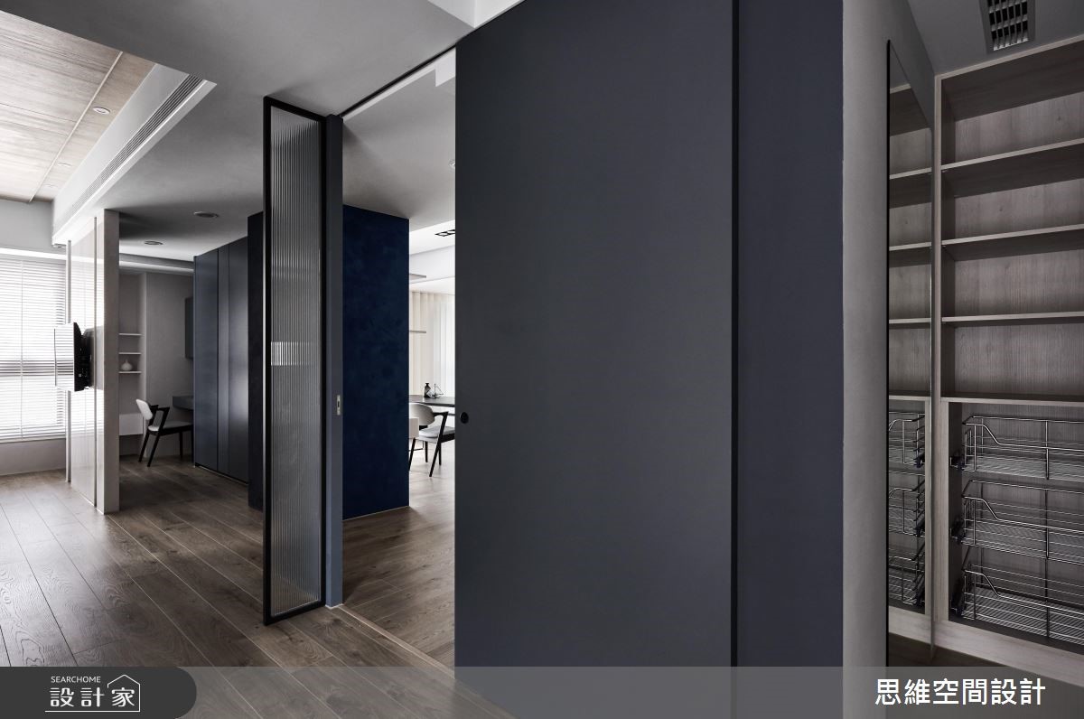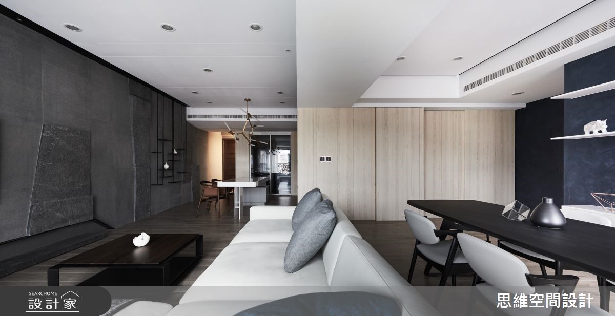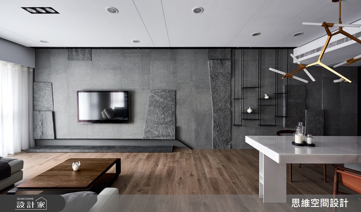 由于本案为屋主一家人的度假空间,因此并无过多收纳需求,期待以流畅的动线与大器风格为主。设计师打破公私领域界线,将空间一分为二,仅需一道隔断划分居家格局。 【拼接石材,造吸睛主墙】以"让关系更加紧密"的概念为主轴,设计师将隔断数量降至最低,除了仅利用一道钻石蓝特殊漆料主墙区隔公私领域。更打破隔断的坚固印象,改以折线门片分隔。可随心收折,让空间得以开放或封闭,保有使用弹性。由玄关延伸至电视主墙以石壁造型凸显现代风格,佐以不规则拼接的粗面石材创造大器氛围。公领域以直铺超耐磨木地板,为开放空间创造无限延伸的视觉感受,搭配大面积木皮壁面,为冷调色系增添温润自然的元素。私领域的两间卧房运用可伸缩的推拉门区隔,打开时便让整体看起来通透宽敞。而特别的是,主卧与更衣间以口字设计,环绕的动线让进出更方便,也让光源得以顺势进入室内各处。