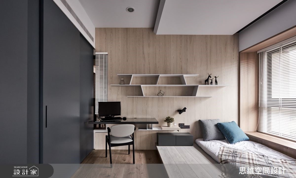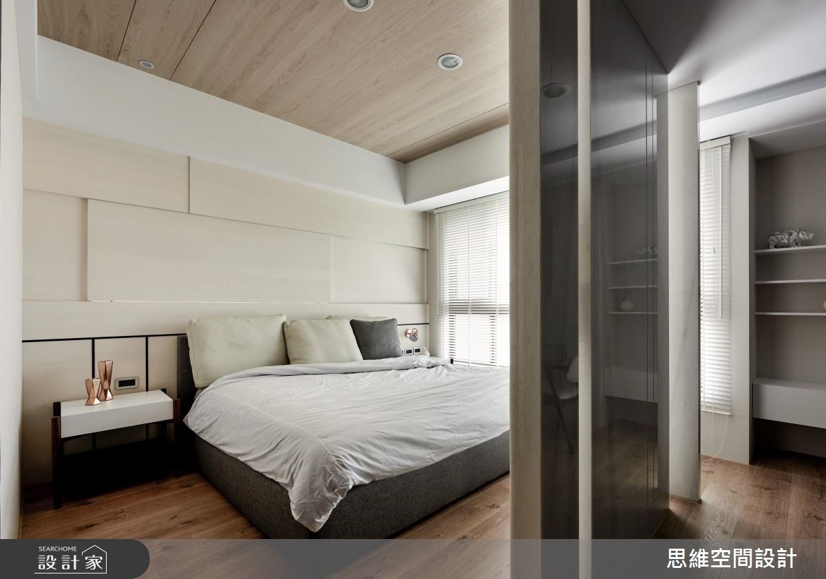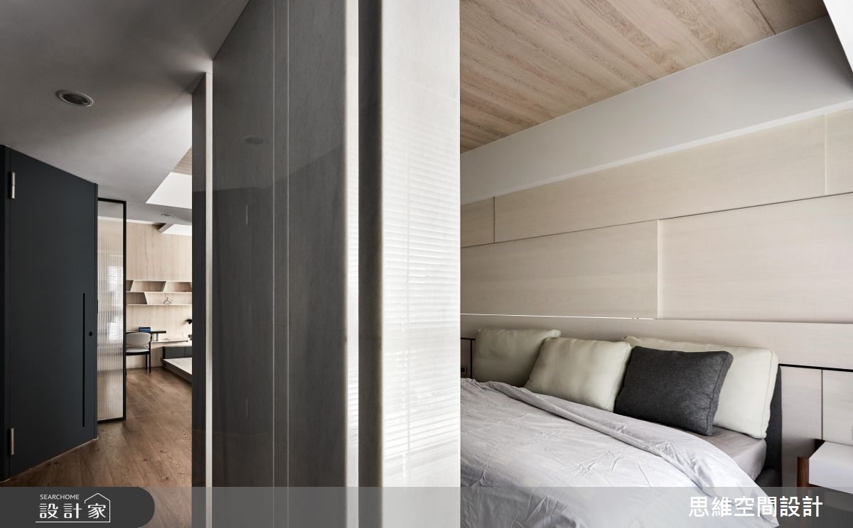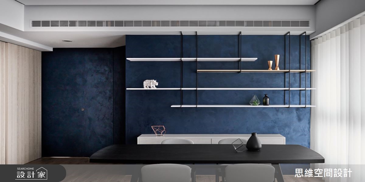 由于本案为屋主一家人的度假空间,因此并无过多收纳需求,期待以流畅的动线与大器风格为主。设计师打破公私领域界线,将空间一分为二,仅需一道隔断划分居家格局。 【拼接石材,造吸睛主墙】以"让关系更加紧密"的概念为主轴,设计师将隔断数量降至最低,除了仅利用一道钻石蓝特殊漆料主墙区隔公私领域。更打破隔断的坚固印象,改以折线门片分隔。可随心收折,让空间得以开放或封闭,保有使用弹性。由玄关延伸至电视主墙以石壁造型凸显现代风格,佐以不规则拼接的粗面石材创造大器氛围。公领域以直铺超耐磨木地板,为开放空间创造无限延伸的视觉感受,搭配大面积木皮壁面,为冷调色系增添温润自然的元素。私领域的两间卧房运用可伸缩的推拉门区隔,打开时便让整体看起来通透宽敞。而特别的是,主卧与更衣间以口字设计,环绕的动线让进出更方便,也让光源得以顺势进入室内各处。