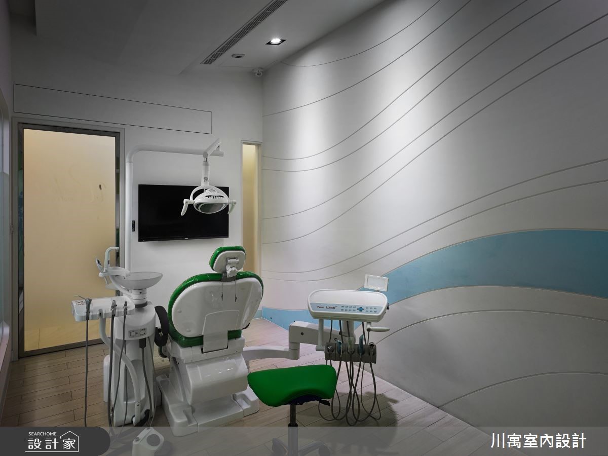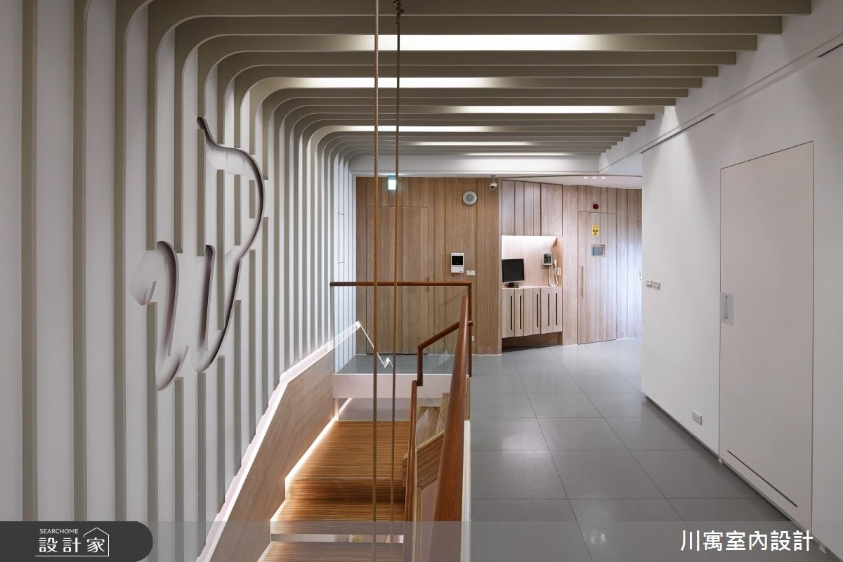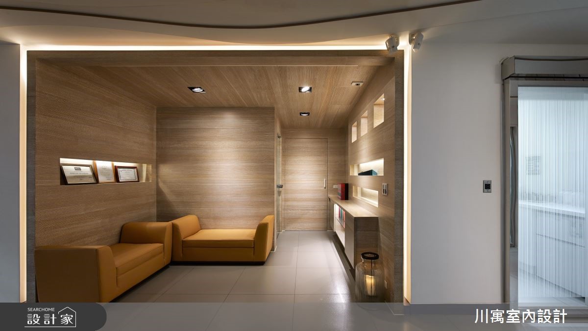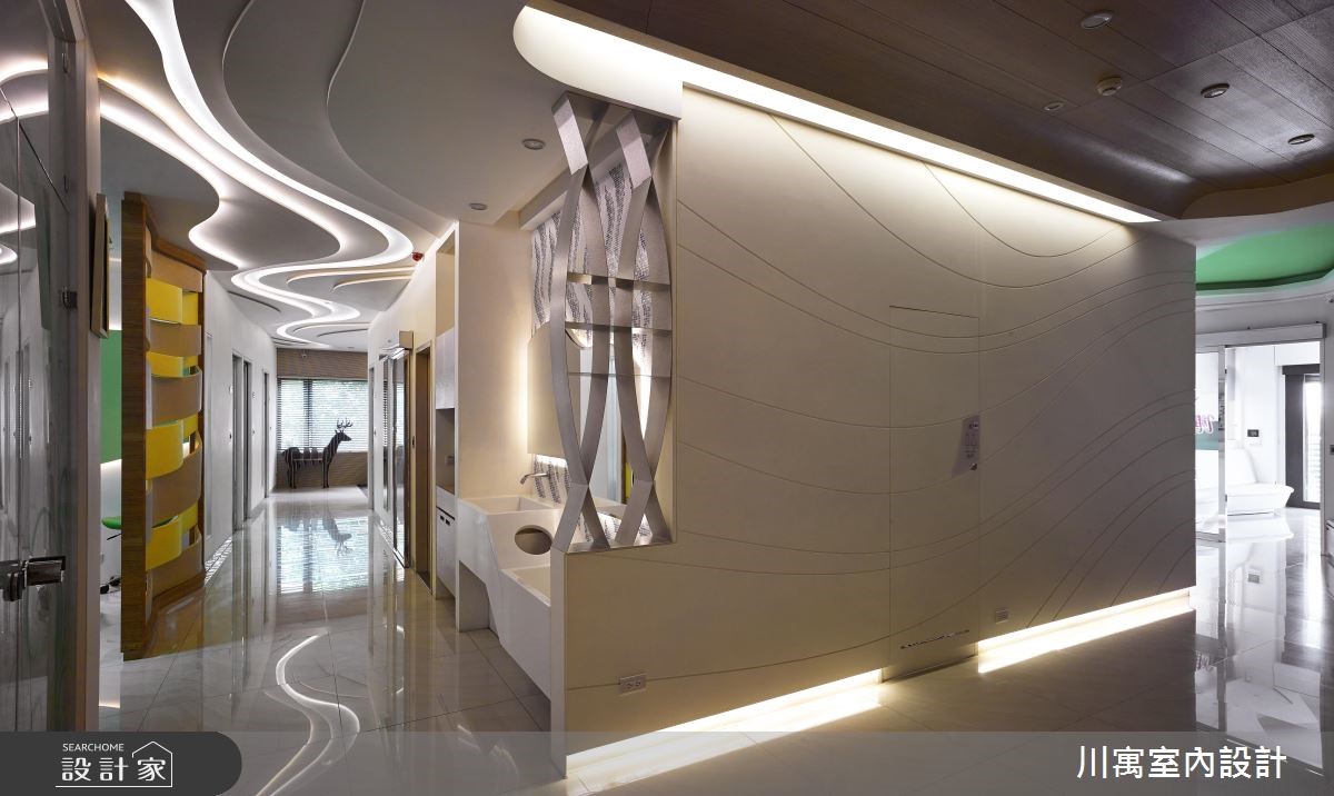 藉由现代感的设计风格,营造纾压的看牙环境,扭转牙医诊所带给人的恐惧感受。并以间接光源酝酿安心的空间氛围,加上柔和色系的搭配,随着流线型线条游走一室,透过细腻的设计手法,让你我体会被呵护的贴心感受。【线条意象,串联动线与空间】进入诊所,沿着白色壁面的波浪状沟缝前进,在壁面中央设计一道化妆室的隐藏门,推开后狂野的斑马纹意象映入眼帘,时尚的线条呈现,让人忘却在牙医诊所里;洗手台则设计于廊道侧边,马赛克砖结合流线型的镜面,展现新颖的风格。顺着温润的木纹阶梯来到二楼,立体造型壁面向上延伸至天花板,廊道上流线型的天花板造型持续蔓延,导引着人们走进各个领域,大量的木纹材质铺陈壁面、柜体与休息区,诠释温暖舒适的空间氛围,让人能够更自在、放松地看牙。