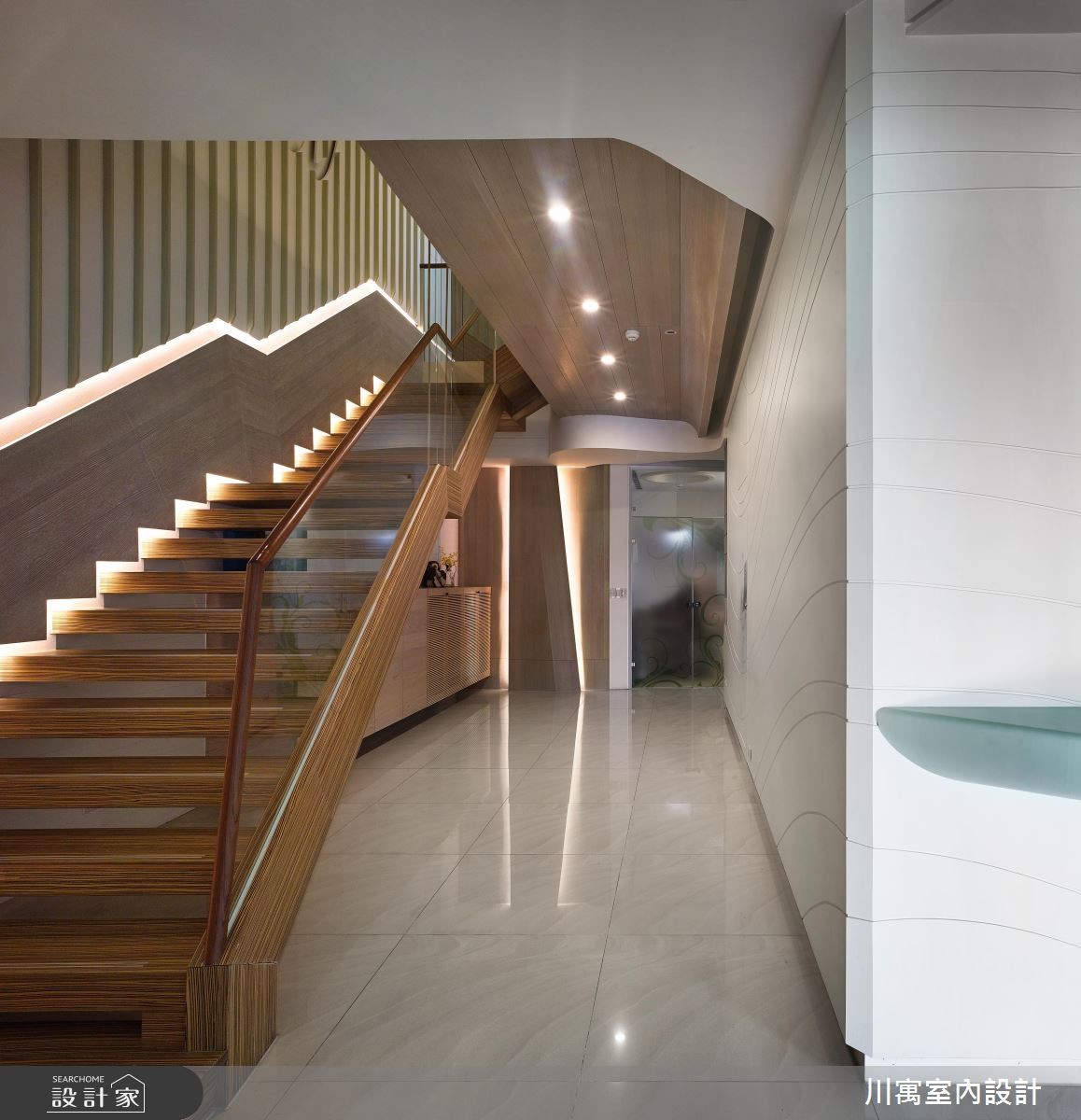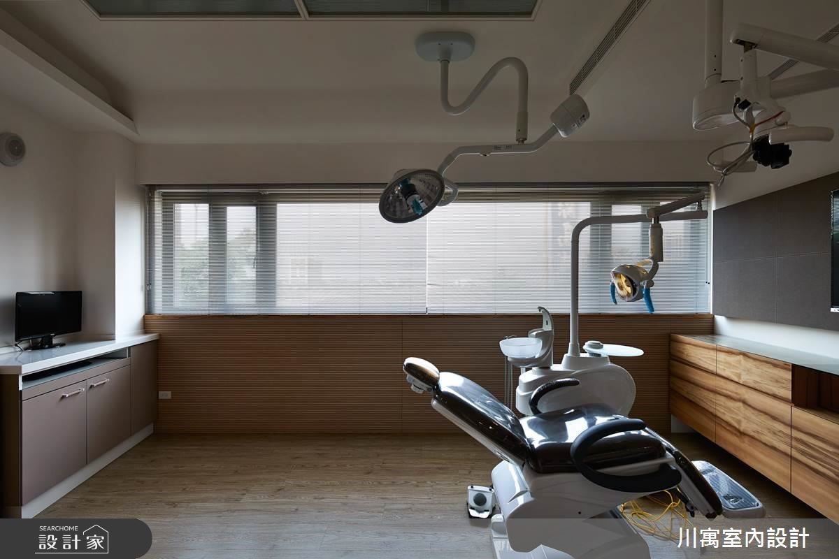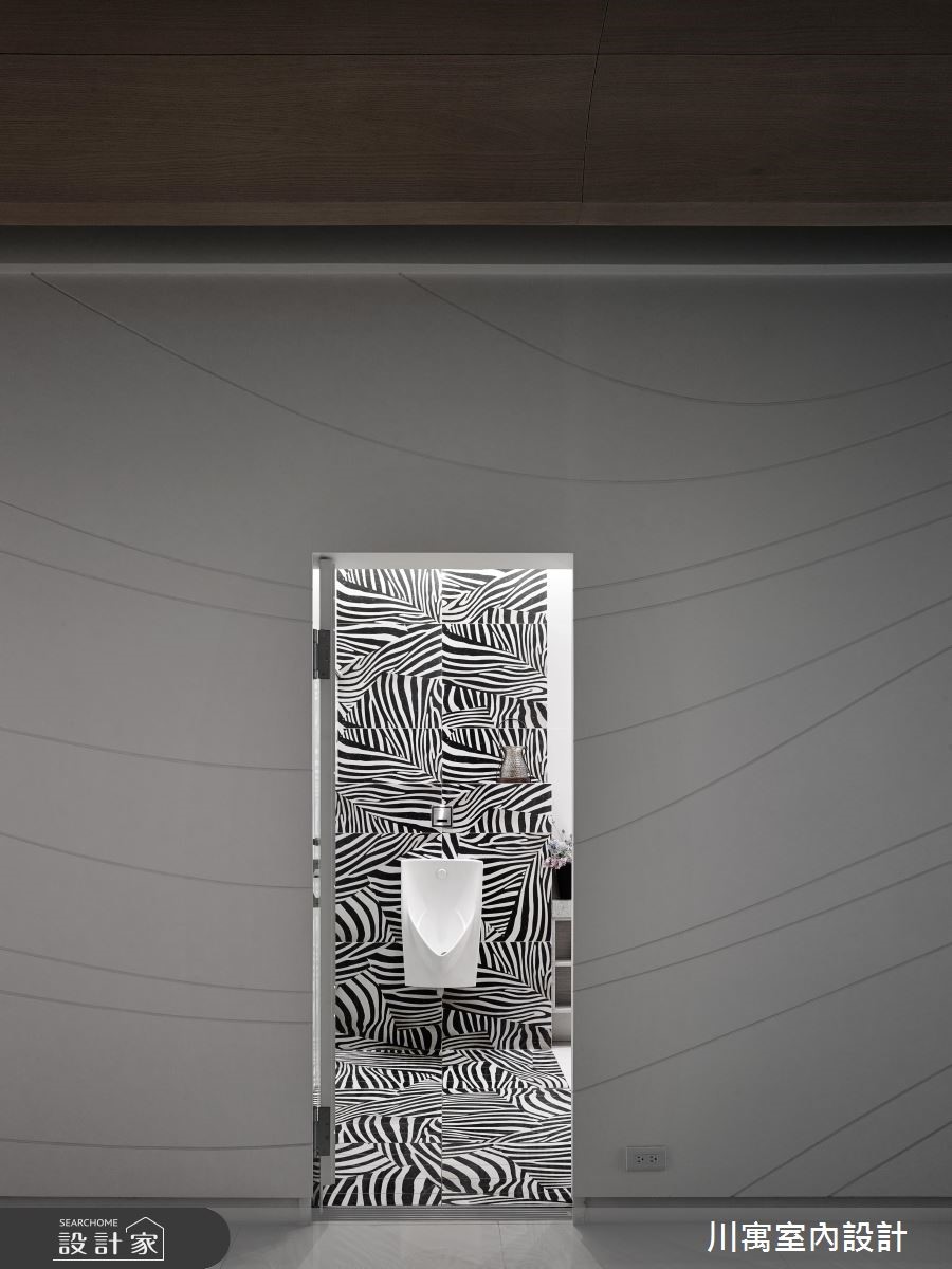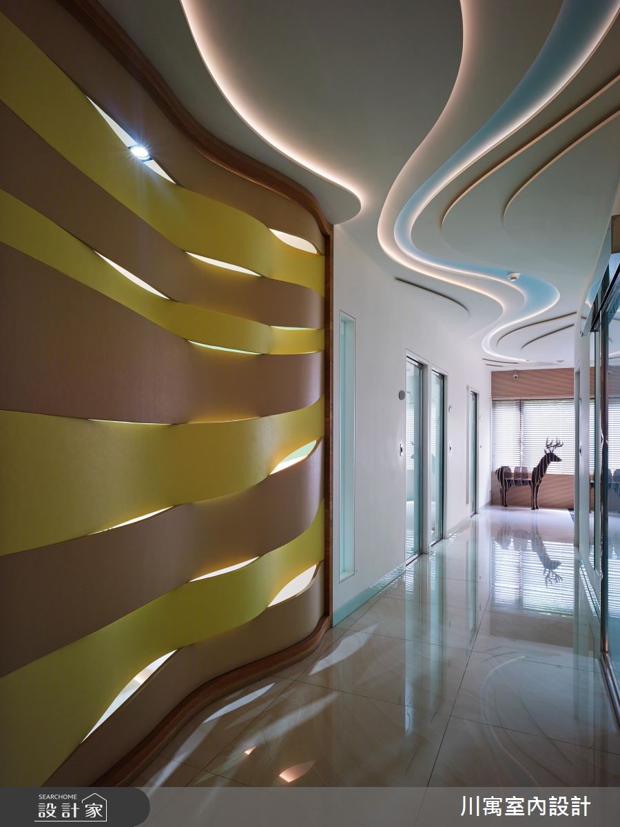 藉由现代感的设计风格,营造纾压的看牙环境,扭转牙医诊所带给人的恐惧感受。并以间接光源酝酿安心的空间氛围,加上柔和色系的搭配,随着流线型线条游走一室,透过细腻的设计手法,让你我体会被呵护的贴心感受。【线条意象,串联动线与空间】进入诊所,沿着白色壁面的波浪状沟缝前进,在壁面中央设计一道化妆室的隐藏门,推开后狂野的斑马纹意象映入眼帘,时尚的线条呈现,让人忘却在牙医诊所里;洗手台则设计于廊道侧边,马赛克砖结合流线型的镜面,展现新颖的风格。顺着温润的木纹阶梯来到二楼,立体造型壁面向上延伸至天花板,廊道上流线型的天花板造型持续蔓延,导引着人们走进各个领域,大量的木纹材质铺陈壁面、柜体与休息区,诠释温暖舒适的空间氛围,让人能够更自在、放松地看牙。