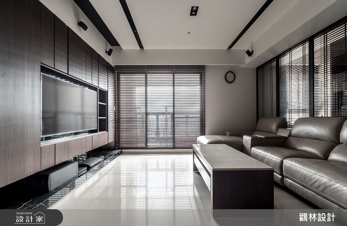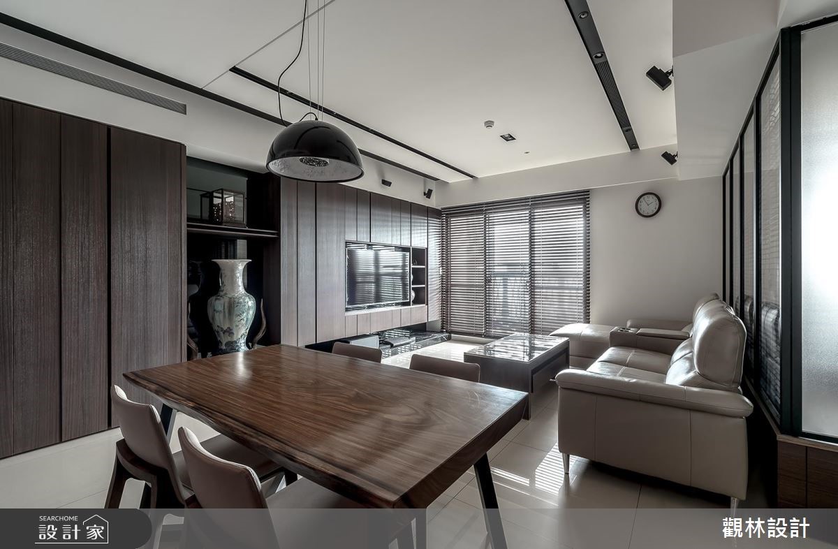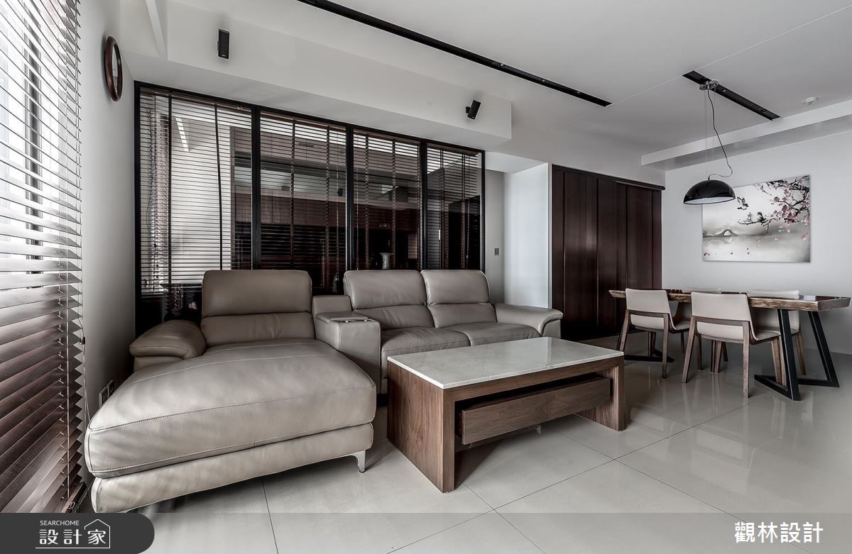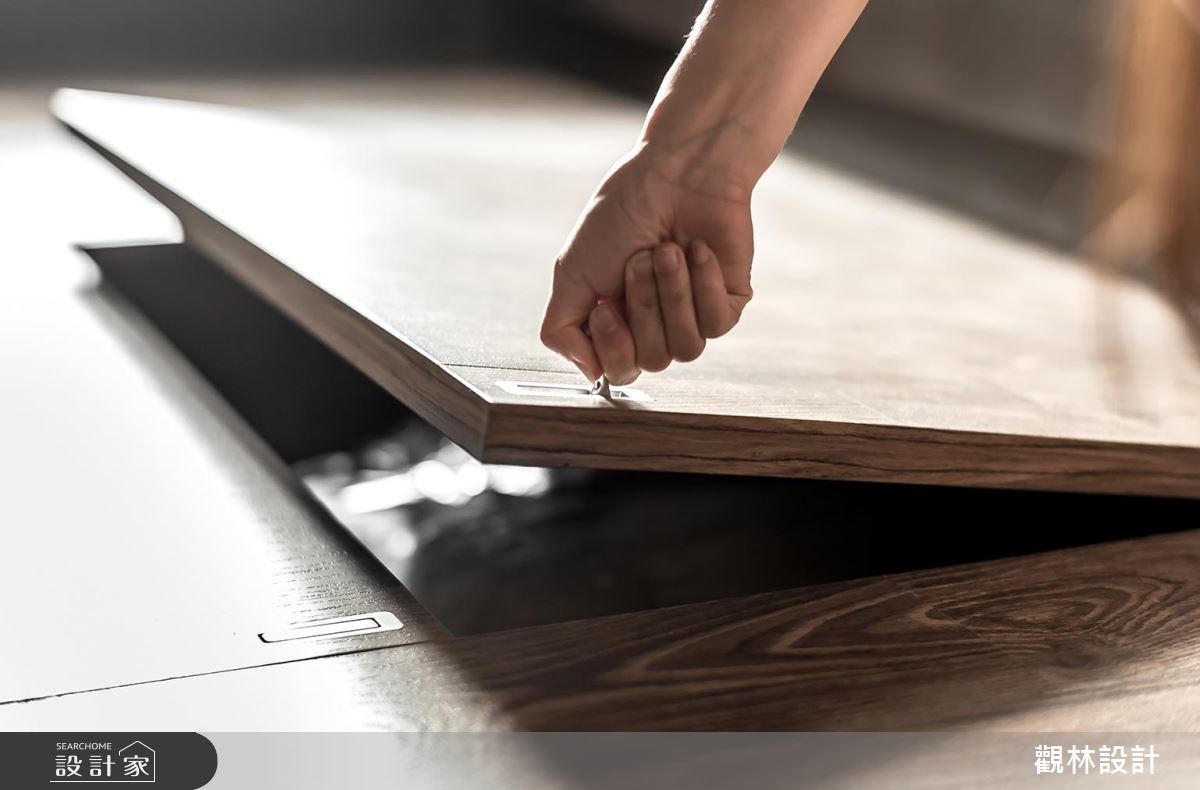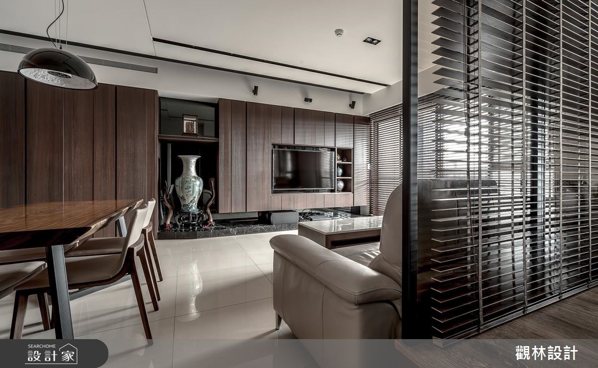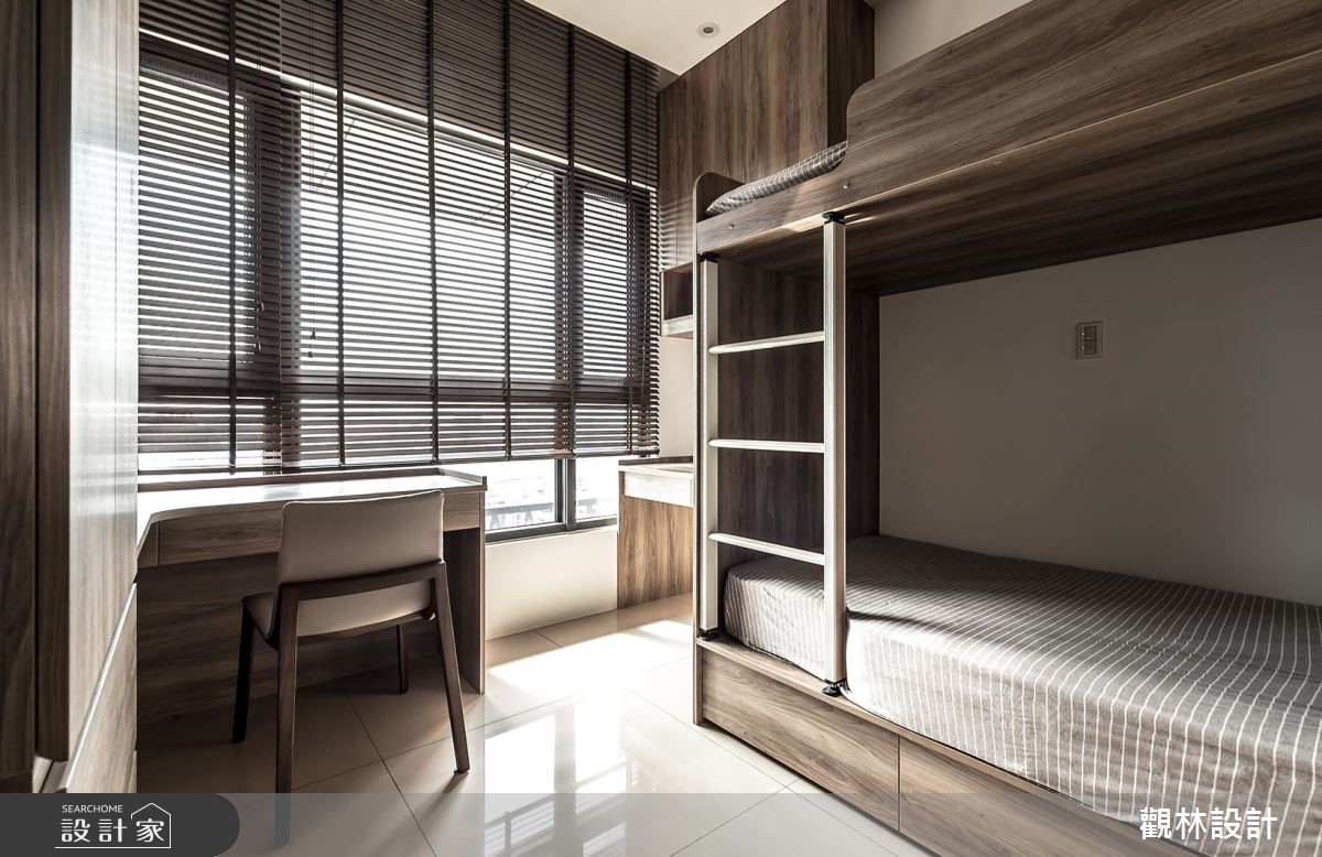 106平方米现代风住宅,设计师引用低调内敛的木纹,搭佐静谧的户外采光,同时融合屋主收藏的东方风摆饰品,让机能结合美韵,落实简约且充满人文况味的生活愿景。【以利落线条与立面框塑居家】厅区主墙运用深色木皮加以铺陈,串起玄关鞋柜与电视墙柜体,挹注丰富的收纳机能,中段则置放大型瓷器聚焦视觉,点出场域的设计亮点,再藉由木质百叶帘导入美好光影,陈列灰阶与象牙色的素朴家具,谱出恬淡柔和的氛围。沙发后方被规划为书房场域,以清玻串接视线,衍生通透放大的空间感;书房内则架高木地板,地面做出上掀式柜面,透过隐藏式的聪明规划,落实清爽不杂乱的收纳型式。【专属居住者的简约人文风采】私领域延续简约的质地,采用深色系的木质系统柜,一并打造床架、书柜与衣柜等,并加入一体成型的上下铺设计,发挥寝卧内的每一吋可用空间。