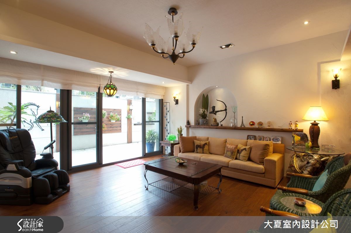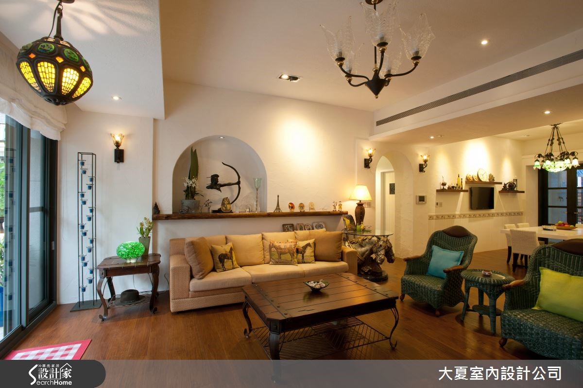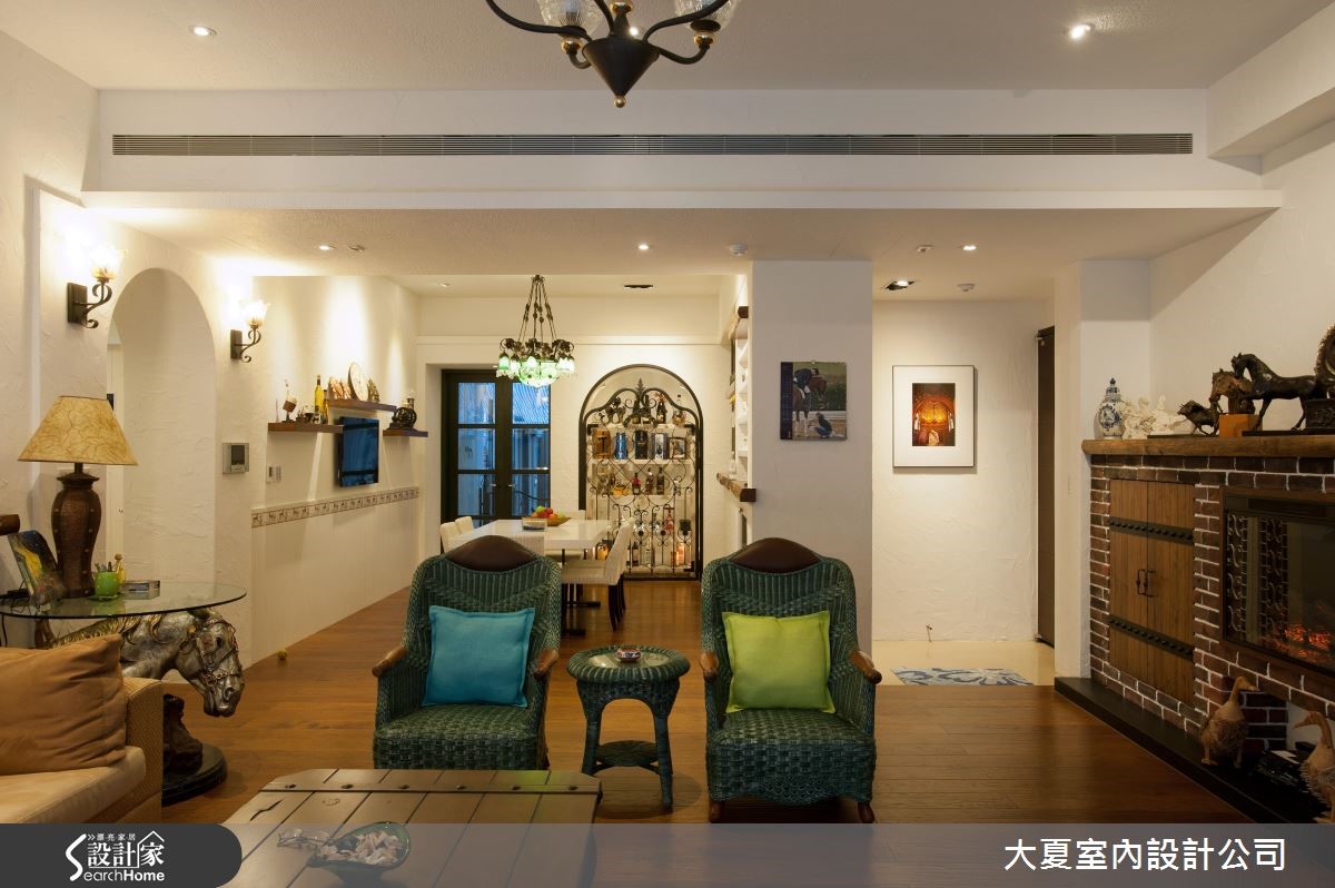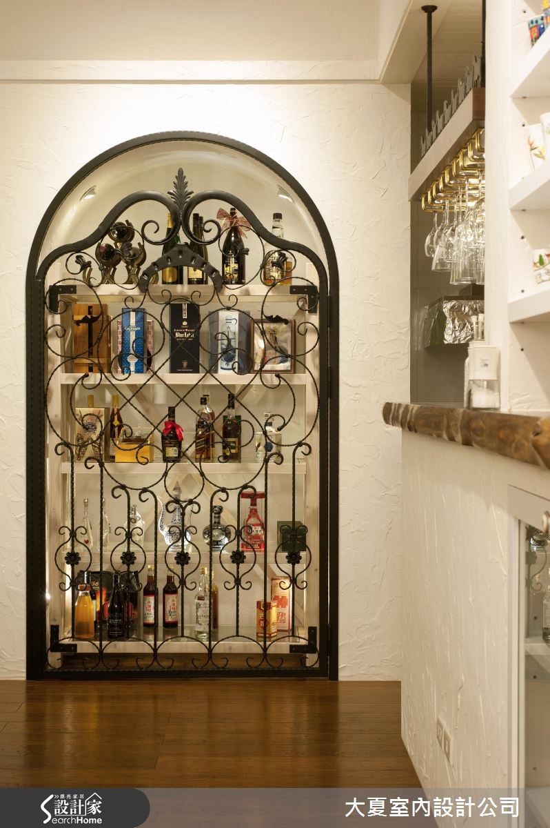 由于女屋主擅长马术,迷恋与马相关的人文艺术,居家生活里还有与五只黄金猎犬相伴。具有如此独特的品味,设计师特别以庄园风格来描绘居家空间,且利用骏马的元素游走一室,激荡出自由、奔放的氛围。【动物雕塑点缀,活络居家特色】敞开大门,先来到户外花园,扶疏的树木加上不同品种的花卉、植栽点缀其中,展现绿意盎然的景致;另一侧的墙面则以铁件勾勒出马匹造型,挹注奔放的原生意象。室内以白色为基底,藉由温暖的木纹铺陈地坪,壁灯与间接光源洒落在丰富的风格饰品上,鲜明的色彩与纹理交织美学元素,且将艺术灵感布满整个空间。电视墙以红砖墙为核心,结合壁炉与马厩门的意象,平台摆设动物雕塑、铁艺马匹与印地安的元素,融合生动的文化之美。各类饰品同样堆叠出独特的餐厨空间,墙面以木作层板设计,风格摆饰或器皿展示其中。另一侧则创造出马克杯的展示收纳,底座延伸至吧台空间,垂挂酒杯的吊柜上缘以马型花边点缀,呼应骏马元素。转角墙面则以镂空铁艺雕花为门扇,营造出欧风十足的酒柜收纳。