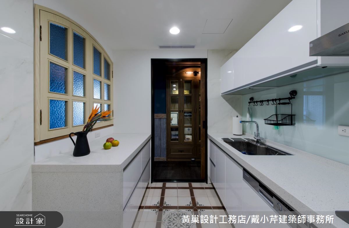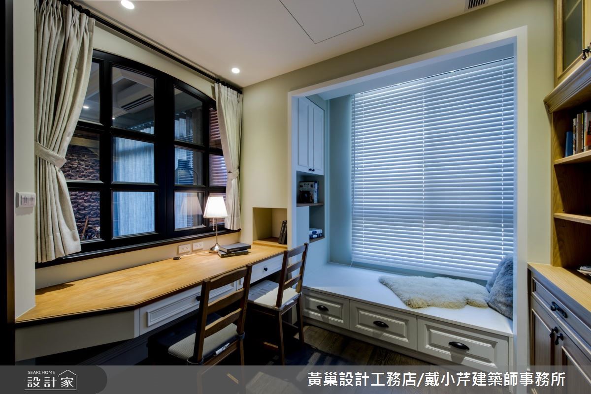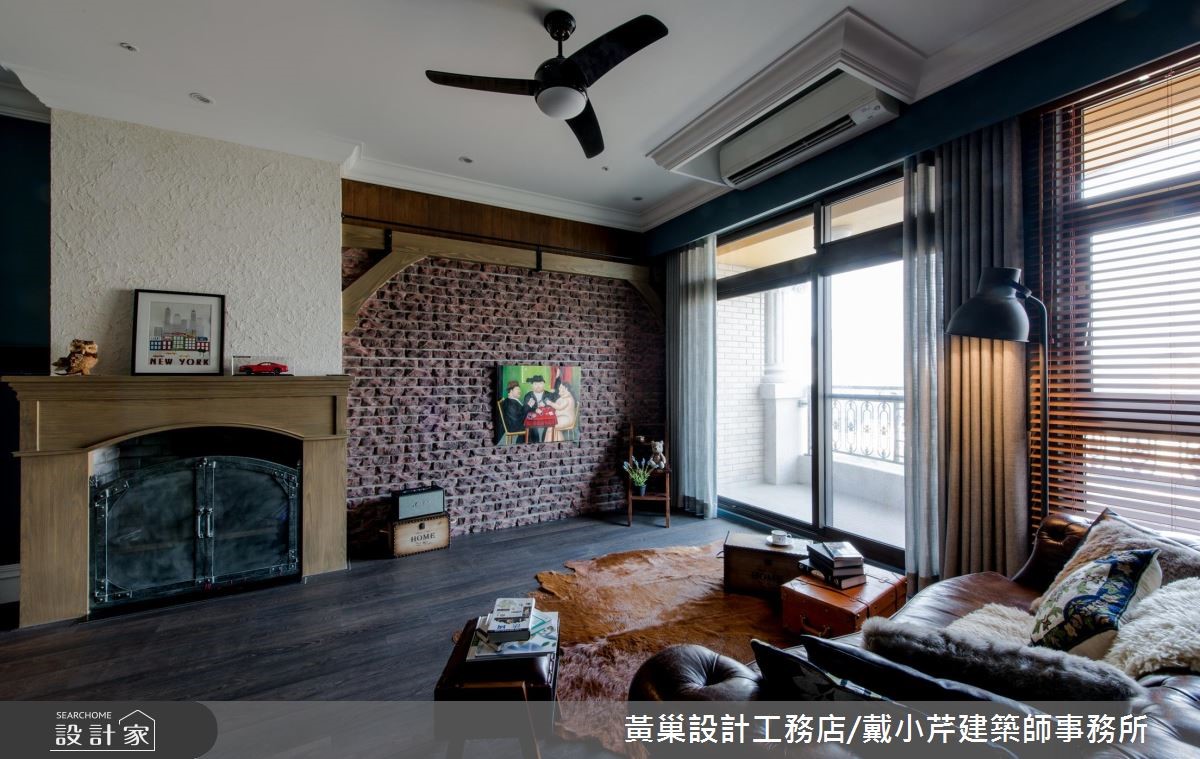 这间132平米的空间,是设计团队从客变(客户变更;建设公司在施工阶段依照屋主需求,预先提供变更格局、设备等服务)开始与屋主合作,混搭了城市蓝调与西部酒馆氛围,为一家四口打造富有自然粗犷气息的美式风格。 【深色调、立体建材,造沉稳氛围】重新规划整体格局,将公领域设定为开放通透,并提供每个家庭成员充裕的卧房空间,欢聚、隐私皆宜。设计师在色彩搭配方面,以沉稳饱和的黄色与蓝色搭配仿旧处理的柜体与木作,散发自然气息。 针对风格营造,主要采用带有立体触感的建材,地道的廊式玄关复古六角砖,与深色超耐磨地板做出区分。客厅主墙与餐厅壁柜则分别采用红砖面与灰阶文化石,搭配刷上特殊漆的壁炉造型墙,营造地道、质朴的美式风格。 挑选家具家饰,设计师以皮制沙发、毛皮地毡与带有经典卡布里桌脚的圆桌,增添精致细节。在走廊注入美式小酒馆的元素,包含格状落地窗与壁灯,让时空彷佛倒流。左右两侧分别独立为书房与厨房空间,同样蕴藏了百叶、推窗、飘窗、花砖等美式元素。