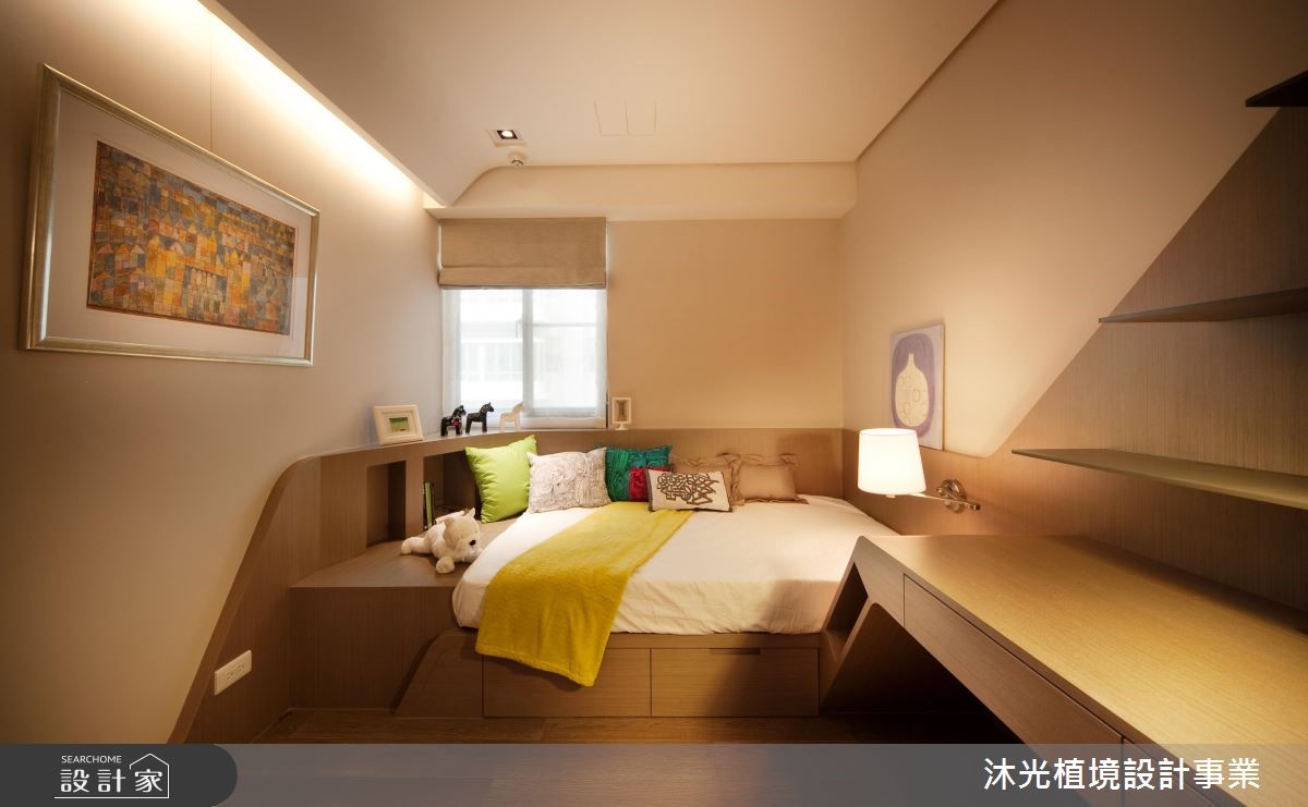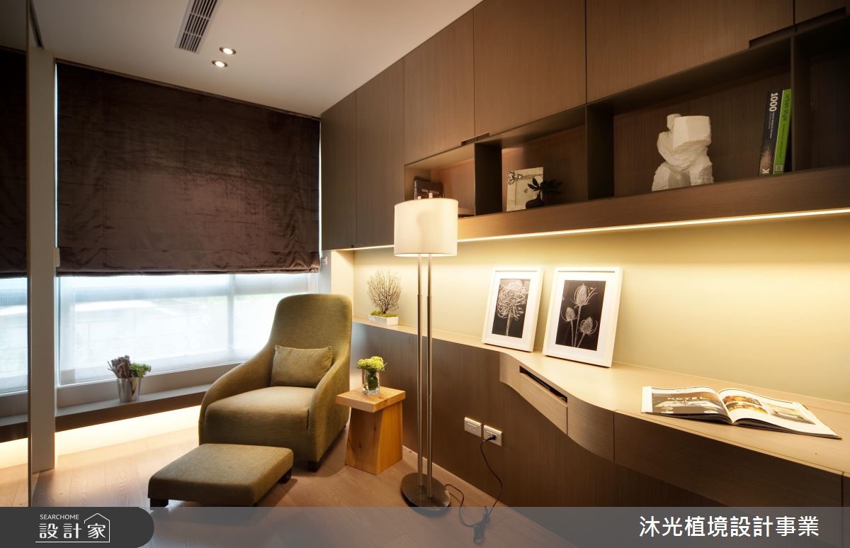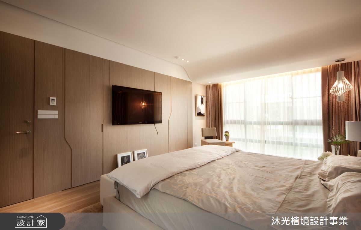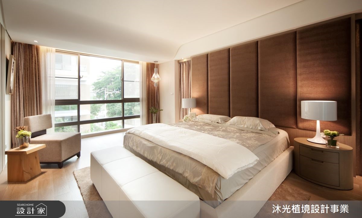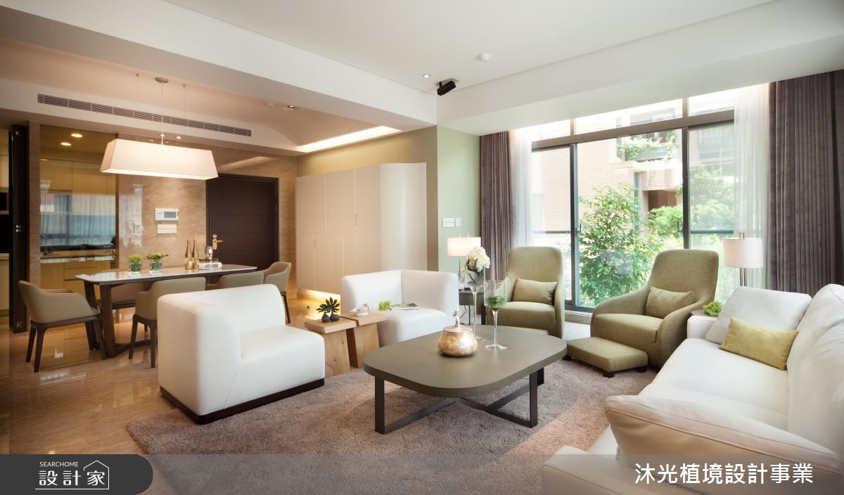 设计师以明亮、开放的设计手法塑造公共领域氛围,白色的结构天花板,搭配淡雅的家具色系,加上敞开的落地窗引入户外绿意与日光,内外皆景,调和出透亮、流动的空间气息。【清爽用色,为空间增添舒心感受】顺应喜爱现代风格的屋主夫妻,设计师融合简约舒适与有机自然,创造出动静相融的空间场域。客厅拥有双面大面窗,充沛的采光替室内营造舒心、宽敞之意,加上花卉、植栽的点缀,注入写实生气。餐厅领域延续简约的生活质感,并结合充足的柜体,扩充收纳机能,满足招待宴客以及家庭生活的功能;二楼为私领域,主卧以女屋主的想法出发,床头以绷布铺陈,增添些许华丽感,并另设独立化妆室,满足屋主日常所需。