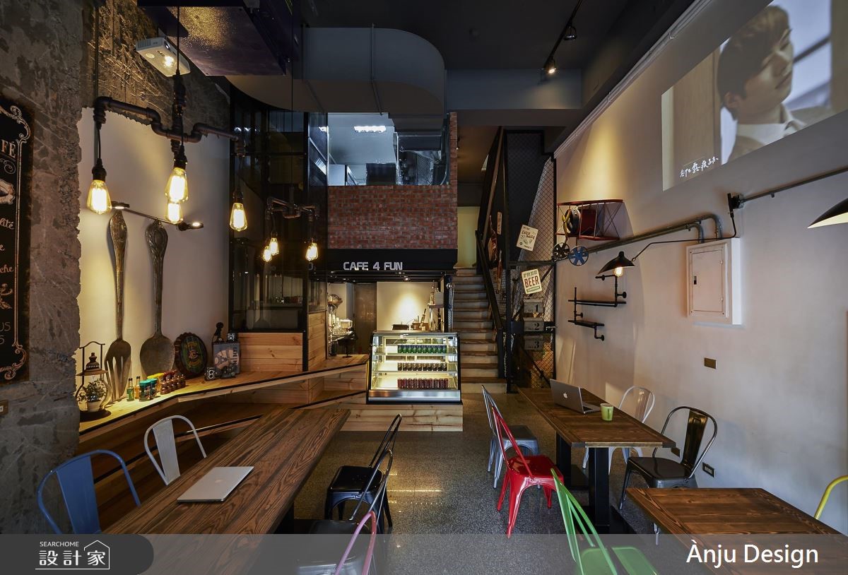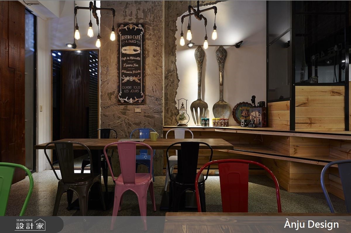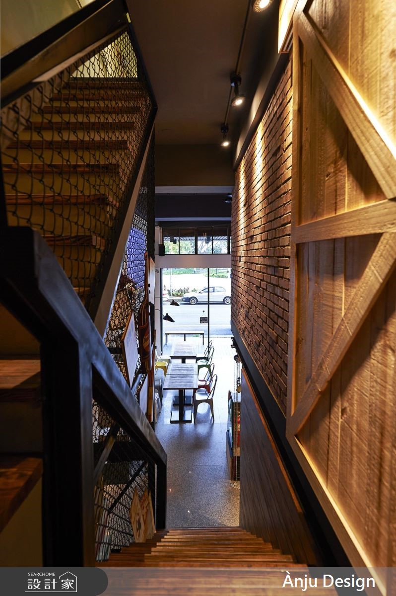 个性化十足的工业风,成为餐厅的风格走向,跳色椅子以及巨型汤匙的装饰,替重度基调的视觉,增添些许色彩与趣味,创造亲子间可放松、休憩的好去处。【风格摆件,妆点个性工业空间】大门以铁件框构玻璃材质,穿透感的特性让内外领域一目了然,更吸引路过的人们前往探究。不同造型的铁件吊灯垂挂在空间里,晕黄的光感映照在红砖、木纹与铁件上,搭配粗犷的水管造型,加上裸露的天花板视觉,特调出精湛的工业风神情。后方厨房区结合红砖墙与谷仓门造型,围塑出独立的风格场域,此元素更蔓延至一旁的阶梯空间,传递几分朴质韵味;而位于三楼的亲子区,则融入明亮缤纷的色系,创造出童趣十足的领域,并利用铁件灯、水管造型以及谷仓门,延续工业风精神。