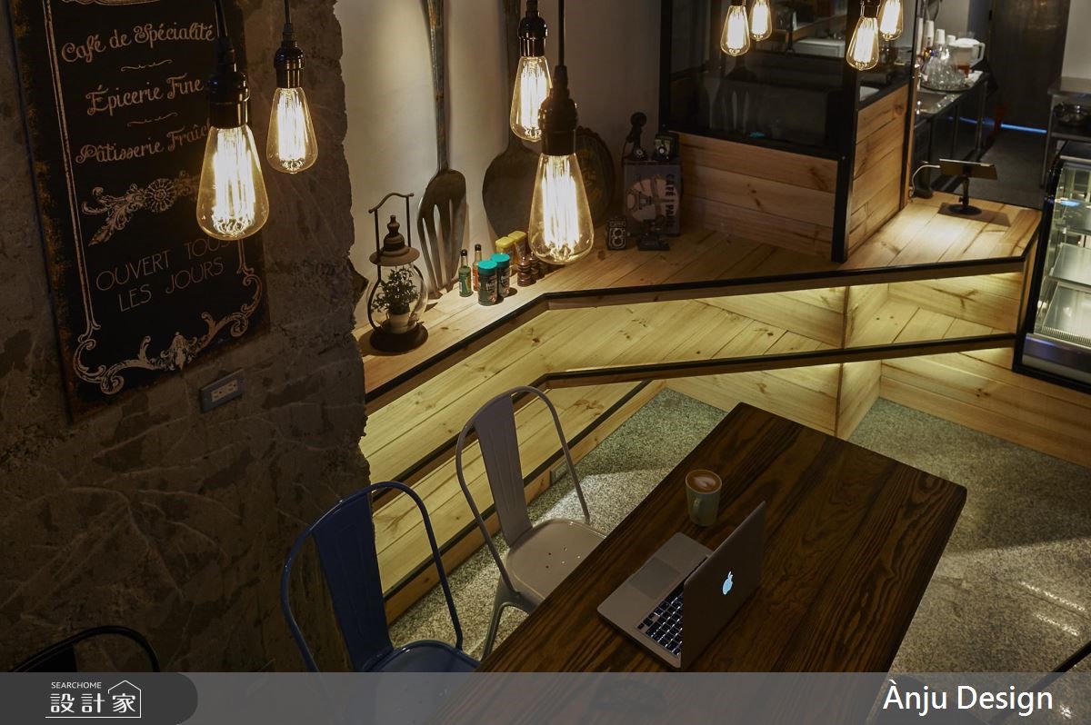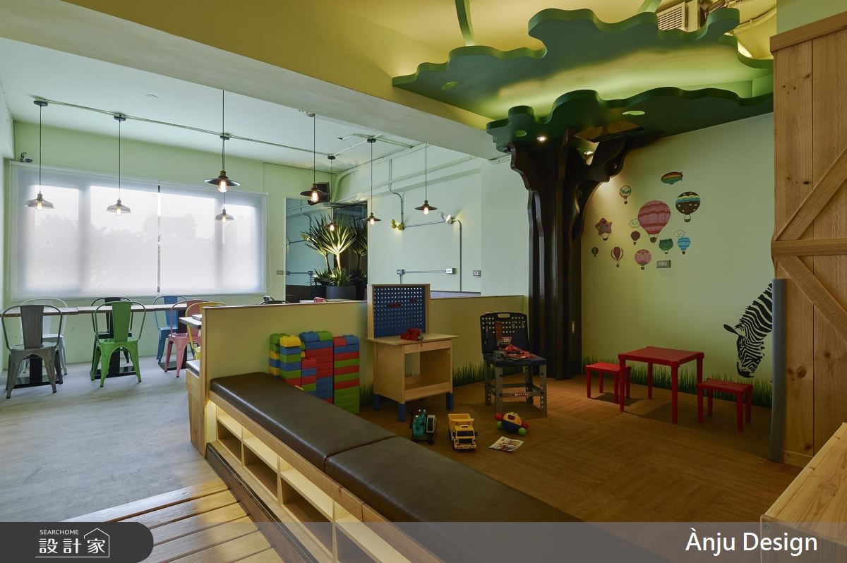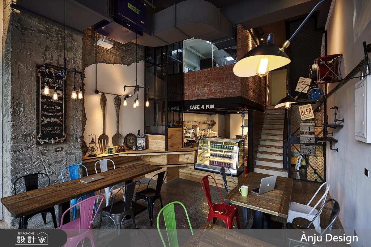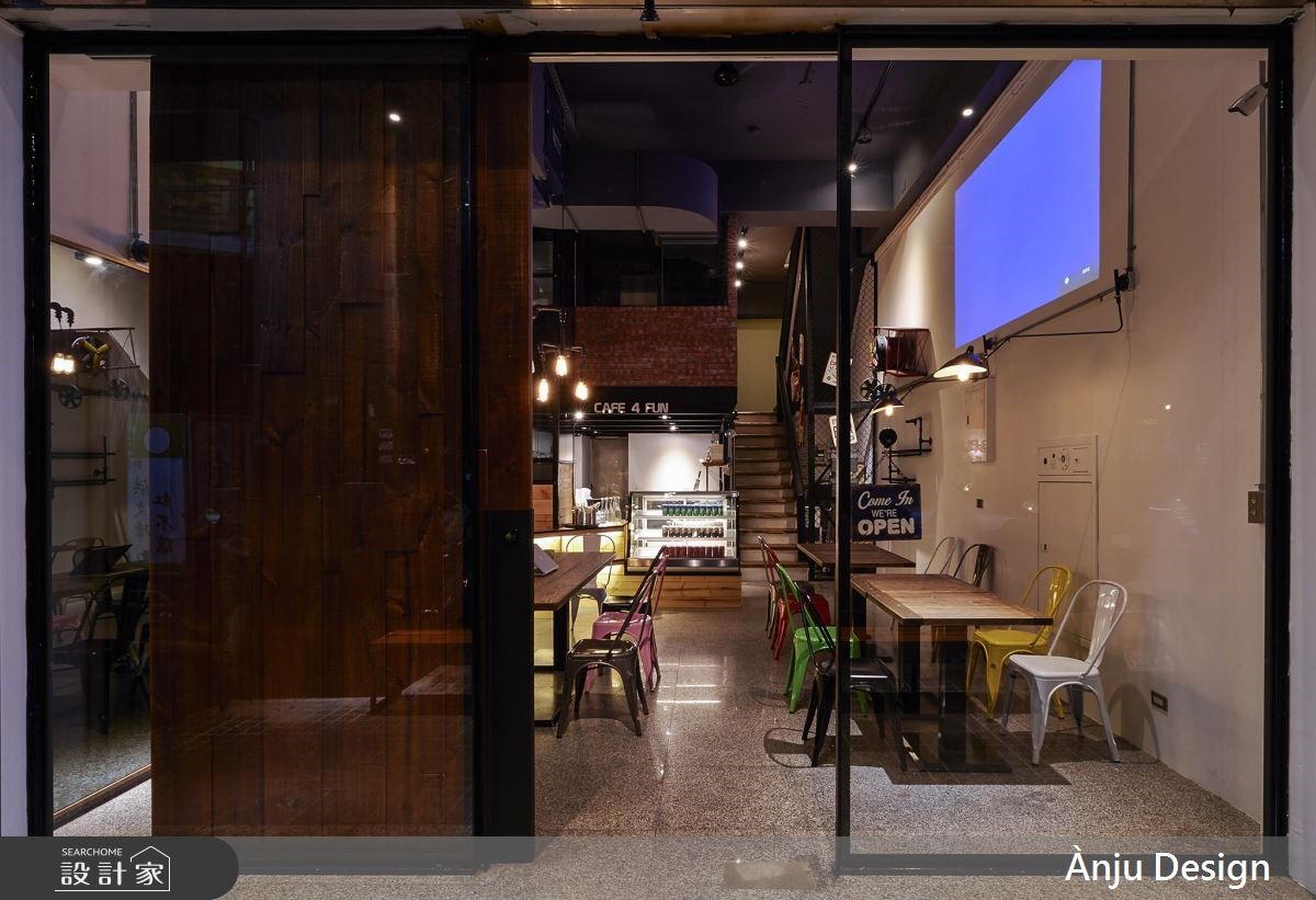 个性化十足的工业风,成为餐厅的风格走向,跳色椅子以及巨型汤匙的装饰,替重度基调的视觉,增添些许色彩与趣味,创造亲子间可放松、休憩的好去处。【风格摆件,妆点个性工业空间】大门以铁件框构玻璃材质,穿透感的特性让内外领域一目了然,更吸引路过的人们前往探究。不同造型的铁件吊灯垂挂在空间里,晕黄的光感映照在红砖、木纹与铁件上,搭配粗犷的水管造型,加上裸露的天花板视觉,特调出精湛的工业风神情。后方厨房区结合红砖墙与谷仓门造型,围塑出独立的风格场域,此元素更蔓延至一旁的阶梯空间,传递几分朴质韵味;而位于三楼的亲子区,则融入明亮缤纷的色系,创造出童趣十足的领域,并利用铁件灯、水管造型以及谷仓门,延续工业风精神。