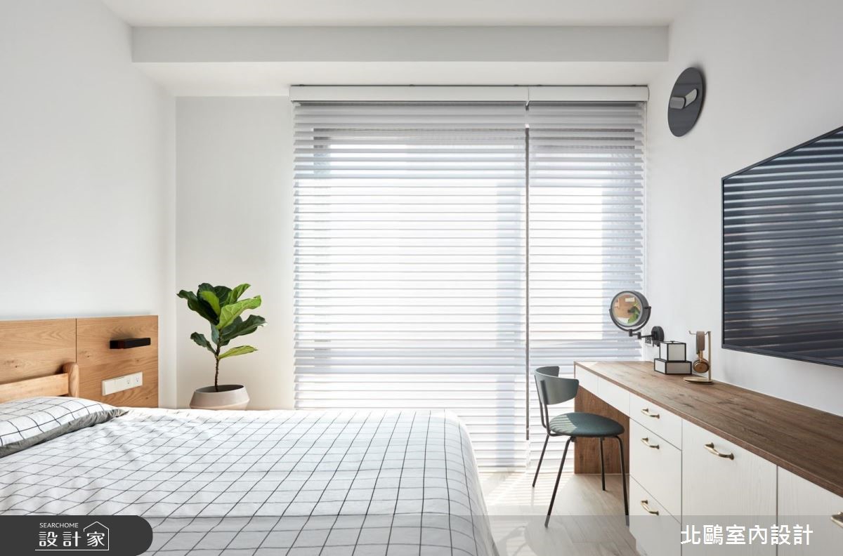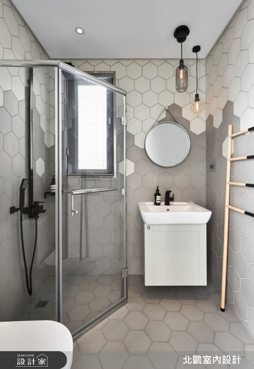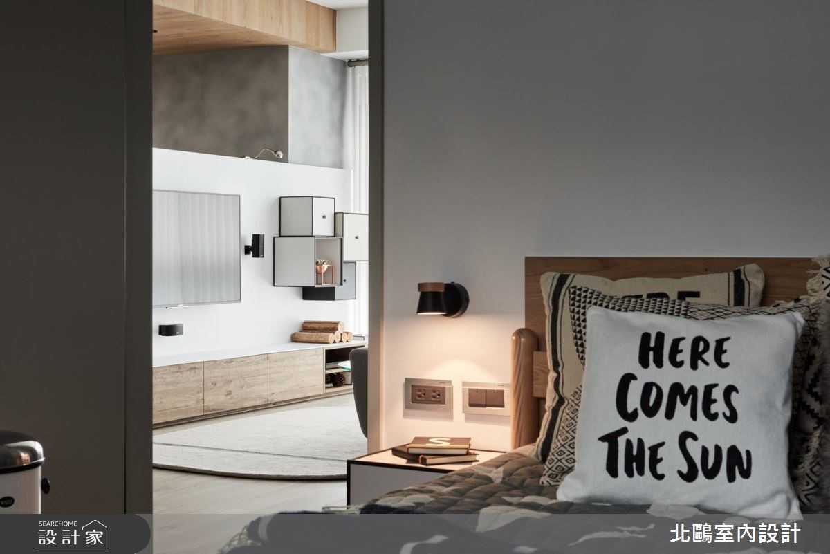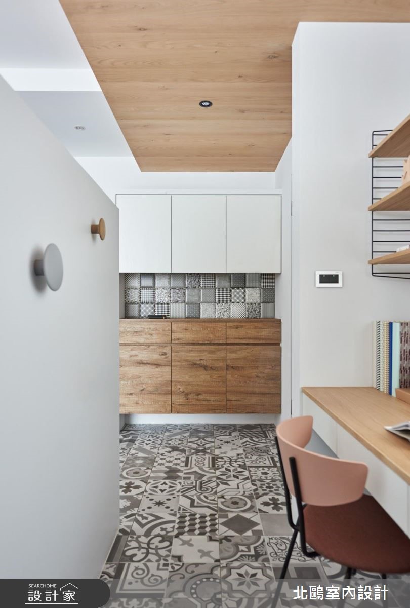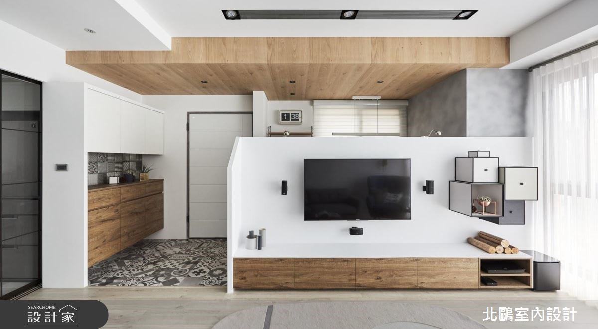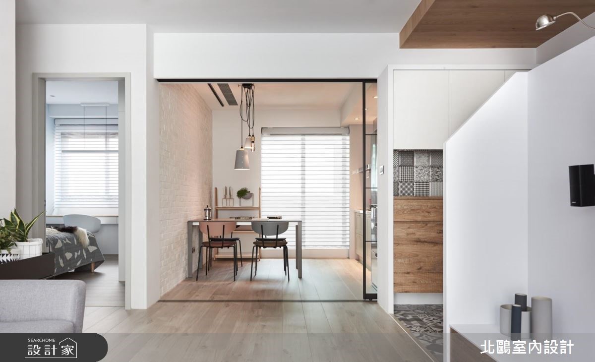 仅有85平方米空间的小户型,设计师透过通透隔断处理,将餐厅、厨房加以整并,替不大的空间挹注明亮敞阔感。同时大量的净白色系及造型家具型构北欧风格,乘载着小家庭的温馨生活。 【半高电视墙,便于光线流动】设计师运用区而不隔的半高电视墙,合宜的墙线高度,能促进客厅、小书房的光线与视线交流,并拥有明确的使用范围;同时采用木板及瓷砖不同材质铺陈,串起玄关和书房的动线。客厅与餐厨则在木地板串联之下,以一道通透的清玻移门营造开放视野,并让厨房与餐厅整合为一,打造充满互动感的完整膳食领域。卧室内则以木质素材作为基础,简单朴素;卫浴采用同款不同色的六角砖进行拼贴,创造出趣味十足的画面。