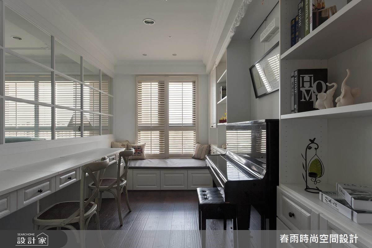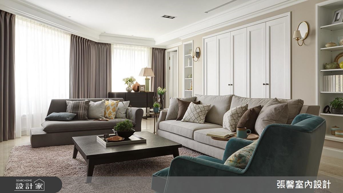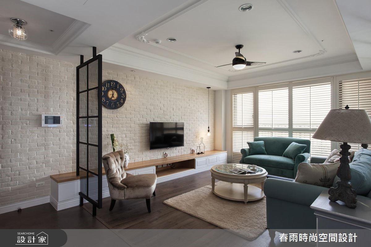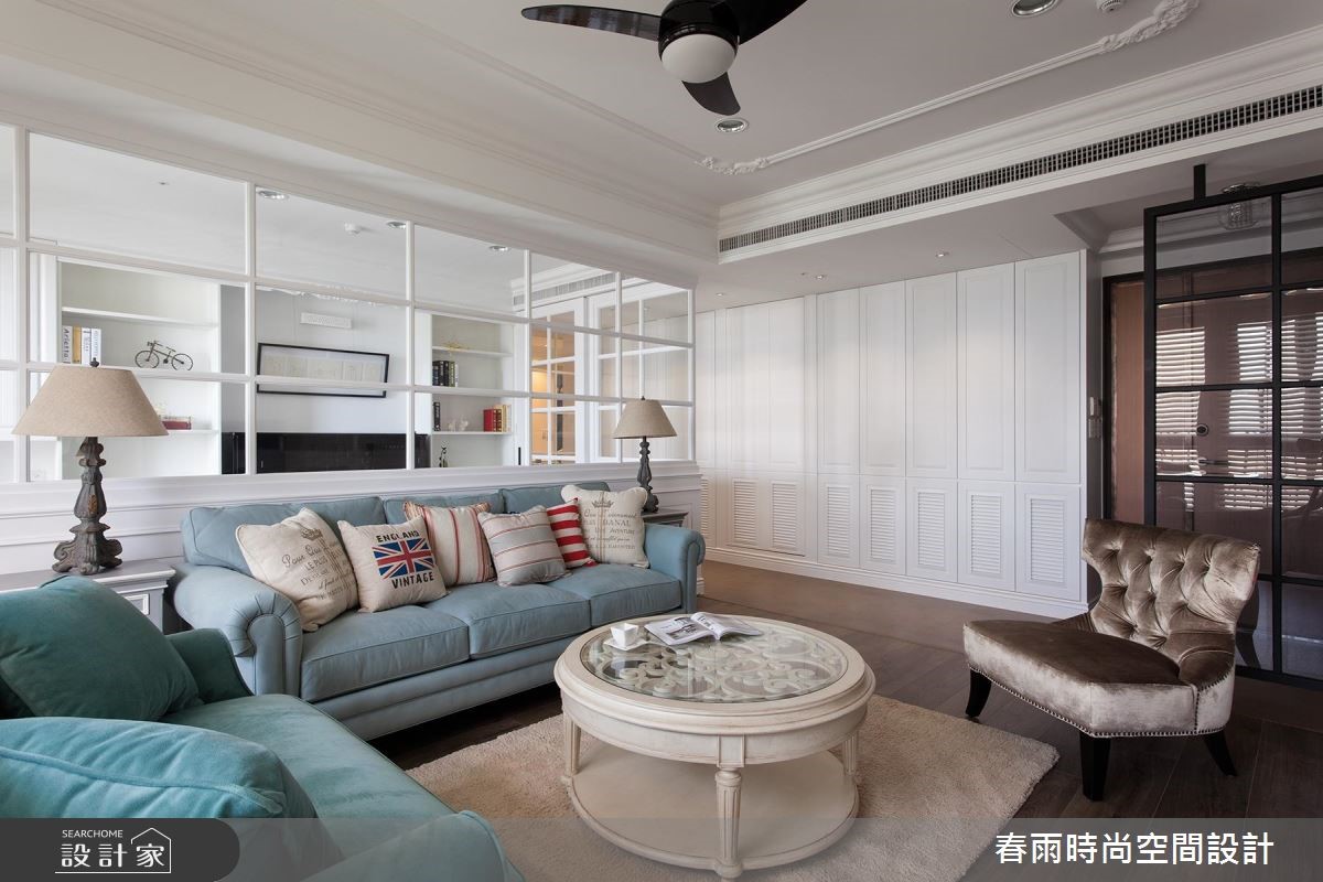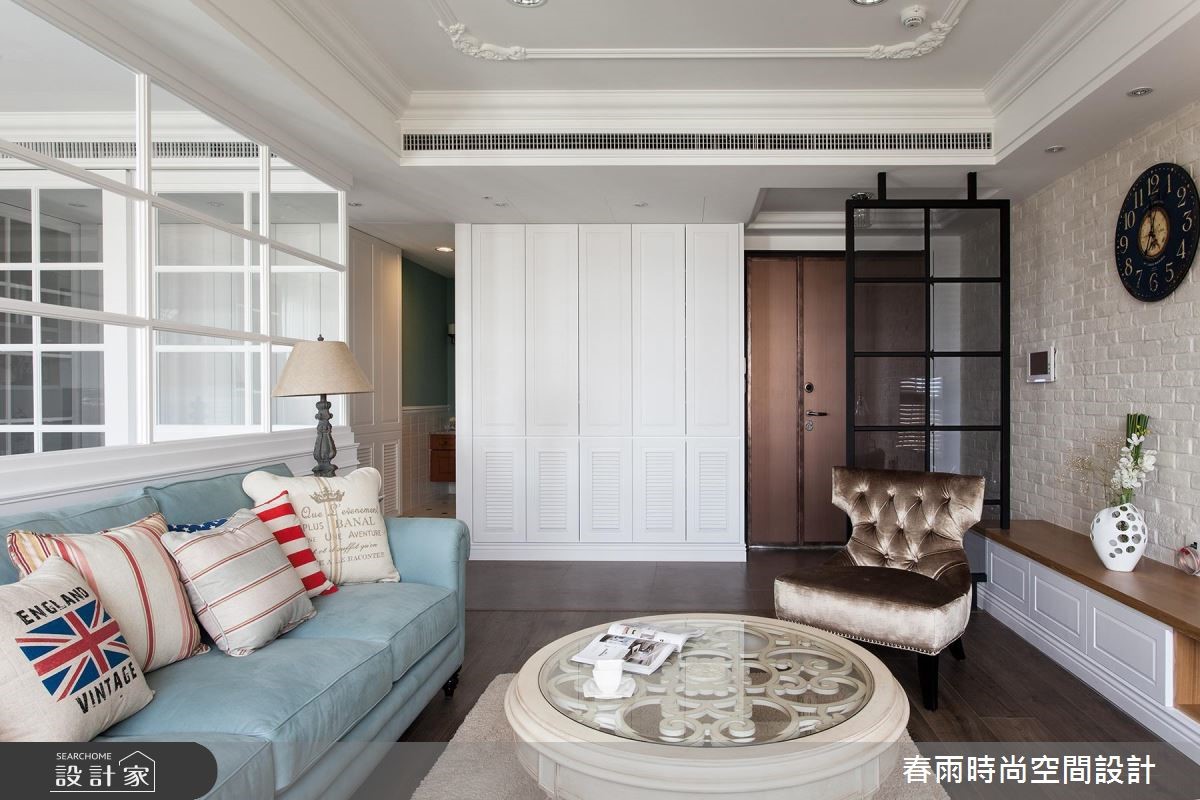 屋主从预售屋阶段就开始与设计师合作,透过客变(客户变更;建设公司在施工阶段依照屋主需求,预先提供变更格局、设备等服务)为一家四口打造合宜格局,针对风格、动线与收纳三大项目分别有着详尽规划。【开放式推拉门创造空间界定】针对动线规划,设计师以灰玻隔屏巧妙画出玄关空间。为了维持整体公领域的通透感,利用穿透性的格状玻璃串连客厅与独立书房,维持隐私却不减日光穿透性。为了维持适当的冷房效应,在通往餐厅的廊道上设立一道推拉门,也创造公私领域的分野。接着针对收纳机能,设计师为屋主在玄关延伸至廊道设置大面积木百叶柜体,搭配通往客浴的隐藏门片,兼具充裕收纳并收拢视觉。主卧收纳则巧妙将整排收纳柜与床头墙结合,并作出通往卫浴的走道动线。在风格营造上,设计师在客厅以纯白文化石墙、木百叶搭配色调沉稳的强化复合地板,并选用高明度的蓝色系沙发;另外,把壁炉设计置于餐厅,佐以精致的天花雕饰,型塑时尚不失温馨的美式风情。