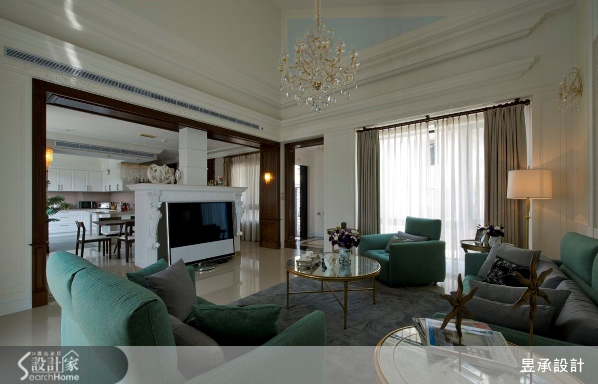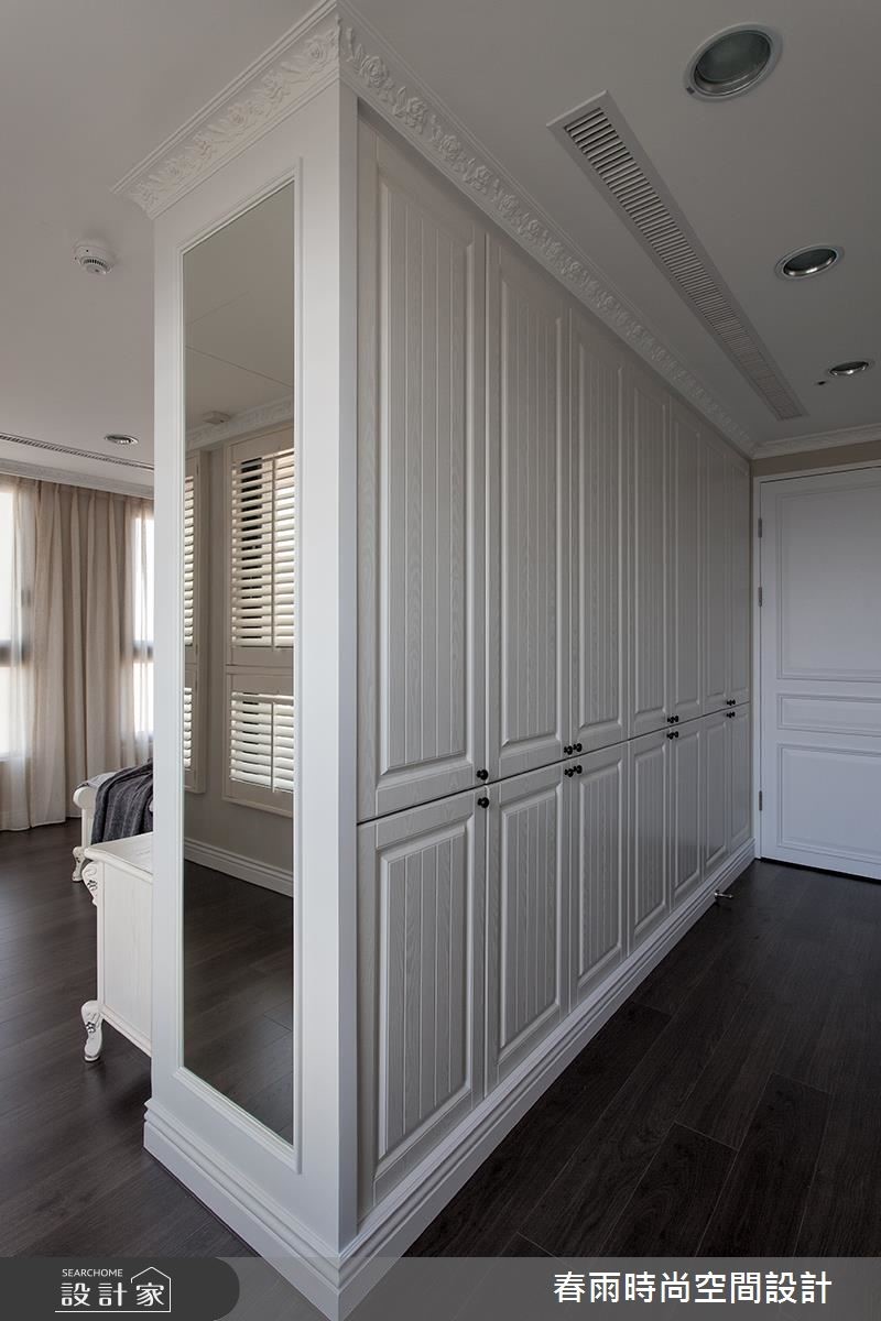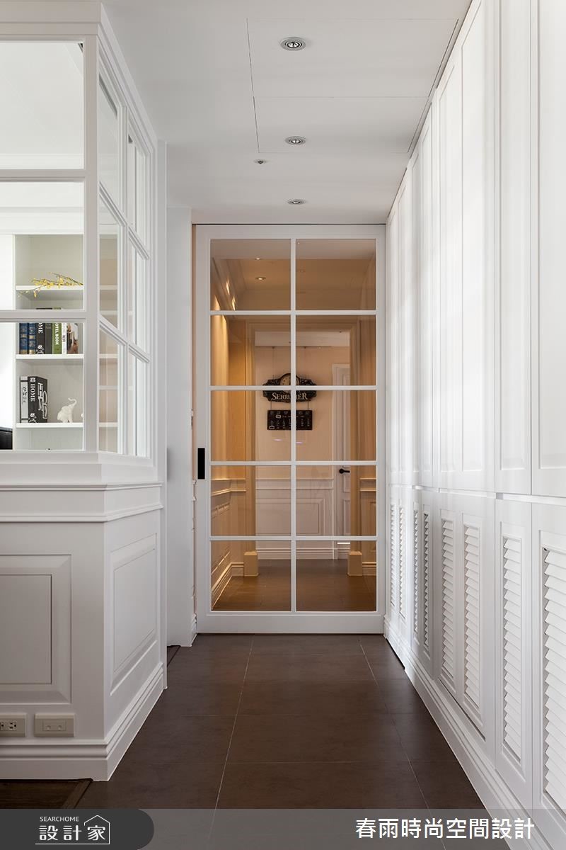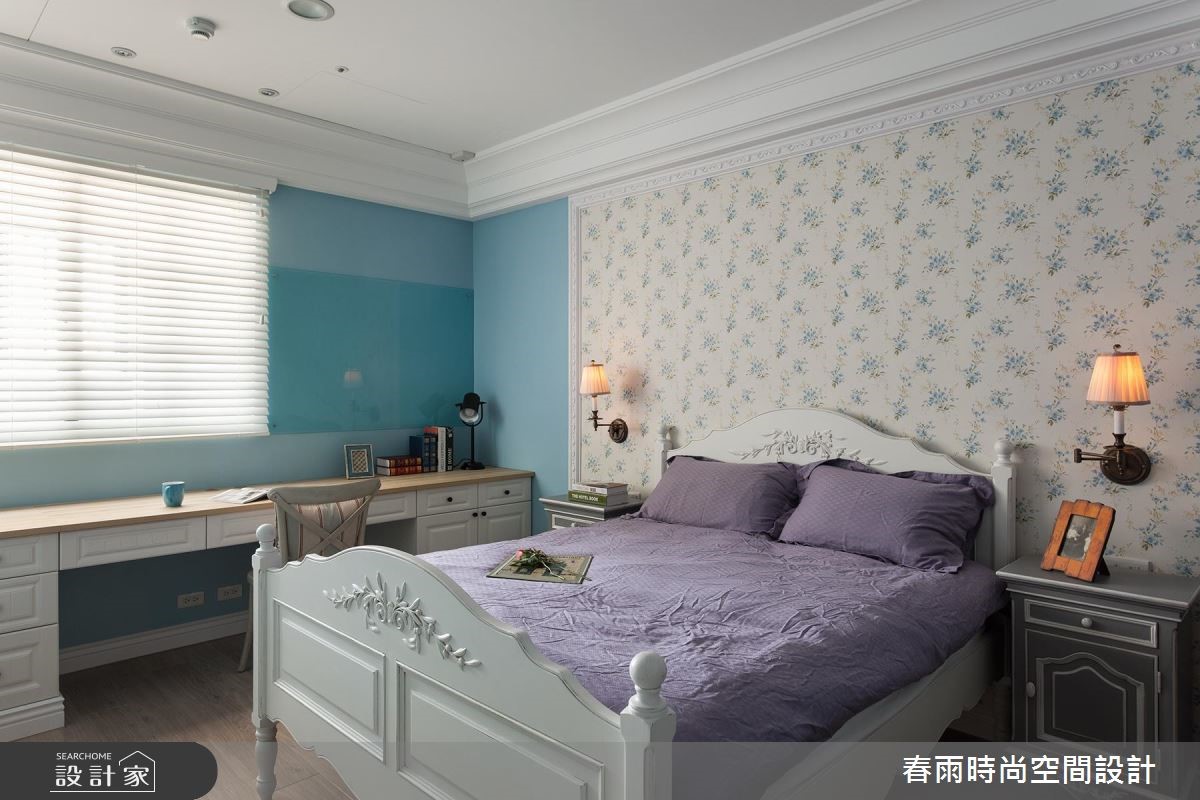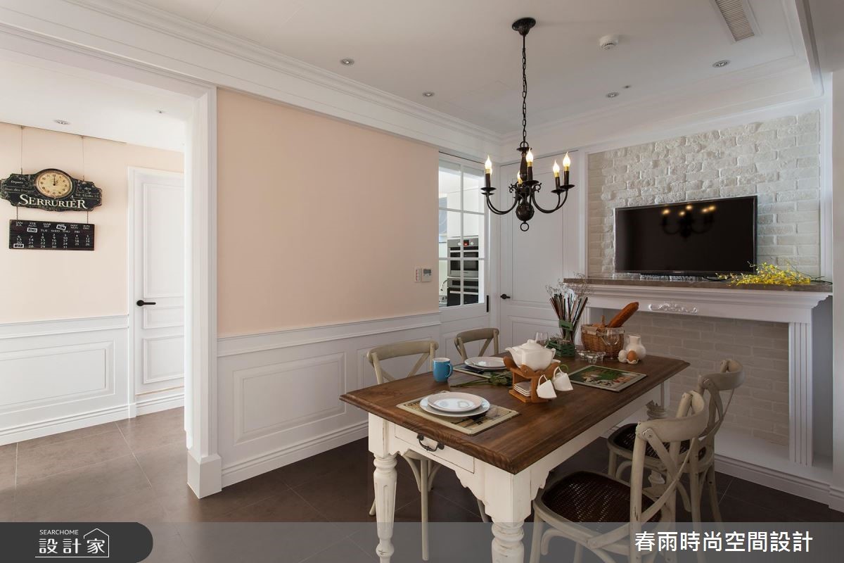 屋主从预售屋阶段就开始与设计师合作,透过客变(客户变更;建设公司在施工阶段依照屋主需求,预先提供变更格局、设备等服务)为一家四口打造合宜格局,针对风格、动线与收纳三大项目分别有着详尽规划。【开放式推拉门创造空间界定】针对动线规划,设计师以灰玻隔屏巧妙画出玄关空间。为了维持整体公领域的通透感,利用穿透性的格状玻璃串连客厅与独立书房,维持隐私却不减日光穿透性。为了维持适当的冷房效应,在通往餐厅的廊道上设立一道推拉门,也创造公私领域的分野。接着针对收纳机能,设计师为屋主在玄关延伸至廊道设置大面积木百叶柜体,搭配通往客浴的隐藏门片,兼具充裕收纳并收拢视觉。主卧收纳则巧妙将整排收纳柜与床头墙结合,并作出通往卫浴的走道动线。在风格营造上,设计师在客厅以纯白文化石墙、木百叶搭配色调沉稳的强化复合地板,并选用高明度的蓝色系沙发;另外,把壁炉设计置于餐厅,佐以精致的天花雕饰,型塑时尚不失温馨的美式风情。