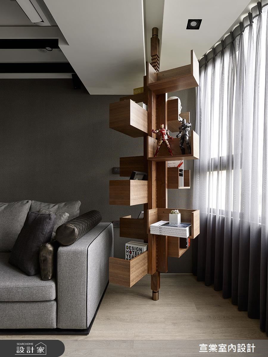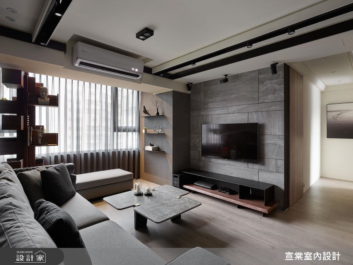 走过40年岁月的老房子,留下漏水、壁癌、采光不佳等问题,设计师改以沉稳现代风描绘空间感受,将潮湿、光线等问题一次解决,补足收纳机能,创造风格与实用兼修的优质住宅。【木石天然材质,为家注入生命力】整体选用自然感的材质铺陈,静谧的气息中又不失生命力。石材电视墙搭配灰色系的沙发背墙、沙发家具,以及墙面上的黑白画作更显优雅。临窗处的天花有着大梁横亘,利用展示机能美化结构。电视墙旁搭建展示隔板,沙发旁则创造一座旋转书柜,皆可摆设平时的收藏。在开放的公领域中创造整面收纳柜,且让柜体、墙面及房门造型一致,视觉更显延伸。原本三房的隔断微调,拆除一室隔断,纳入主卧成为更衣室;同时更衣室门片采用雾面玻璃,让光线能够引入室内,也保有内部隐私。