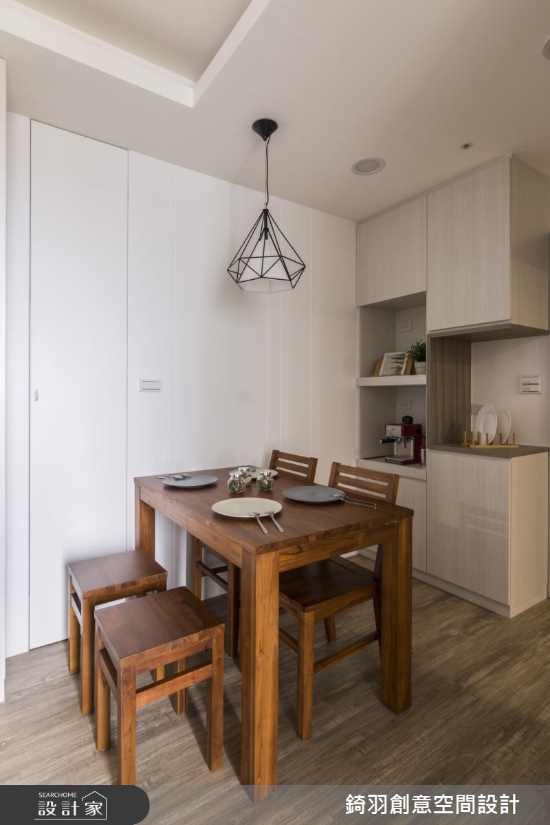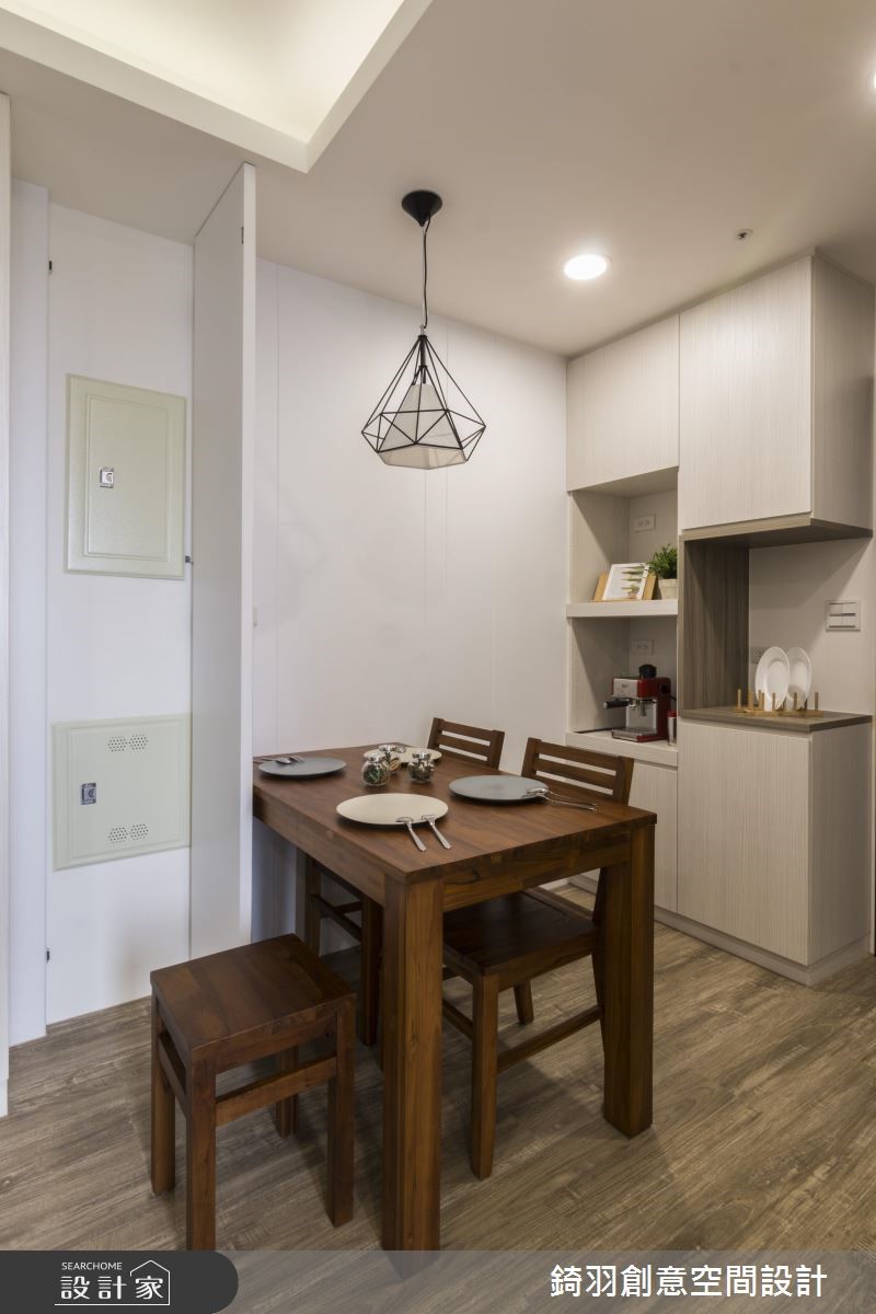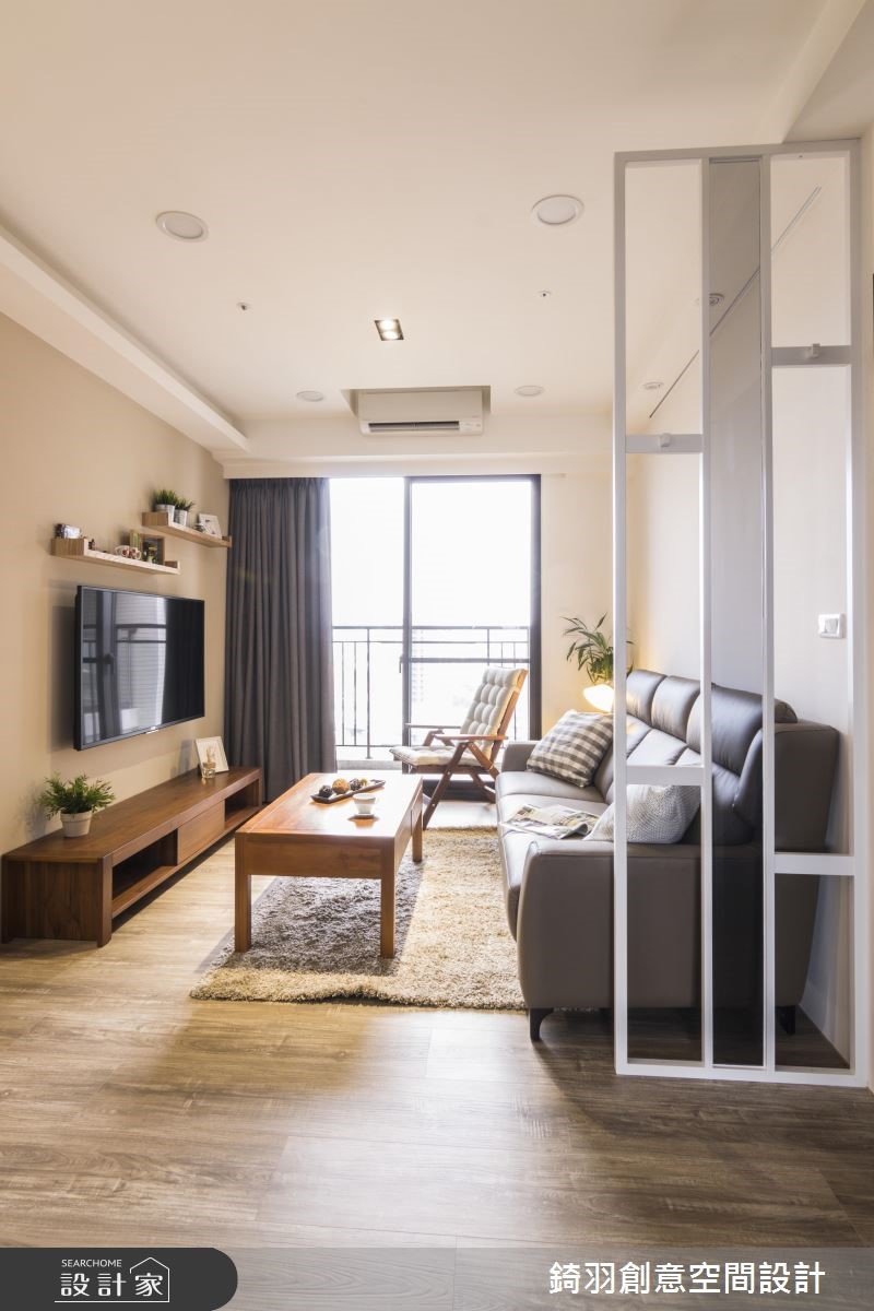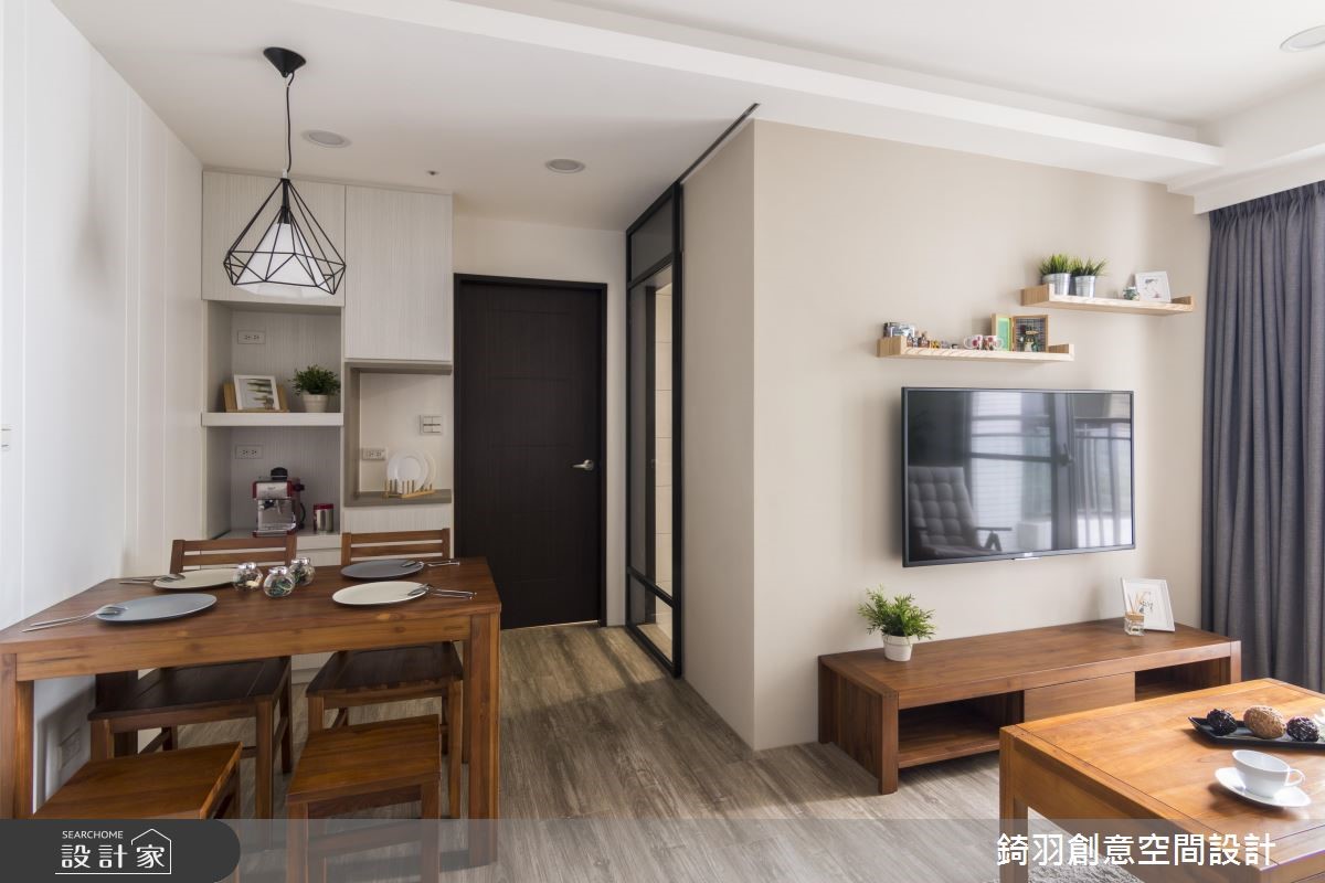 利用简约、自然气息的北欧风格点缀50平方米的居家,户外暖阳从阳台引入空间,照亮一室温暖、柔和的感受。而开放的格局设计,创造出开阔的空间氛围。【铁件隔屏,兼具收纳和区隔机能】设计师利用铁件打造悬空式隔屏,让玄关与客厅之间巧妙界定;隔屏以利落的边框线条,中央以镜面装饰,透视感的视觉与落地窗相互呼应,镂空感的设计更让视野无碍,视线可直抵窗外风景。电视墙以暖色调为底,留白的壁面搭配隔板设计,创造清新人文气息。原木质感的餐桌椅营造出温馨的用餐空间,后方壁面隐藏电箱位子,施以亮面漆的电箱表面与室内风情相融。电视墙后方为厨房,以玻璃推门区隔,将公共空间的光源引入室内,呈现干净、明亮的氛围。