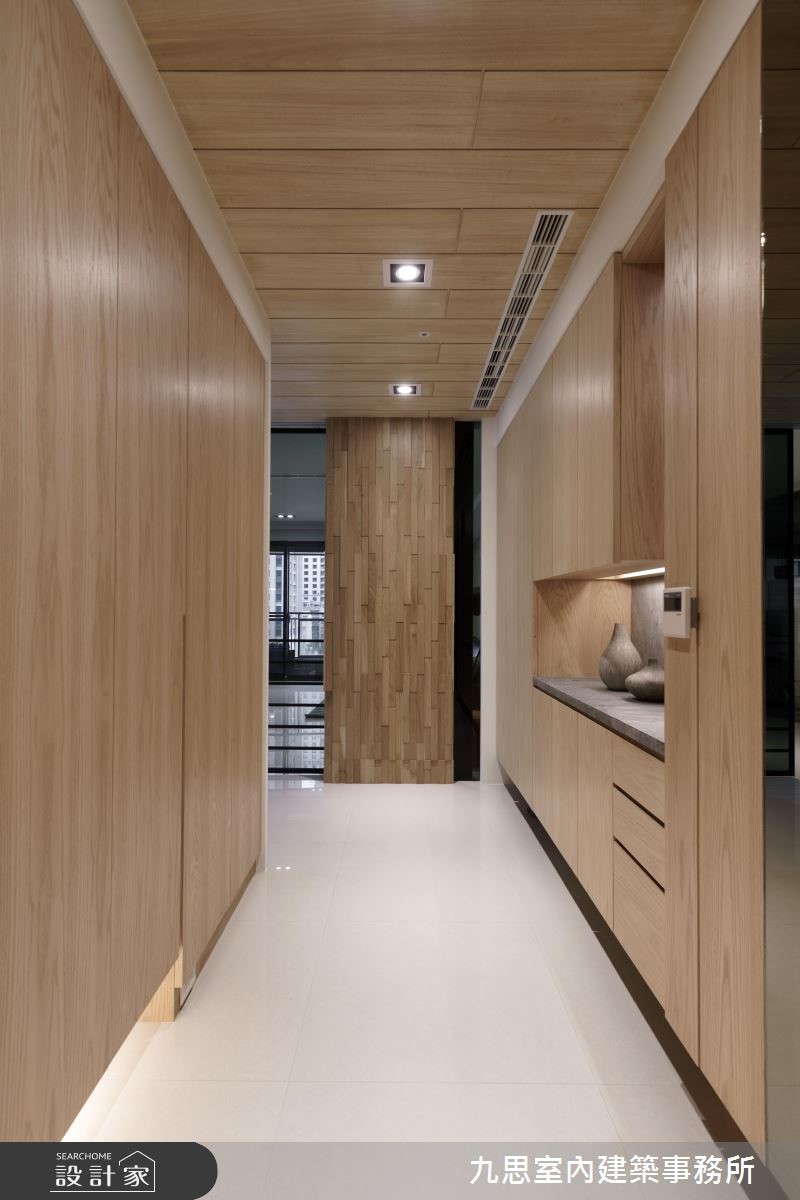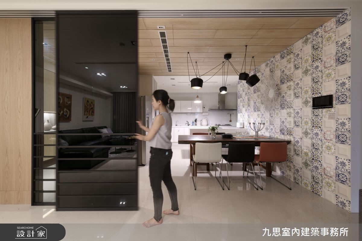 身为医生的屋主,非常重视家人的居住质量。除了以宽敞开阔的公领域作为规划,在室内选材上,更以环保无毒的特性为考虑;像是墙面油漆特别选用环保漆,空间里的木作则挑选F1无毒碳化板材,给家人一个安心无虞的健康宅。【弹性移门,施展玻璃屋幻化术】玄关的天花板以木纹铺陈,木板搭接的线条引领人们走进室内。两侧以大量的木作打造鞋柜,右侧柜体的中央搭配石材平台,创造美学展示区;造出静谧、素雅的人文风景,成为迷人的迎宾风格。透过移门弹性界定领域,让公共空间通通打开,伴随户外光线的映照下,室内更显开阔自在。一道铁件与镜面结合的移门,划分客厅与餐厅领域,便于屋主依需求缩放拉门长度。电视墙的中央以石材打造,横向的视觉纹理,擘划出壮阔气度;电视墙的上方以茶镜衔接,创造出后方玻璃柜体般的书房空间,让大量的光线得以引入其中,营造出明亮的阅读环境。后方墙面则以开放的书柜设计,满足大量的书籍收纳。