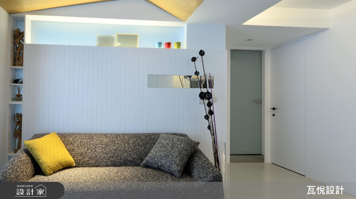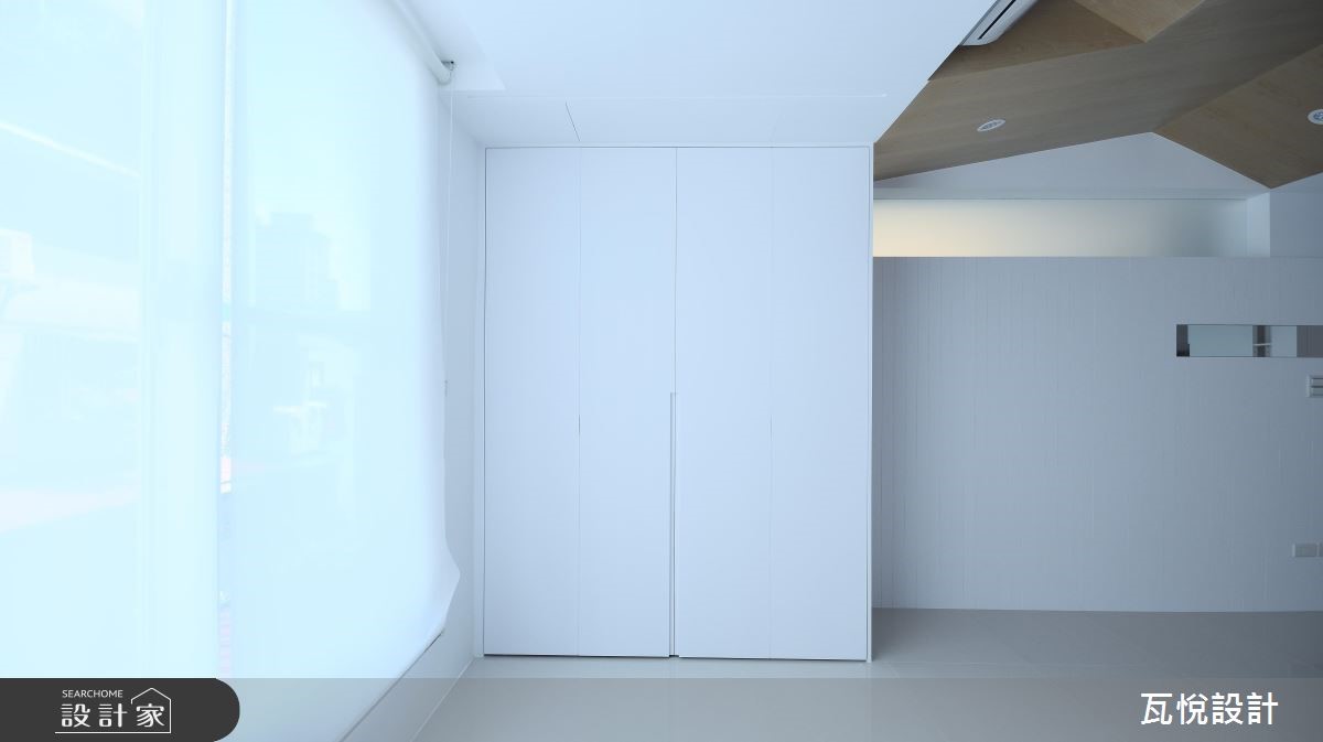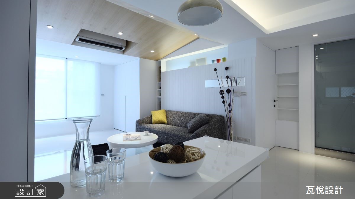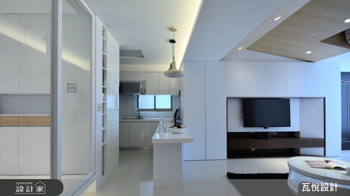 设计师必须因应屋主需求,安排3间居室、设置神龛、创造充裕的收纳量,并处理天花板梁柱突兀的问题,且看瓦悦设计如何将众多机能与巧思纳入69平方米空间。 【复合柜体,创造双倍收纳量】公领域以开阔通透的视觉为主,因此以纯白色调搭配利落线条作为主轴。并依据屋主用餐习性,由厨房延伸的吧台取代餐桌,并以流畅动线串连厨房与客厅。由于客厅天花板的梁柱过近,导致楼高产生压迫感,因此设计师采用原木材质修饰天花板,形成一大一小三角形组成的波浪斜屋顶,搭配沙发背墙与电视主墙利落垂直线条,成功拉抬视觉感受。设计师更扩大窗户面积,巧妙应用背墙镜面与多功能次卧的玻璃推拉门,创造明亮通透的扩容视觉。并以"多层次隐藏收纳"为主轴,将神龛隐于柜体中,并加装移动式佛桌。接着将电视墙结合隐藏收纳柜,提升公领域的机能。