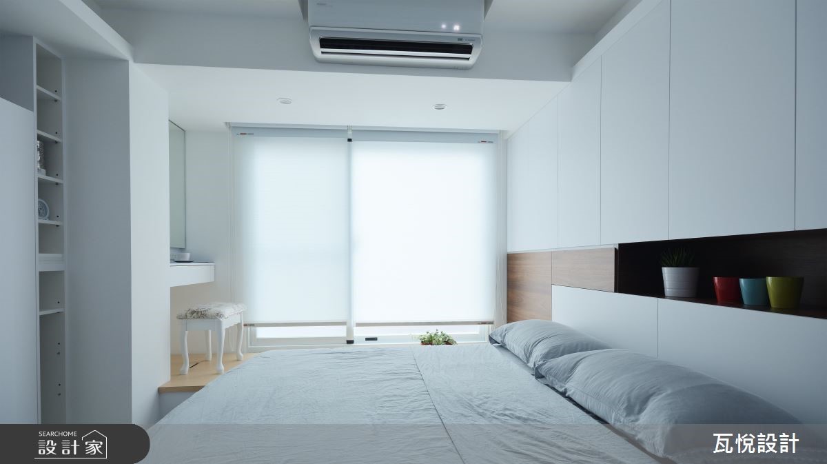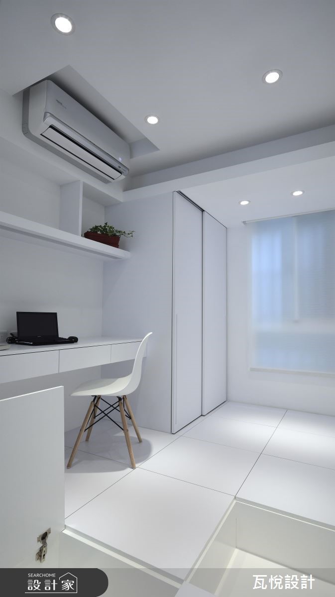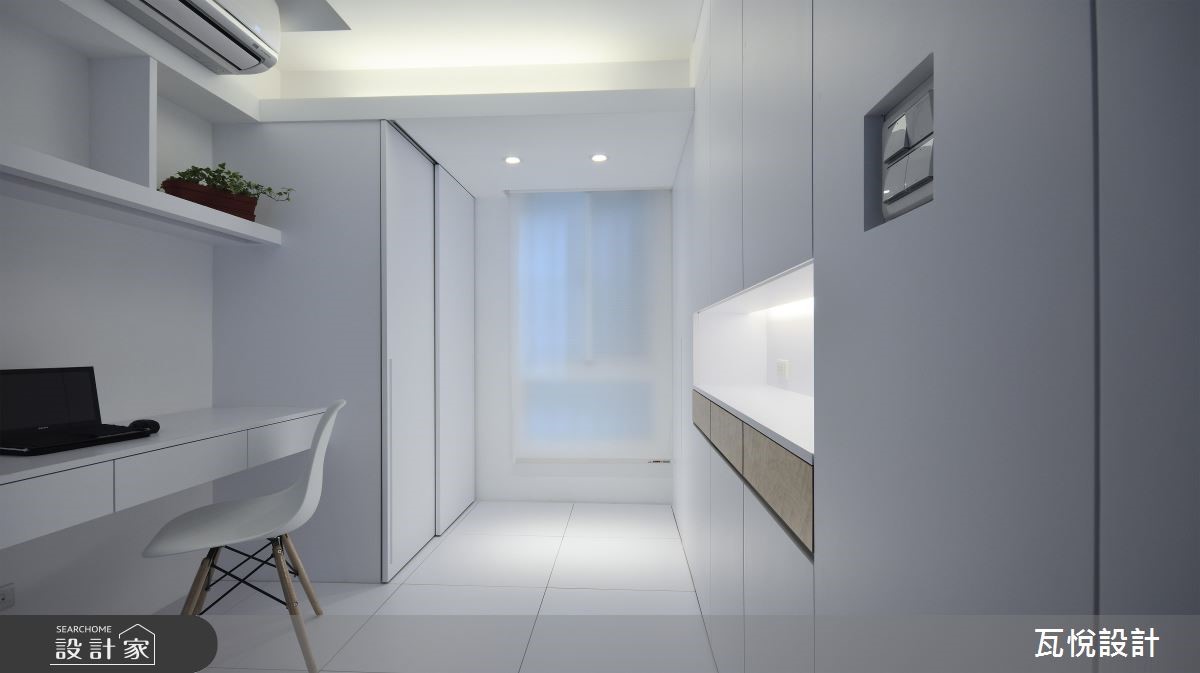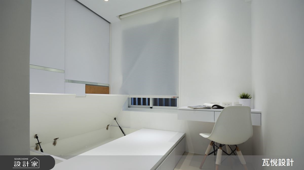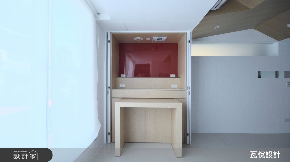 设计师必须因应屋主需求,安排3间居室、设置神龛、创造充裕的收纳量,并处理天花板梁柱突兀的问题,且看瓦悦设计如何将众多机能与巧思纳入69平方米空间。 【复合柜体,创造双倍收纳量】公领域以开阔通透的视觉为主,因此以纯白色调搭配利落线条作为主轴。并依据屋主用餐习性,由厨房延伸的吧台取代餐桌,并以流畅动线串连厨房与客厅。由于客厅天花板的梁柱过近,导致楼高产生压迫感,因此设计师采用原木材质修饰天花板,形成一大一小三角形组成的波浪斜屋顶,搭配沙发背墙与电视主墙利落垂直线条,成功拉抬视觉感受。设计师更扩大窗户面积,巧妙应用背墙镜面与多功能次卧的玻璃推拉门,创造明亮通透的扩容视觉。并以"多层次隐藏收纳"为主轴,将神龛隐于柜体中,并加装移动式佛桌。接着将电视墙结合隐藏收纳柜,提升公领域的机能。