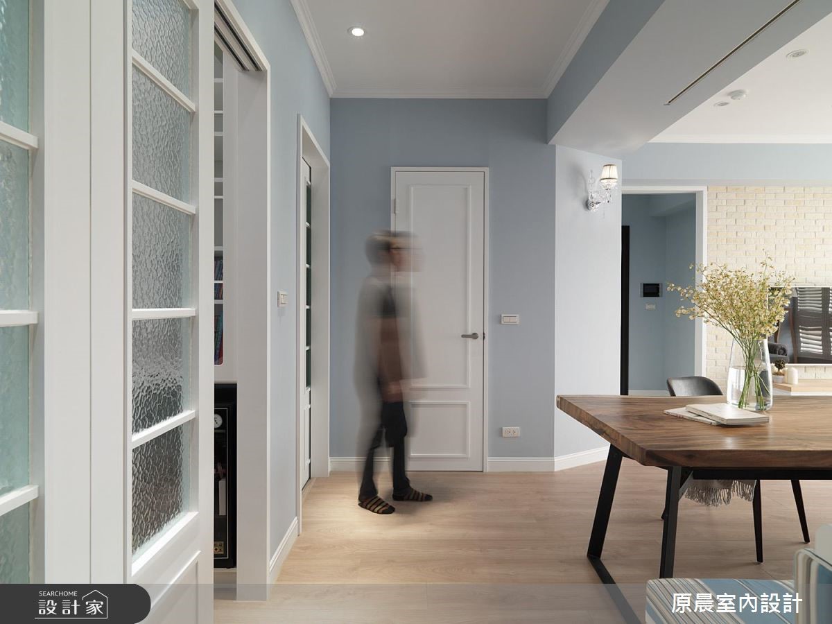 106平米乡村风居宅,屋主夫妻俩都是上班族,在本次装潢规划中,他们希望能打造出温暖舒适的居家氛围,不想要太沉重的色彩或是冷硬的感觉,因此设计师善用色彩与材质,带来温柔纾压的感受,当屋主工作一整天回到家,身心就能自然放松。 【大块浅蓝宁静色调慢生活】走进这处住宅空间,大面积的浅蓝色恣意在客厅、餐厅蔓延,营造宁静纾压的空间气质,让紧凑的生活节奏也慢了下来。电视墙利用鹅黄色文化石,堆砌出明亮温暖的视觉感受,并丰富了色彩和材质的变化,搭配温润的木地板和百叶窗,相当温和而舒适。【收纳厨务考虑日常收取效率】收纳设计也十分充足,玄关处沿着墙面设置一整面衣帽柜,赋予展示、储物等多元的功能性,当屋主夫妻俩上、下班时,更能有效率的拿取或收好物品。主卧室则以大地色和纯白色系为主调,沿着窗边规划卧榻,除了日常休憩外也能在下方储放东西,一整面的落地大衣柜,也满足了衣物的收纳需求。