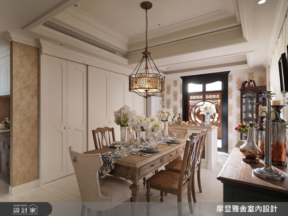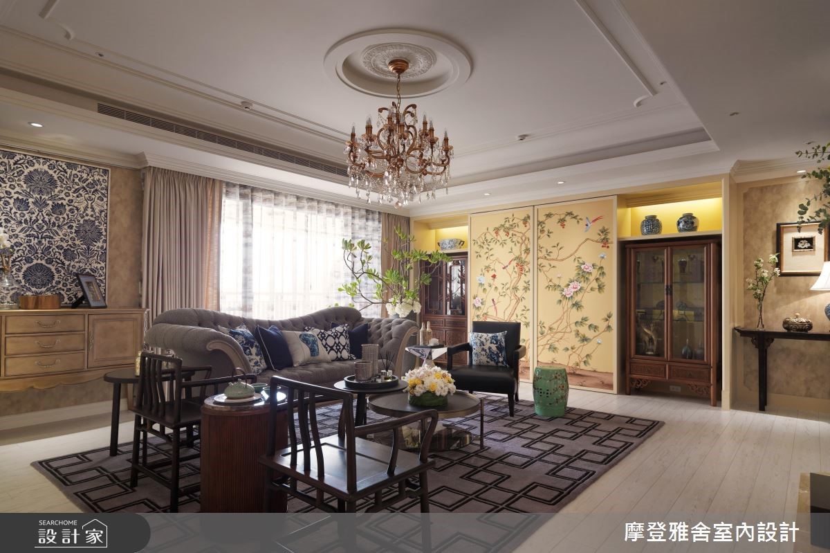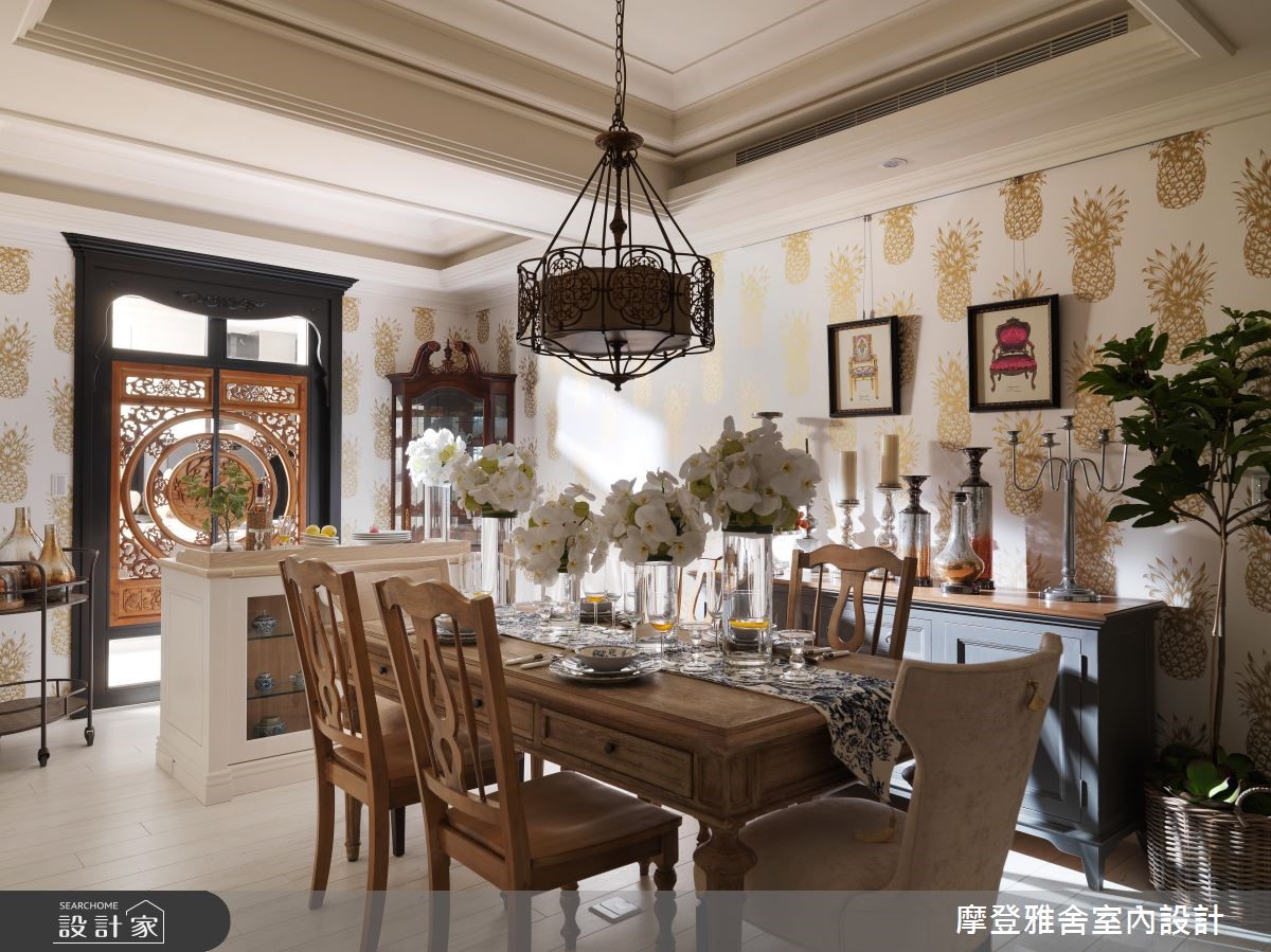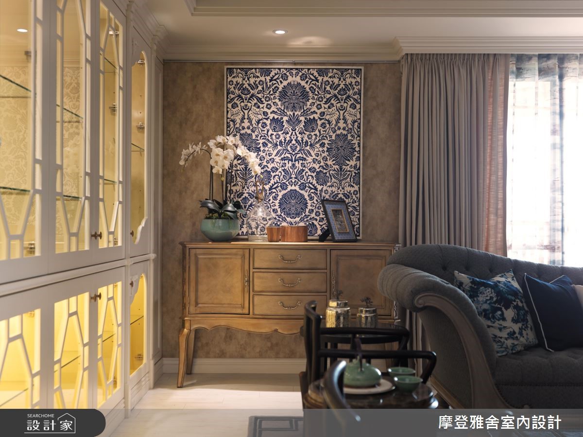 不同的年代,迥异的审美标准总是不断相互碰撞,在这个案例中,一家五口、三代同堂,各有需求的老中青三代,既想兼顾东方的内敛古韵,又想坐拥乡村风的温暖质地;于是,汪忠锭、王思文设计师将再次出马,带来风格、机能、全方位破解!【结合东西文化,营造大器姿态】设计师拆解公领域一道墙,达到扩容效果,再运用方型天花结合圆型语汇,阐述天圆地方的概念。客厅则选用淡黄色粉刷墙面,搭配微量的金色妆点,带出古朴风情,搭配西式线板与中式圆型洞门语汇,创造中西合璧的视觉之美。考虑屋主拥有许多古董,特别事先丈量并编号,量身定制展示空间,同时发挥精湛的美学功力,将古董与空间风格完美结合,共筑独特的新殖民地风范!特殊的双主墙设计,以"鸟语花香"手绘柜门对应精品展示柜,显示屋主的品味。将屋主收藏的古董窗花客制成厨房门片,不仅美化立面,更再造古件新价值,且在立面做出利落的美型收纳,落实清爽的格局视野。私领域也给予客制化设计,满足同堂三代的不同需求,比如长亲房融入罗马柱与金钱纹窗花;书房以墙纸布艺成就整体风格,令人耳目一新!