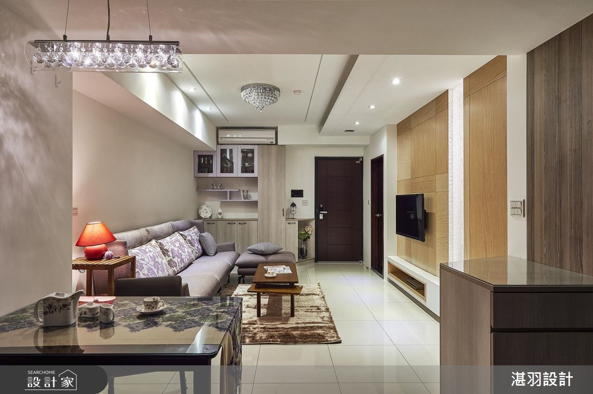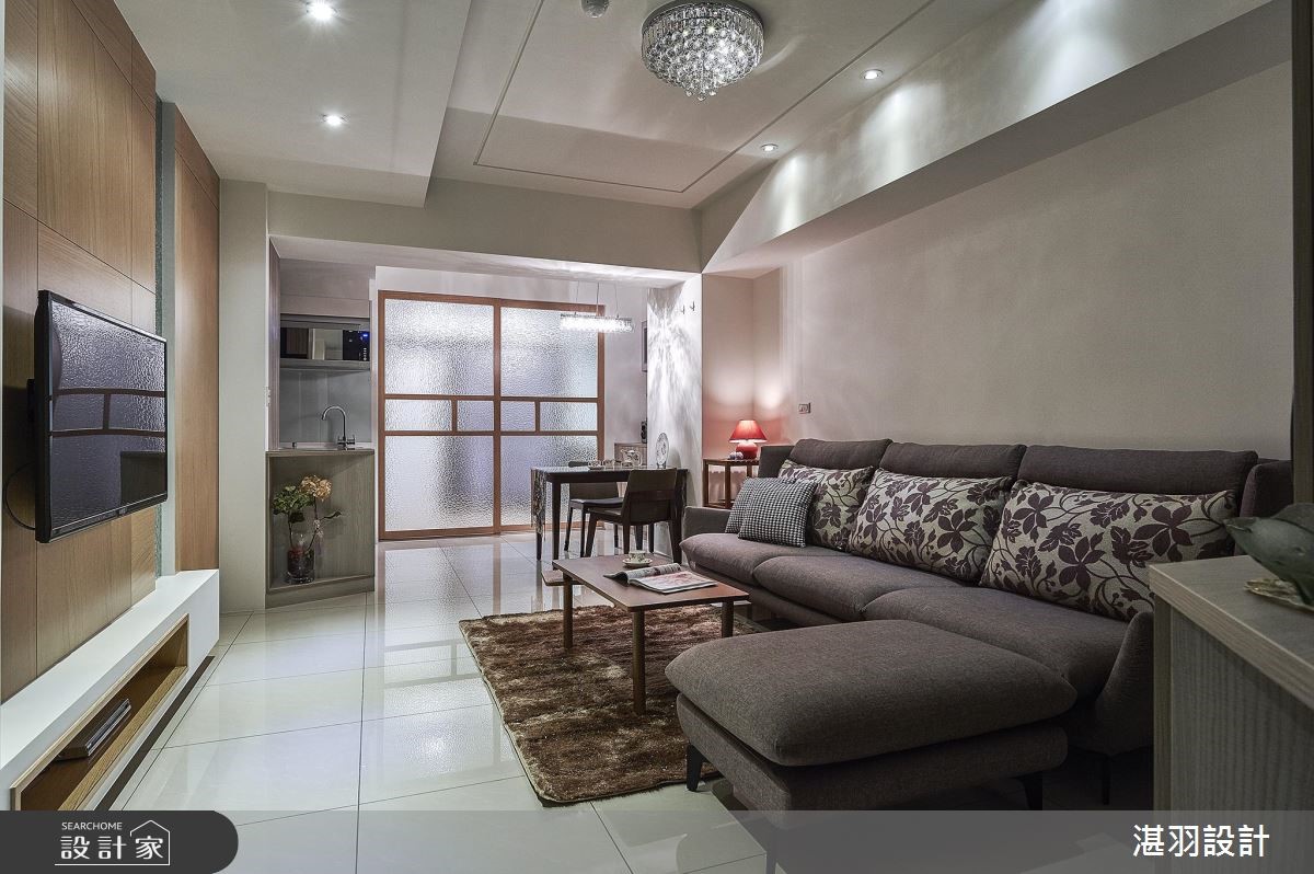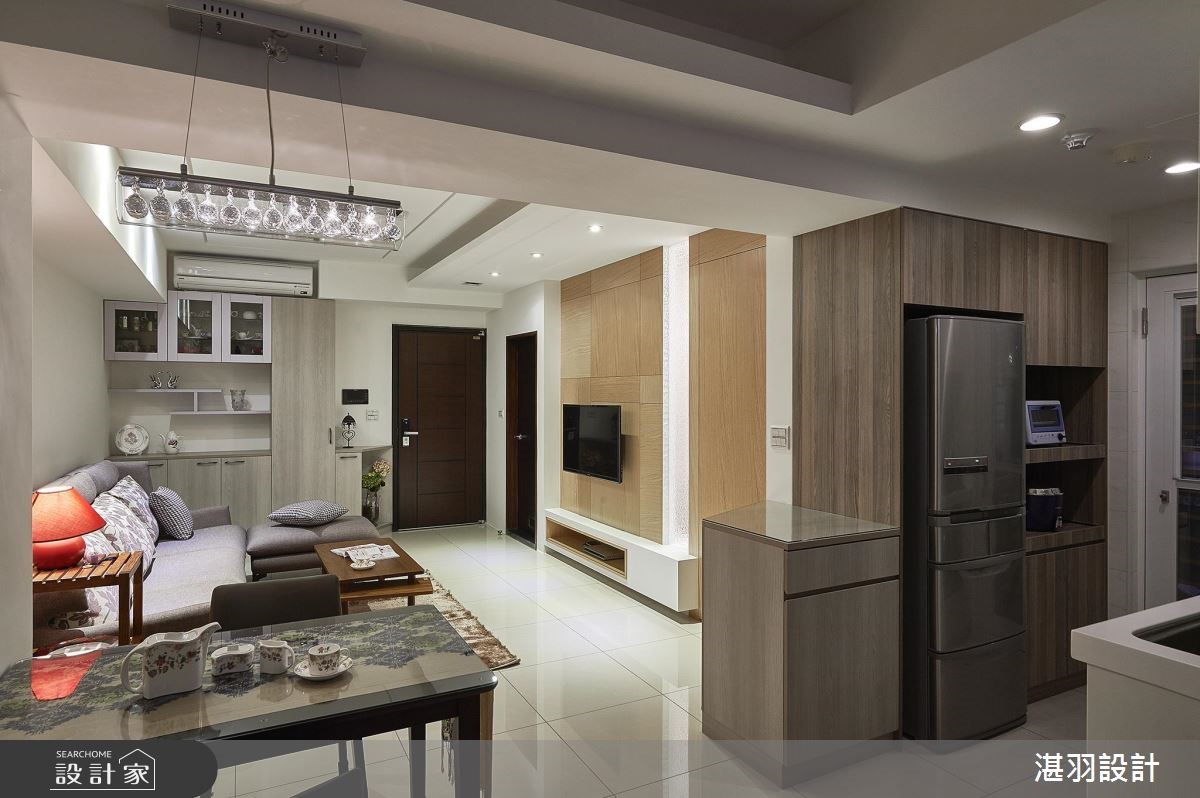 在有限的58平方米空间,设计师以白色的天地壁作为室内基底,并顺着梁柱结构整合收纳机能,甚至将沙发椅背整并其中,创造宽敞的行走动线,让公共领域更显自在、舒适,满足屋主对家的期望。【清透材质,延伸空间视觉感】设计师于大门右侧壁面,创造出收纳与家用备品的柜体,利用开放与封闭层板造型,搭配简约的层板线条,展现灵活变化的收纳设计;开放式的公共领域里,客厅利用L型沙发搭配紫色印花抱枕,天花板饰以华丽感的水晶灯饰,展现屋主优雅的生活品味。电视墙以木作打造,右侧拼接水波纹玻璃材质,丰盈视觉变化,并带来放大的视觉感受;大梁结构的两侧分别规划餐、厨领域,厨房后方则藉由玻璃拉门,不只区隔休憩的主卧领域,也和电视墙相互呼应,交织完整、和谐的室内造型。