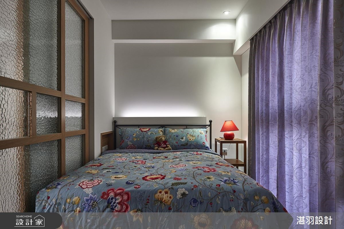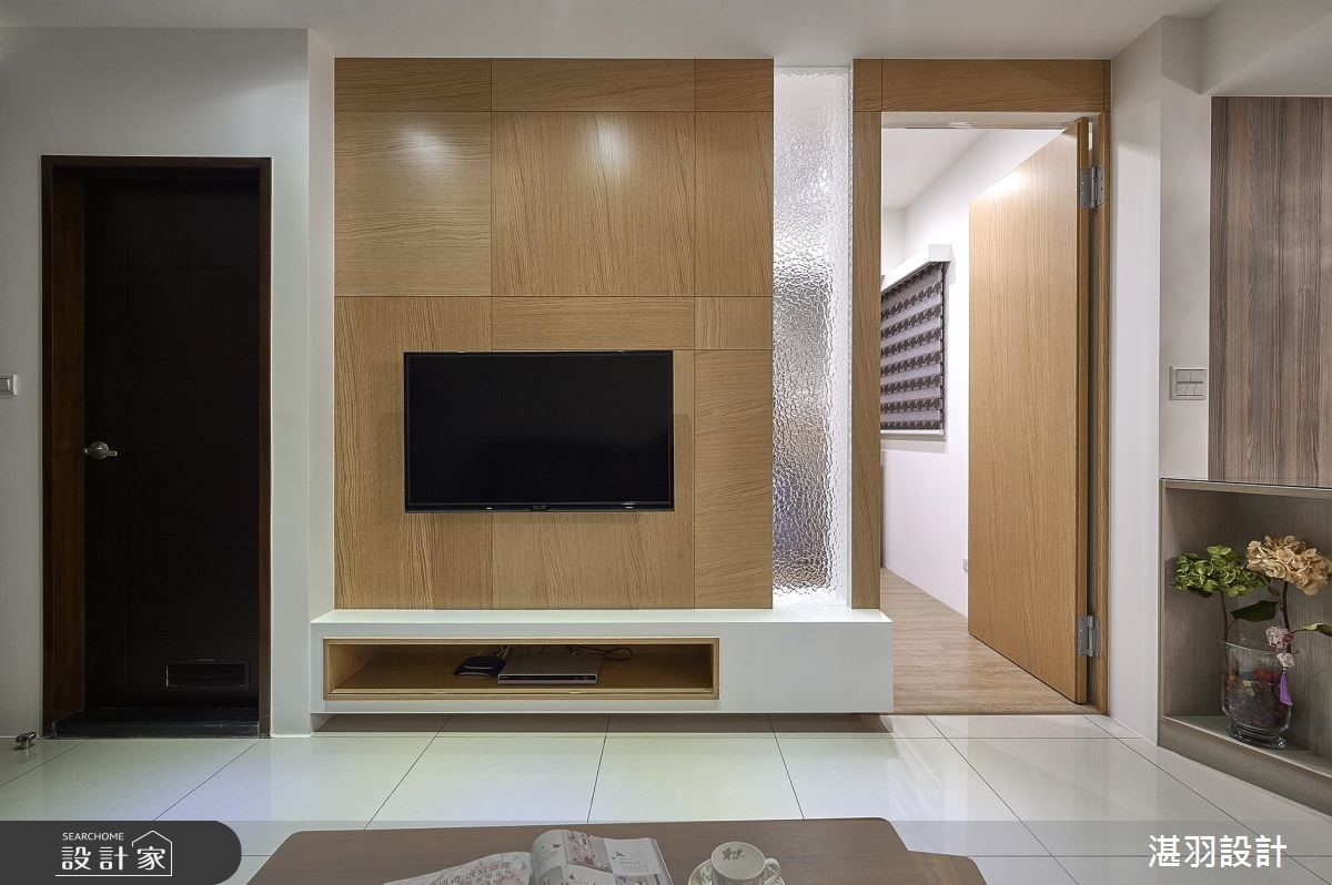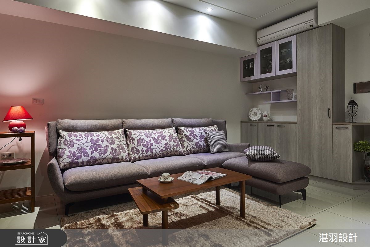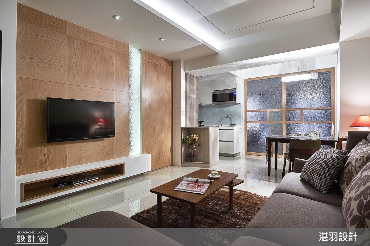 在有限的58平方米空间,设计师以白色的天地壁作为室内基底,并顺着梁柱结构整合收纳机能,甚至将沙发椅背整并其中,创造宽敞的行走动线,让公共领域更显自在、舒适,满足屋主对家的期望。【清透材质,延伸空间视觉感】设计师于大门右侧壁面,创造出收纳与家用备品的柜体,利用开放与封闭层板造型,搭配简约的层板线条,展现灵活变化的收纳设计;开放式的公共领域里,客厅利用L型沙发搭配紫色印花抱枕,天花板饰以华丽感的水晶灯饰,展现屋主优雅的生活品味。电视墙以木作打造,右侧拼接水波纹玻璃材质,丰盈视觉变化,并带来放大的视觉感受;大梁结构的两侧分别规划餐、厨领域,厨房后方则藉由玻璃拉门,不只区隔休憩的主卧领域,也和电视墙相互呼应,交织完整、和谐的室内造型。