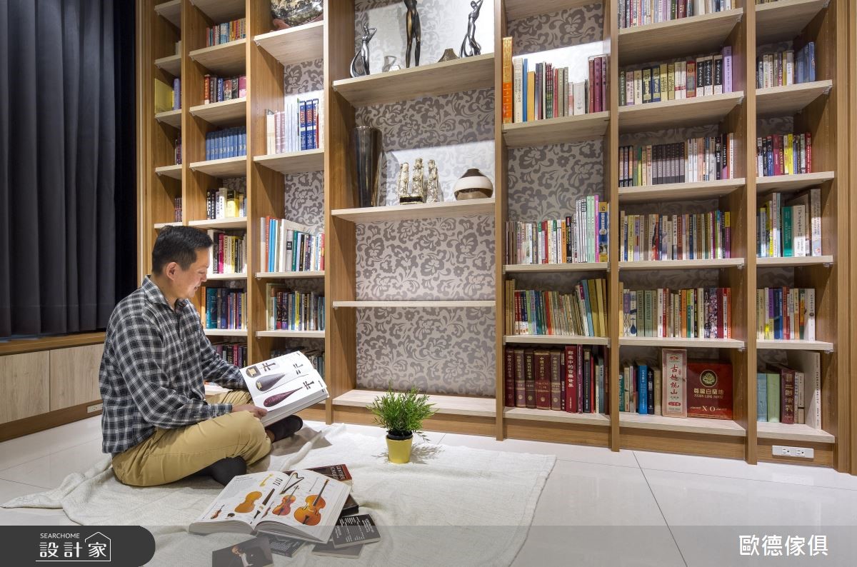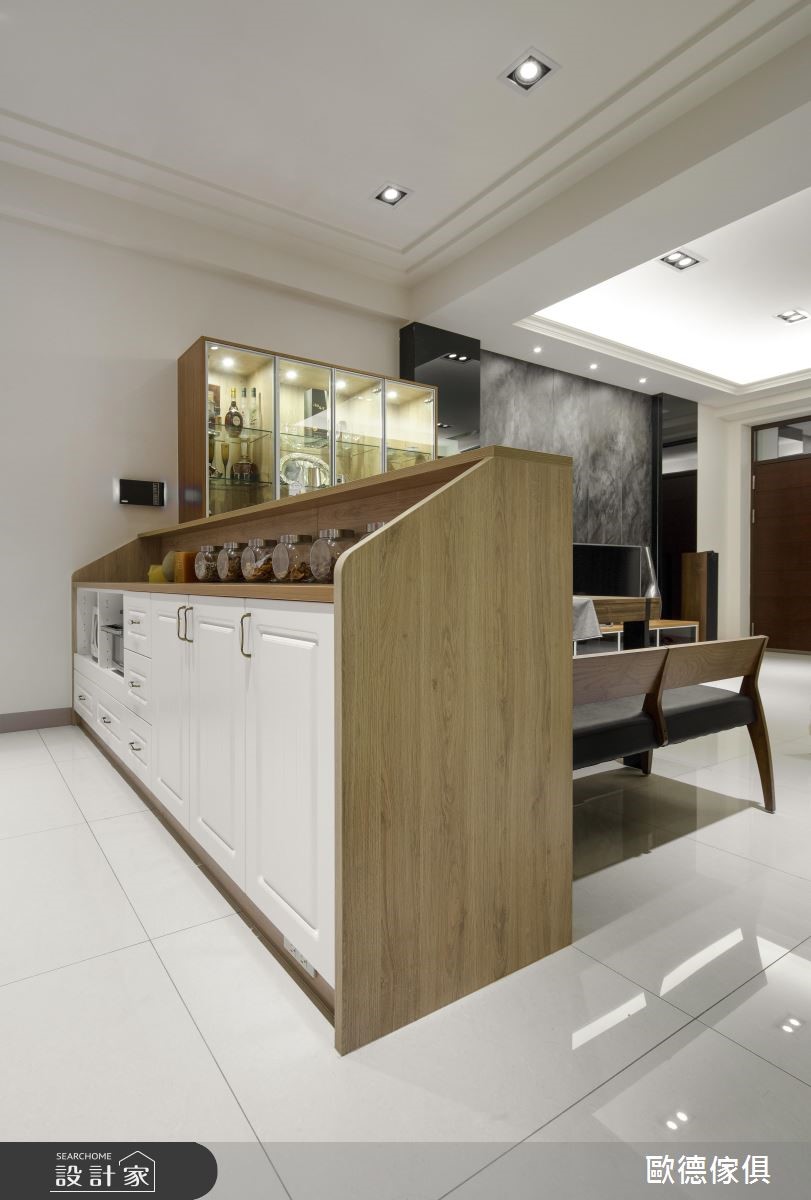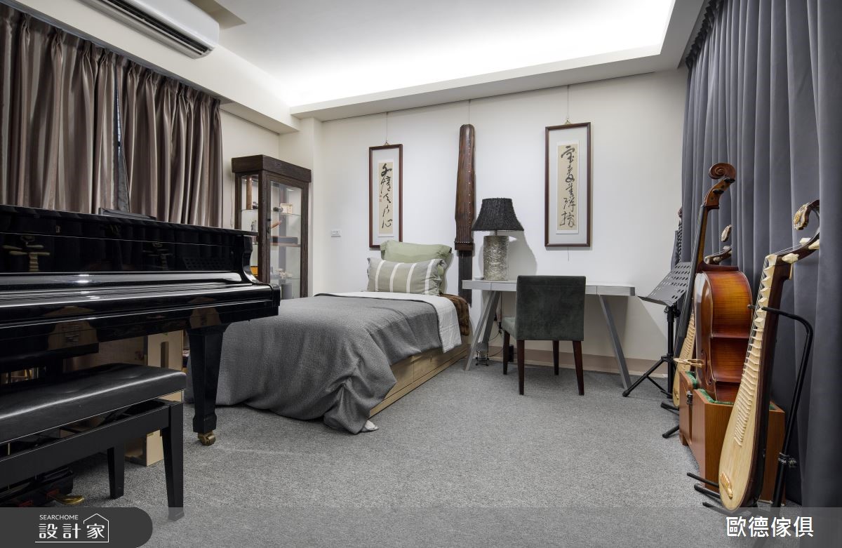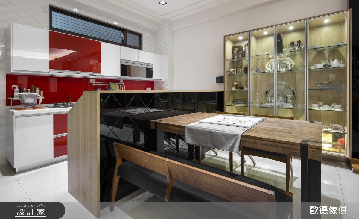 208平方米的独栋楼,由于屋主为国乐系教授,著重于乐器与乐理书籍的收纳问题,另外也因惜物性格,想要沿用旧家具,因此设计团队将旧家具与系统板材结合,转变为另一种新生命,打造出简约俐落的现代风格。【材质混搭,系统家具也能很多变】公共领域以开放设计串连客厅及餐厨空间,利用大理石质感壁面搭配黑镜,让电视主墙呈现大器氛围,背墙则因应屋主书籍收纳需求,搭配壁纸打造开放收纳层架,更善用大面积开窗,设置窗边飘窗与低台度家具。餐厨空间以活泼的鲜红烤漆玻璃搭配菱格纹吧台,营造时髦感受,搭配上屋主的珍藏柜,宛如一座小型艺廊。主卧则回归轻松淡雅,以色调轻浅的系统家具与壁纸,搭配充沛日光就很迷人。