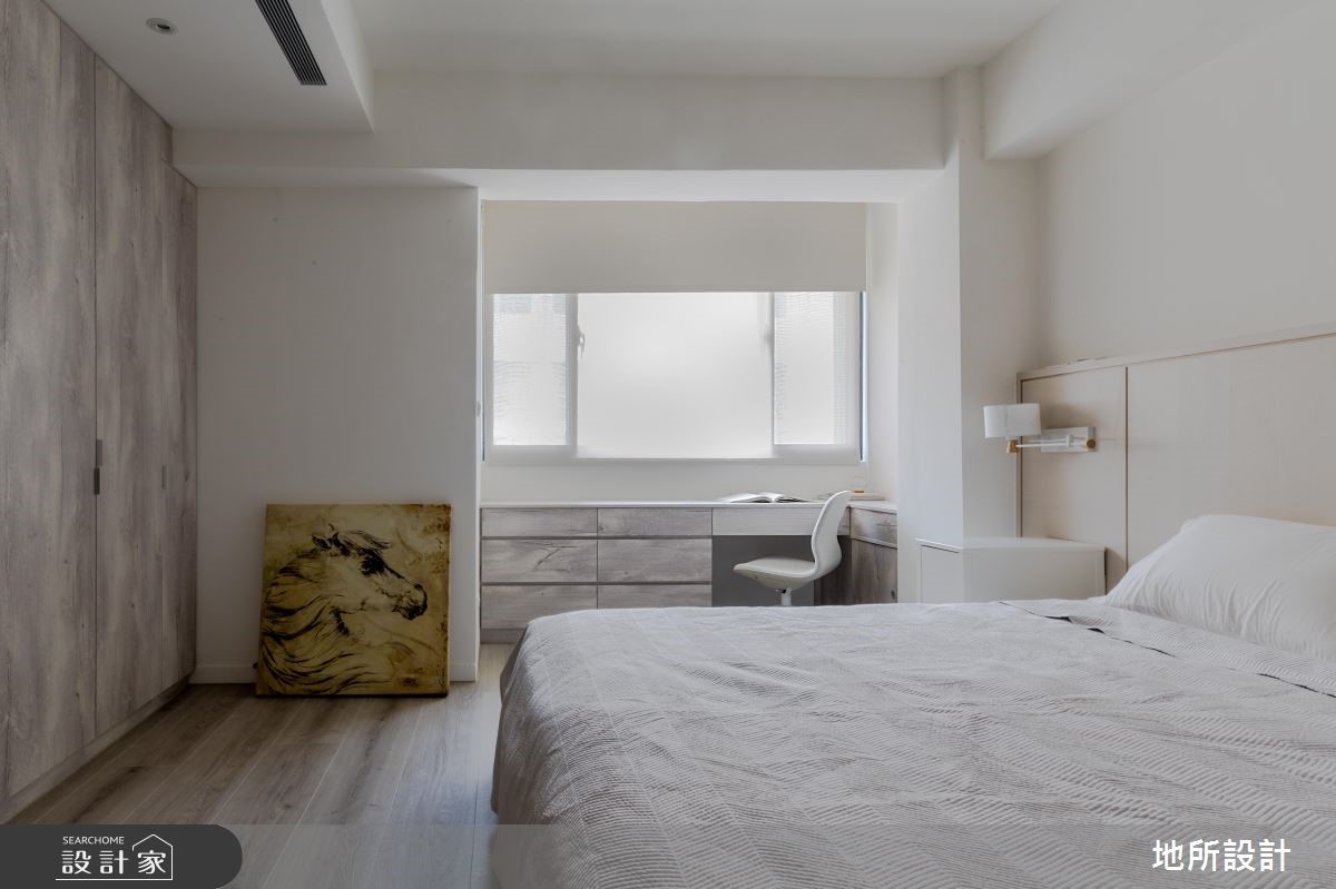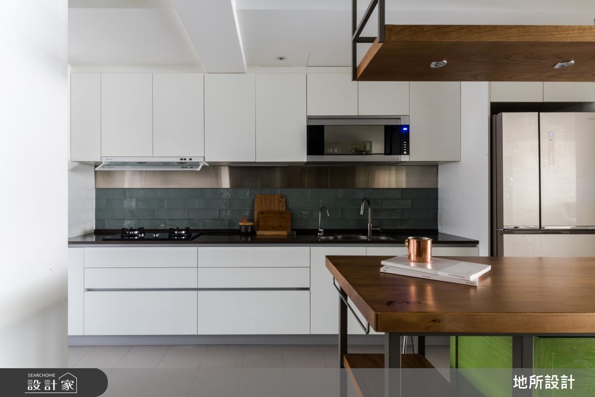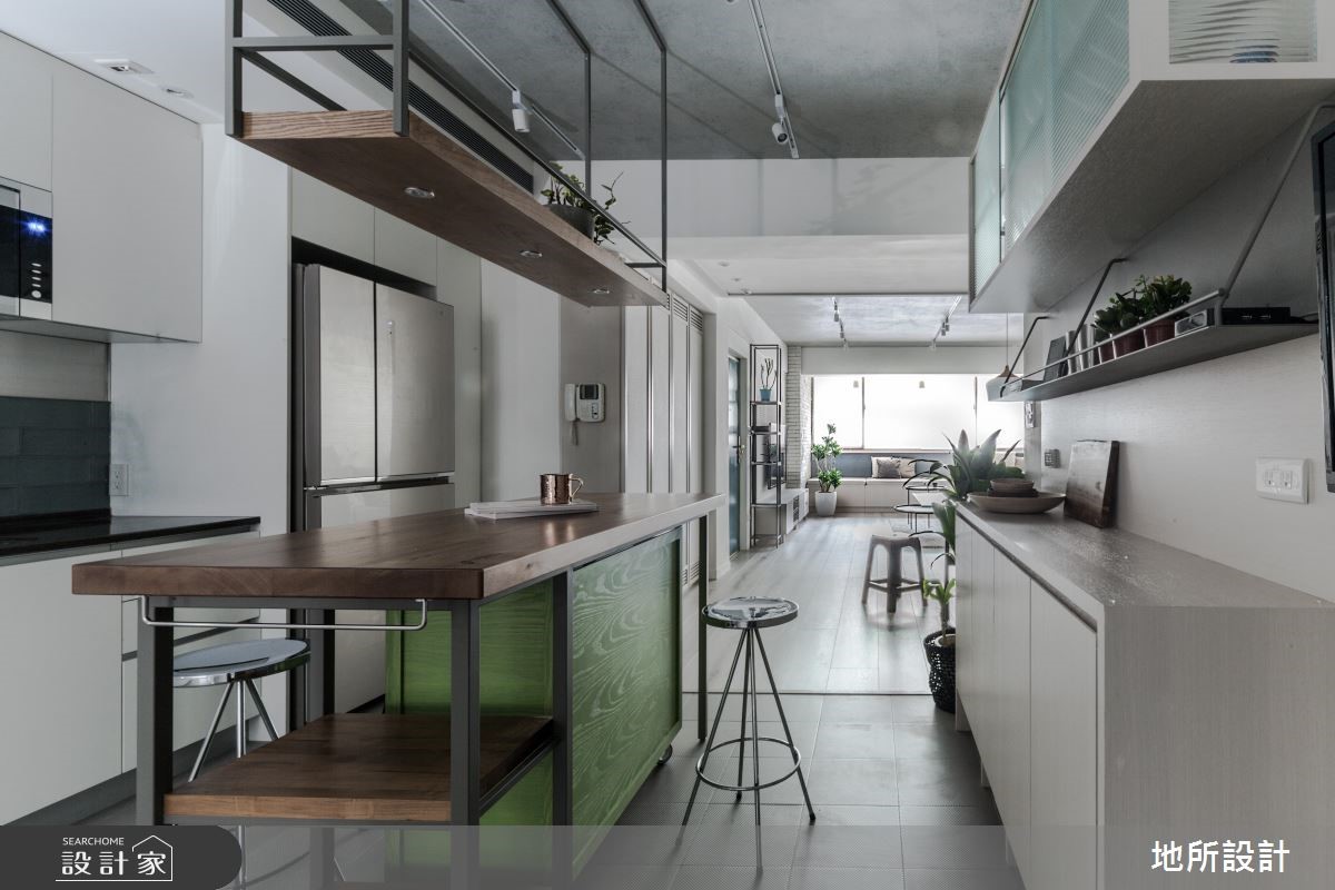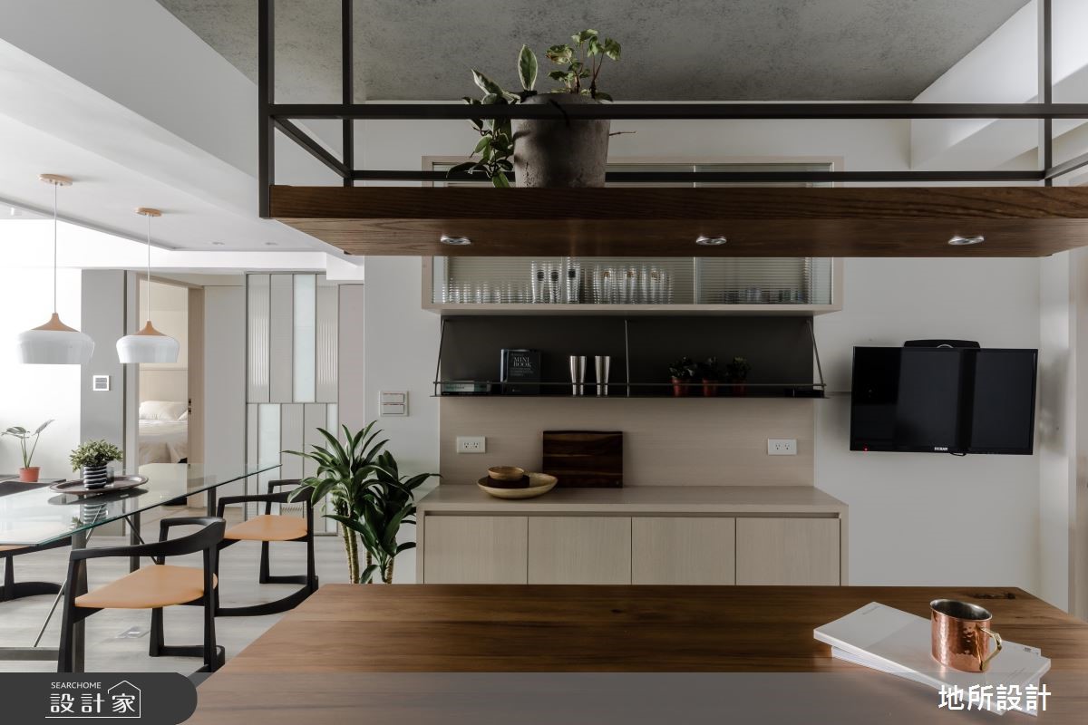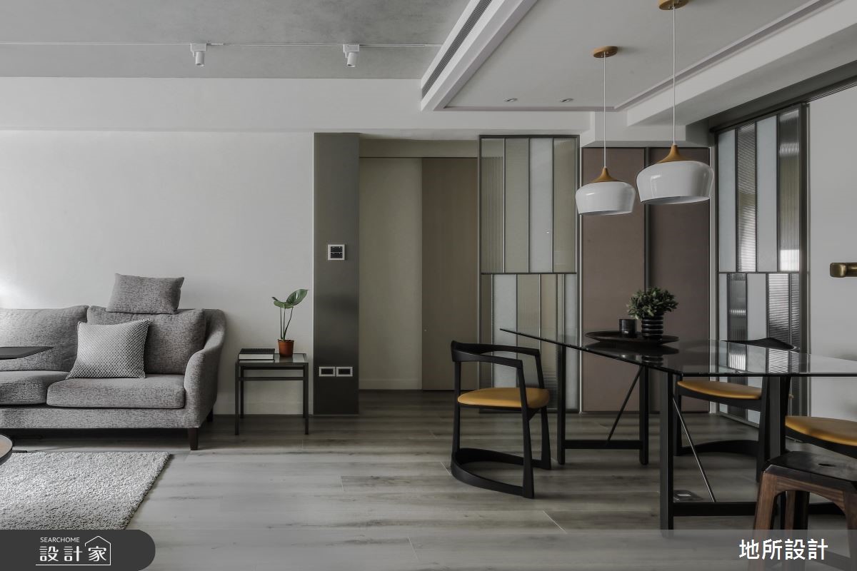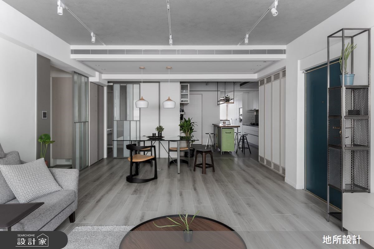 针对102平方米狭长老屋的改造面貌,设计师以现代风作为基底,并挹注强大的收纳机能。同时因应女主人喜爱下厨的需求、量身定制厨房中岛吧台;搭配全室素雅且自然的色彩计划,替新婚小夫妻完成家的美梦。 【客餐厅不做隔断,空间更宽阔】客厅不做吊顶,改铺陈水泥涂料,奠定都会高冷范。并顺应半高窗设计,规划一区休憩飘窗,搭配平滑面的浅灰文化砖点缀,营造温柔纾压的生活氛围;沿着长型格局,客厅和餐厨安排在格局两侧,中央不做隔断。不仅让日光从两侧进入,打亮空间,也还原空间广度。餐厅两侧使用铁件与长虹玻璃建构屏风,形成空间功能转换的过道,可导引进入主卧、客浴与客卧。餐厨则被视为家的核心地带,采以开放式设计,并额外配置轻食吧台,加入悬吊柜与墙柜满足收纳展示需求。再以清新草木绿妆点吧台,打造女主人心目中的料理情境。主卧延续木地板的温润质韵,维持纯粹的素净质地。窗边难以利用的畸零范围则作为梳妆台,不浪费空间,并考虑预算成本配置组合家具,双重网罗简约美感及实用效能。