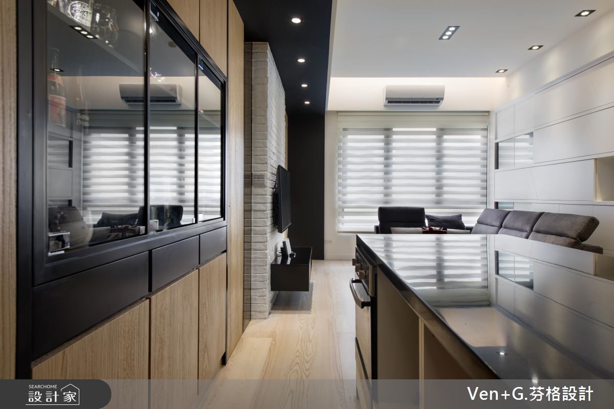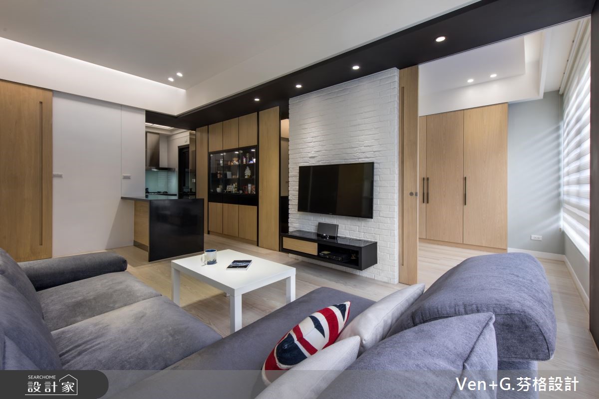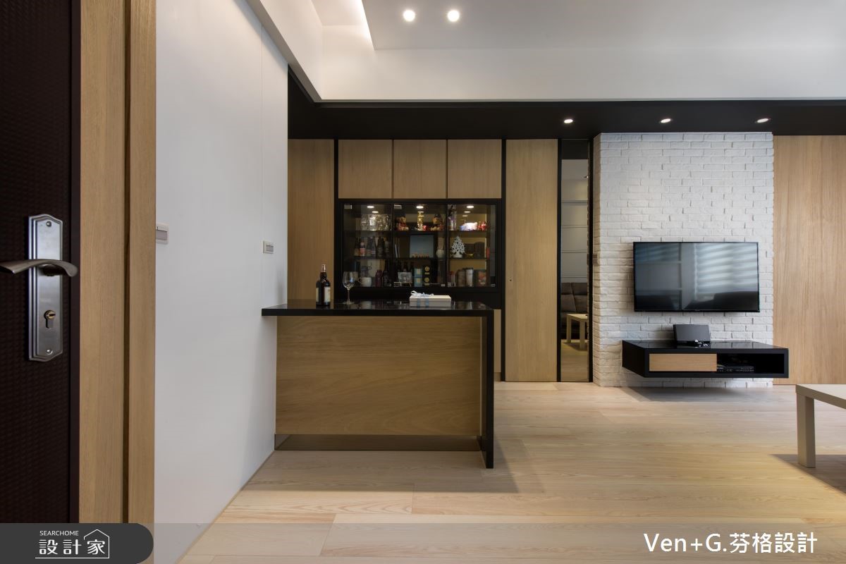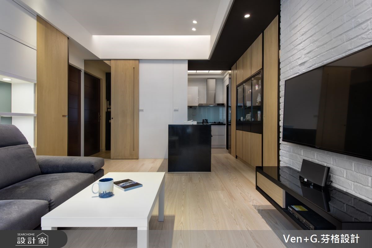 户外暖阳迎窗入室,洒落一片清爽、柔和光意,淡雅的北欧风成为空间最真实的样貌。浅色调木纹肌理铺陈地坪,深一点的原木色系成为柜体与门扇表情,调和满室温润且富层次的人文雅居。【隐藏门片,整合空间视觉感】66平方米的空间,设计师以简约的黑白色调为基底,搭配大量的木纹材质,替室内增温添色,并藉由镜面、铁件材质勾勒出立体视线,为轻盈无压的空间,增加视觉层次与丰盈的设计细节。文化石铺陈的电视墙,右侧以木作隐藏门打造主卧门扇,左侧以镜面材质创造视觉延伸的效果,接着以木作与玻璃打造柜体,满足美感展示与收纳机能;而位居厨房入口的中岛,则串连起客、餐厅与厨房领域,流畅的行走动线,让生活更自在、舒适。