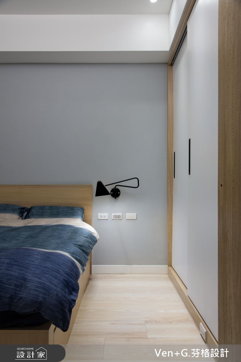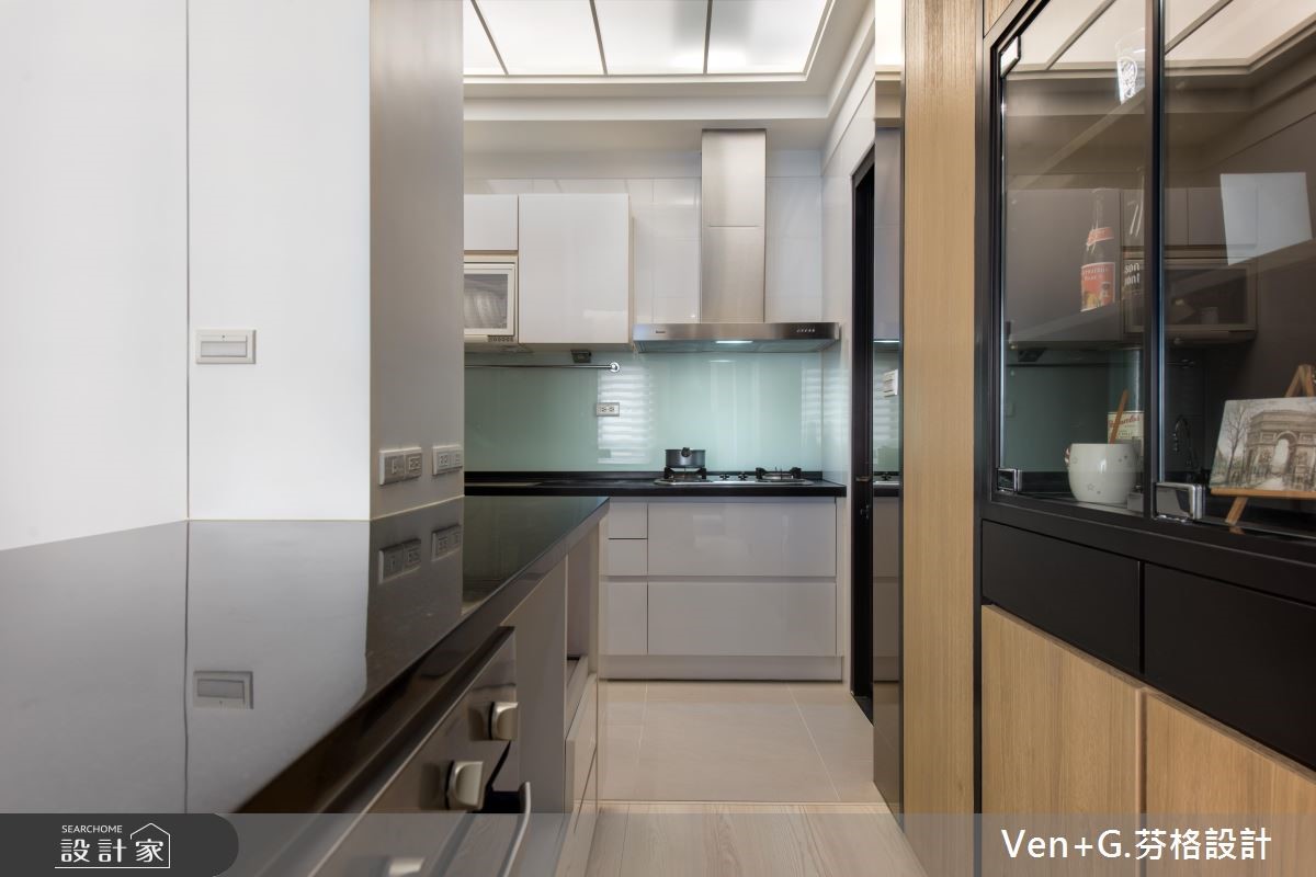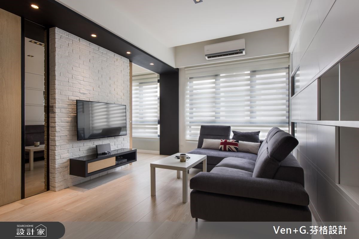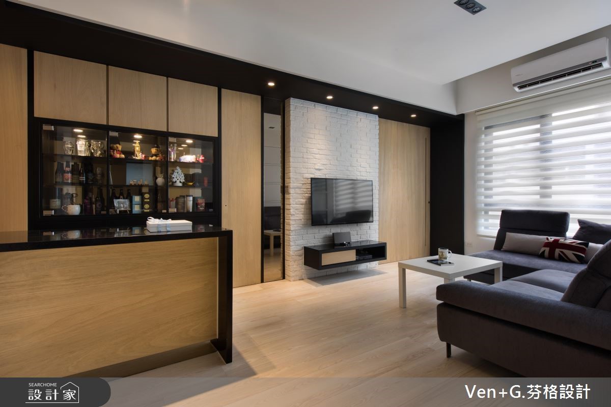 户外暖阳迎窗入室,洒落一片清爽、柔和光意,淡雅的北欧风成为空间最真实的样貌。浅色调木纹肌理铺陈地坪,深一点的原木色系成为柜体与门扇表情,调和满室温润且富层次的人文雅居。【隐藏门片,整合空间视觉感】66平方米的空间,设计师以简约的黑白色调为基底,搭配大量的木纹材质,替室内增温添色,并藉由镜面、铁件材质勾勒出立体视线,为轻盈无压的空间,增加视觉层次与丰盈的设计细节。文化石铺陈的电视墙,右侧以木作隐藏门打造主卧门扇,左侧以镜面材质创造视觉延伸的效果,接着以木作与玻璃打造柜体,满足美感展示与收纳机能;而位居厨房入口的中岛,则串连起客、餐厅与厨房领域,流畅的行走动线,让生活更自在、舒适。