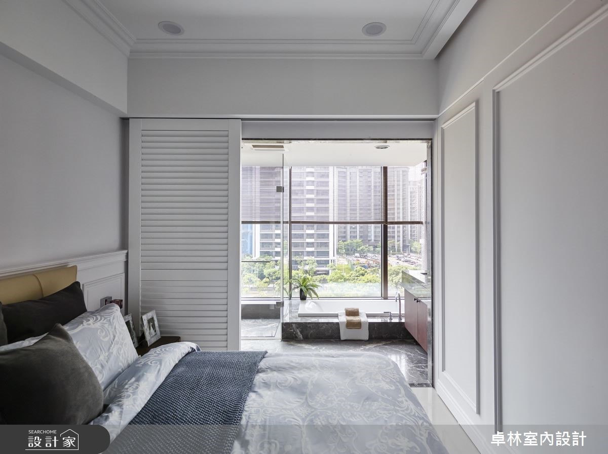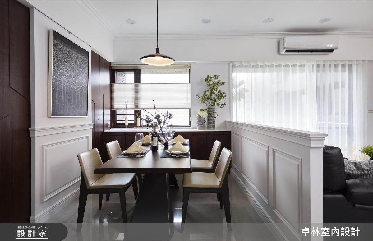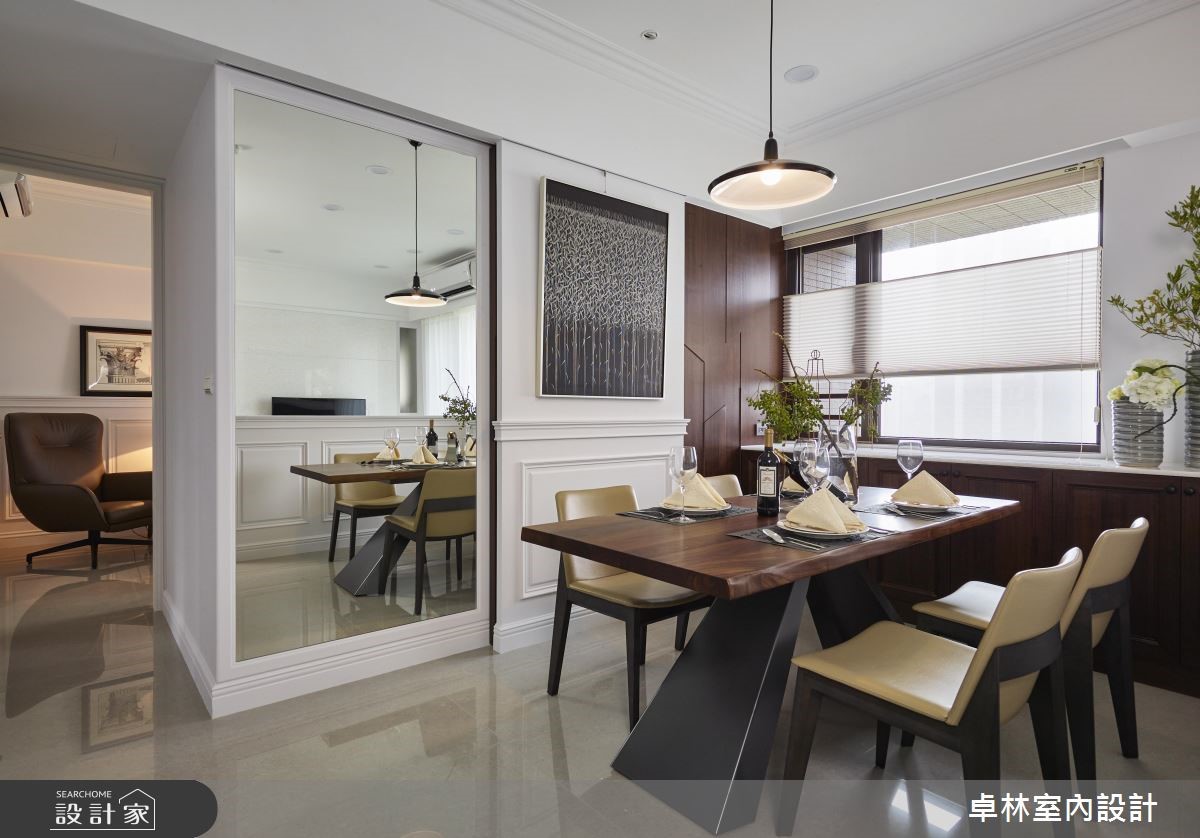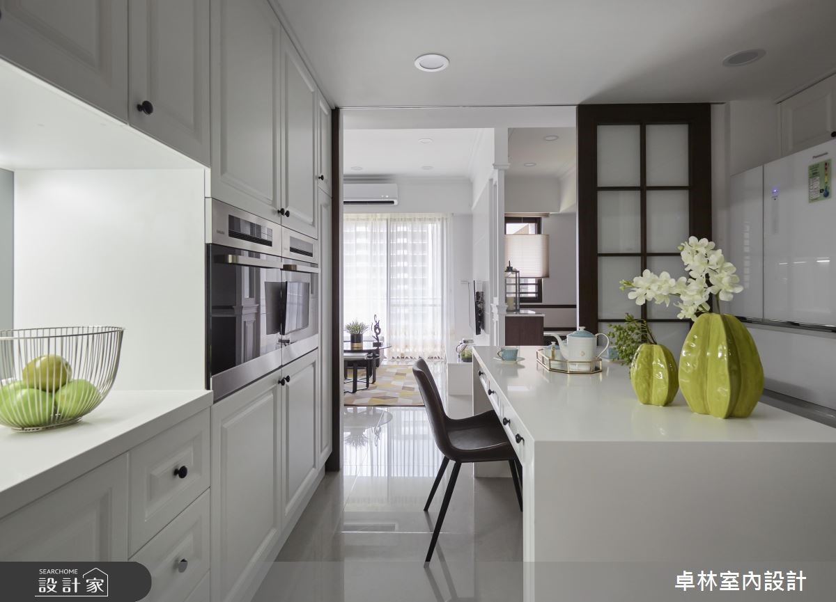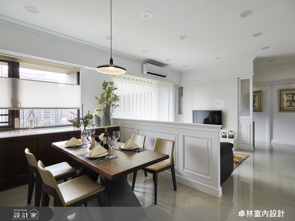 139平方米住宅,设计师刻意减少繁复的装饰元素,将美式风结合简约风,展现俐落与华美并存的居室气氛,透过白色的柔美铺叙,构筑出居者的独特品味。【优雅白底,完美衬托风格家饰】居宅以白色作为整体基底,勾勒出美式风的纯净质地,并将色彩应用转移至家具植栽,让家饰成为气氛营造的亮点,同时在墙面、天花等处,融入线板与沟缝的铺陈,堆叠干净不花俏的线性层次。格局上赋予顺畅的动线导引,从玄关开始,藉由电视墙位置,划出延伸至厅区的流畅转折,并让客厅与餐厅贴近窗面,充分浸润于自然采光之中,营造透亮的生活气场,一旁则保有开阔的居家过道,将厨房、卧房入口收整在立面,创造充满串联感、但层次分明的场域关系。