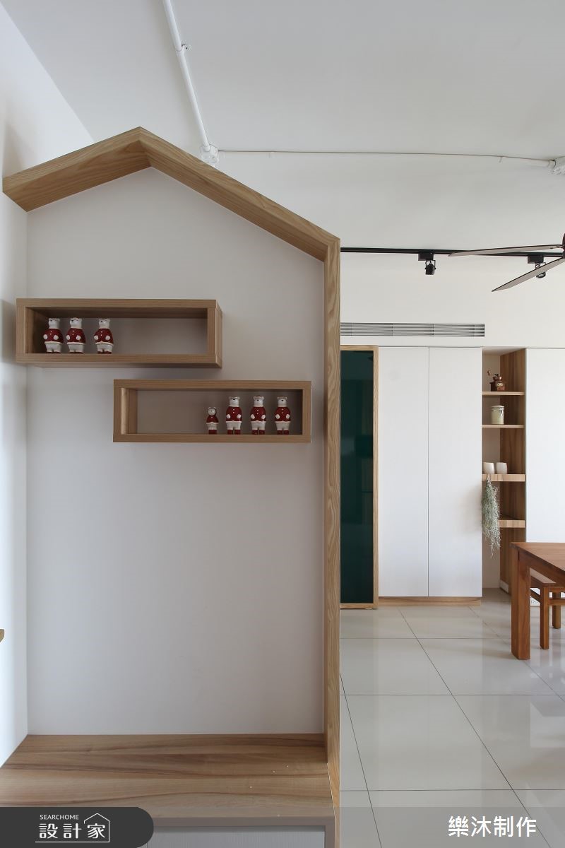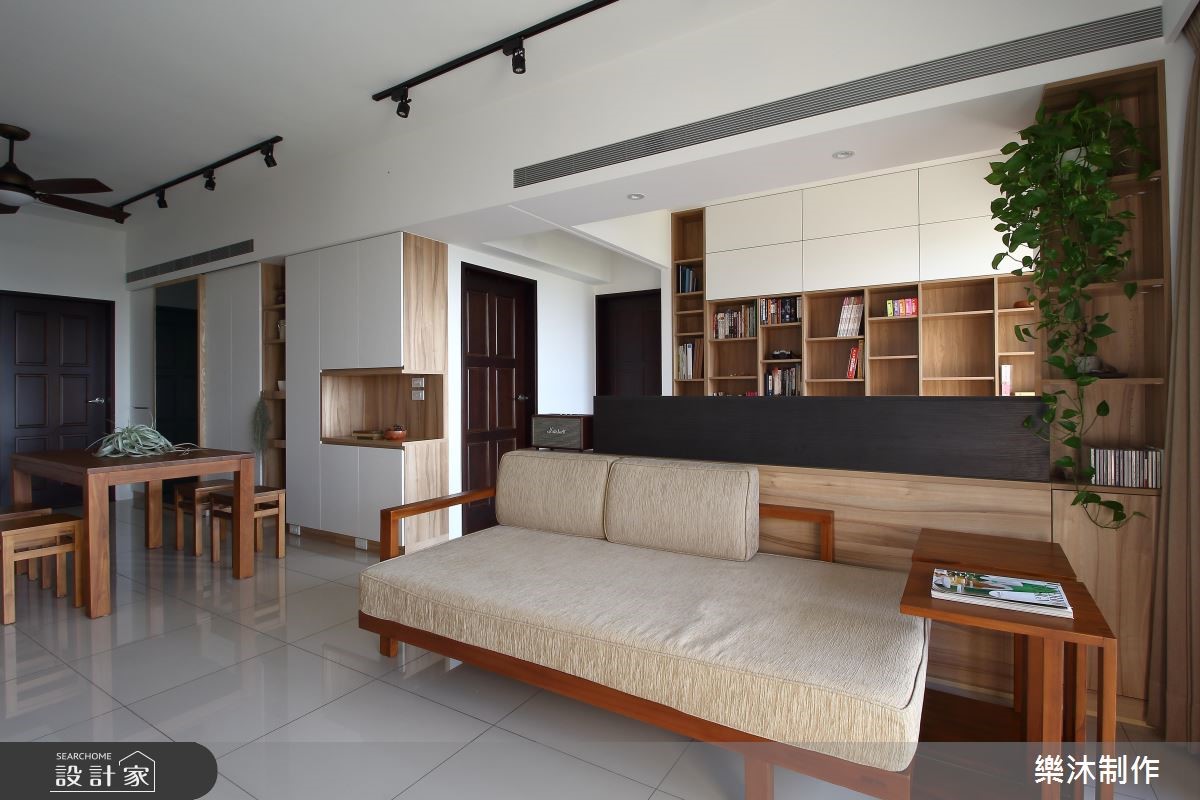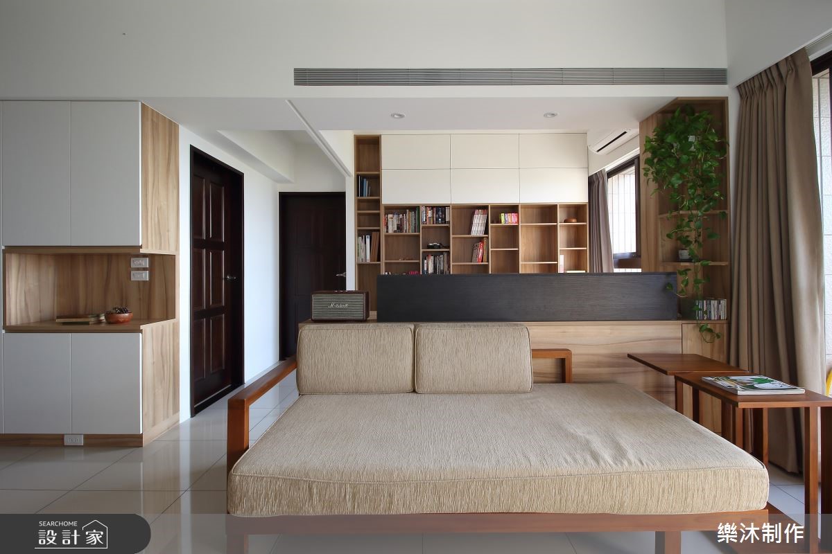 99平方米的空间,设计师以白色与大地色系作为空间基调,让干净、清爽的氛围洋溢家的每个角落,彷佛有种沐浴在自然林荫里的感受,一扫酷暑热浪的侵袭。【多变造型,推翻系统柜印象】室内大量运用系统柜规划,多变且弹性的造型与功能,创造出丰富的居家样貌。大门左侧以白色屋型柜体作隔断,中央的开放层架可作为展示区外,下方平台也兼具换鞋凳功能;右侧则打造整面原木质感的收纳柜,并延伸至电视柜体。客厅后方规划半开放式书房,临窗设计飘窗区,增加书房多重的使用机能,整面书墙皆以系统柜打造,上下两侧以封闭门片收整造型,中央则以开放柜体呈现,搭配高度不一的层板设计,交织出轻快、惬意的生活节奏。