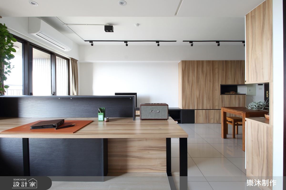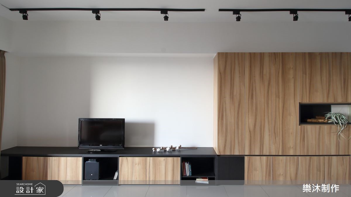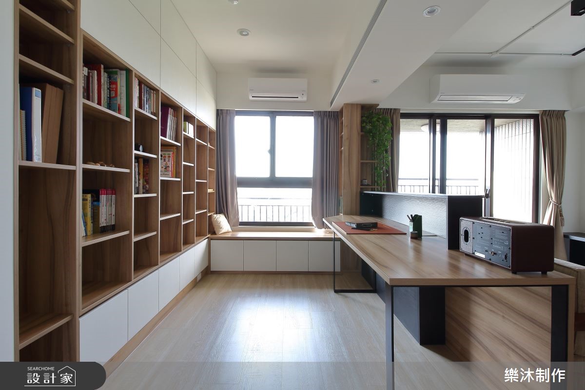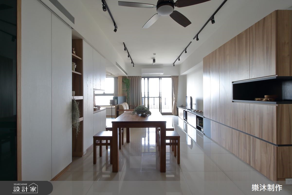 99平方米的空间,设计师以白色与大地色系作为空间基调,让干净、清爽的氛围洋溢家的每个角落,彷佛有种沐浴在自然林荫里的感受,一扫酷暑热浪的侵袭。【多变造型,推翻系统柜印象】室内大量运用系统柜规划,多变且弹性的造型与功能,创造出丰富的居家样貌。大门左侧以白色屋型柜体作隔断,中央的开放层架可作为展示区外,下方平台也兼具换鞋凳功能;右侧则打造整面原木质感的收纳柜,并延伸至电视柜体。客厅后方规划半开放式书房,临窗设计飘窗区,增加书房多重的使用机能,整面书墙皆以系统柜打造,上下两侧以封闭门片收整造型,中央则以开放柜体呈现,搭配高度不一的层板设计,交织出轻快、惬意的生活节奏。