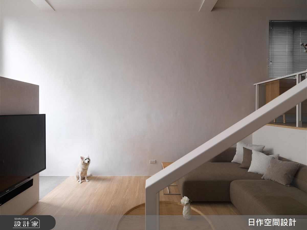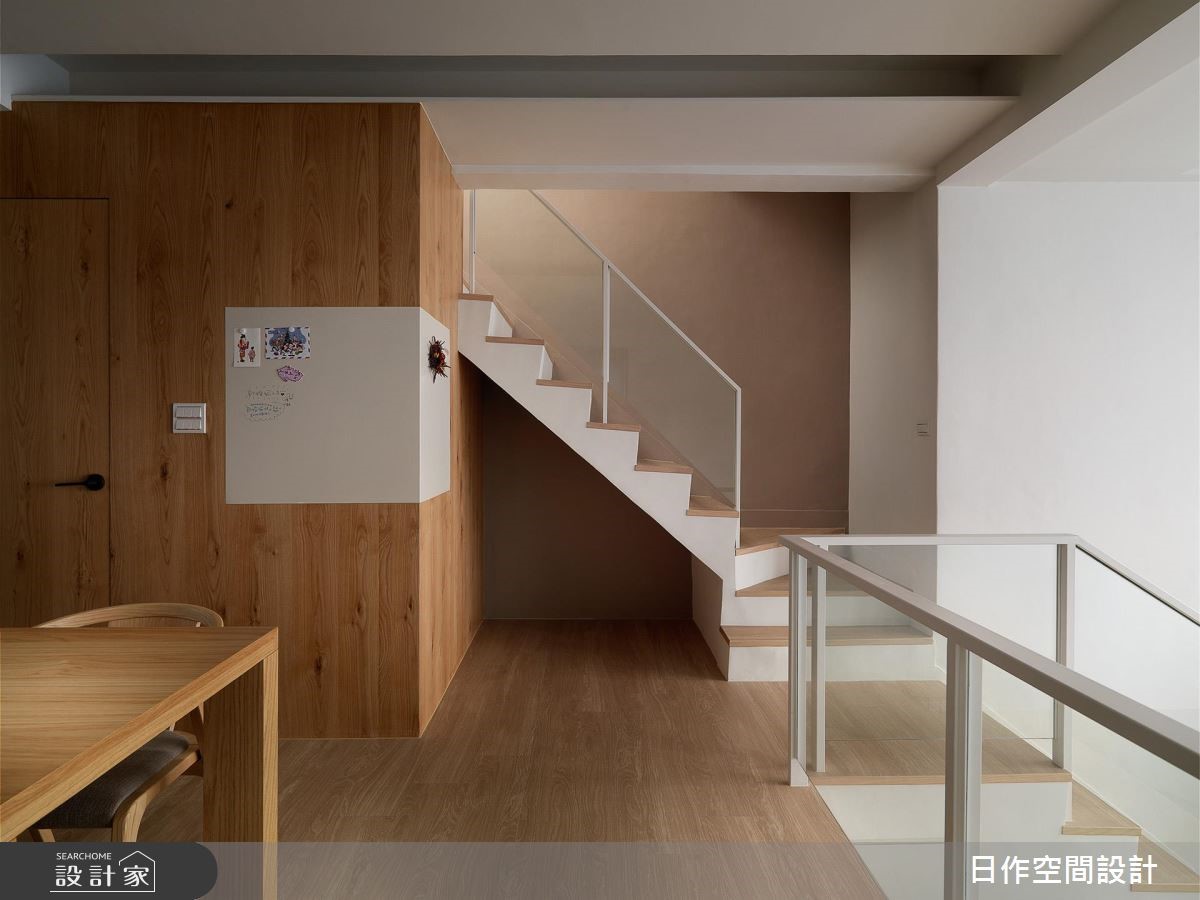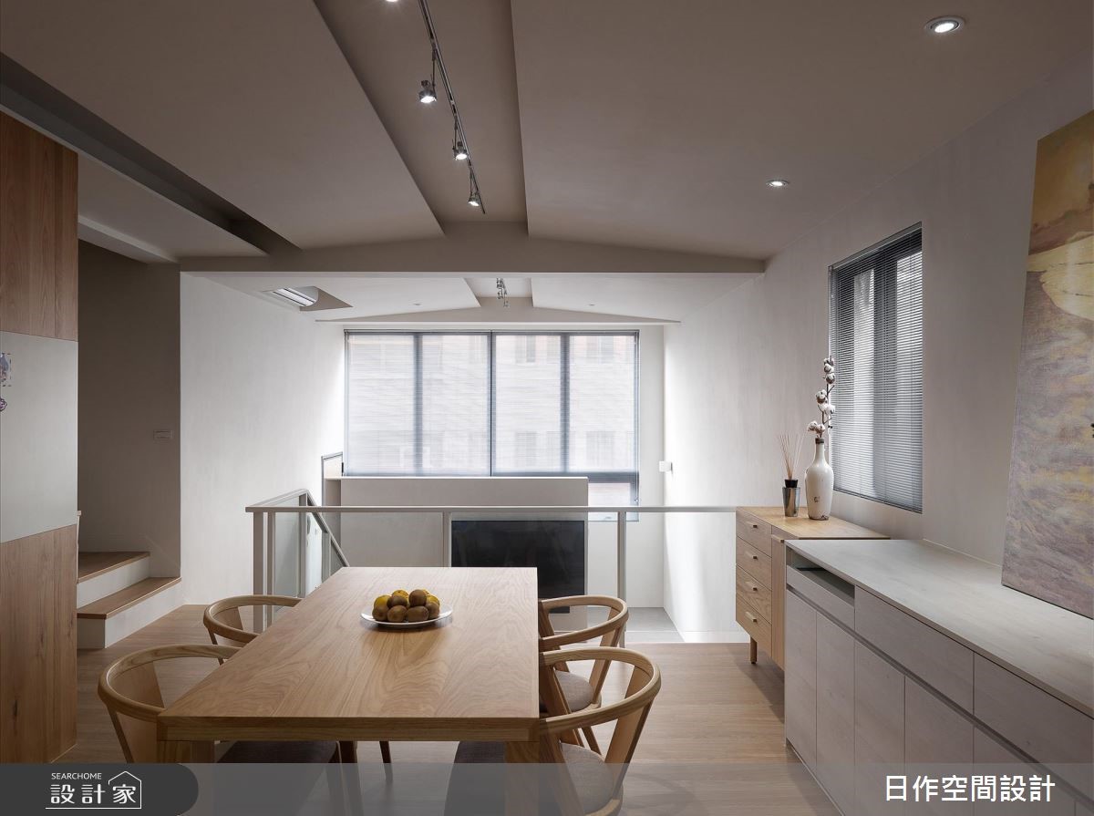 此为132平的老屋空间,设计团队将大部分预算放在老屋病灶与安全基础建设。善用大面积采光,搭配擅长的纯白色系、木地板及橡木、香杉等材质,为空间增添温柔和煦的日系简约风格。【纯白与木质搭配,自然清新】入门处巧妙以电视墙划分玄关,创造廊道,让人回到家可先沉淀心灵,转化氛围。由于有屋高优势,利用错层设计区分客厅和餐厨区,不仅创造高效的空间运用,也巧妙消弭高耸空间的空旷感。而楼梯下方也暗藏收纳,扩增机能。餐厨区则以一字型中岛搭配餐桌,延展空间格局,并增设大量柜体,强化餐厨机能。并将屋主的乐器收藏规划别致的展示橱窗,成为布置的一环。整体在纯白的色系中采用大量浅色木质,呈现优雅纯净的muji风格。