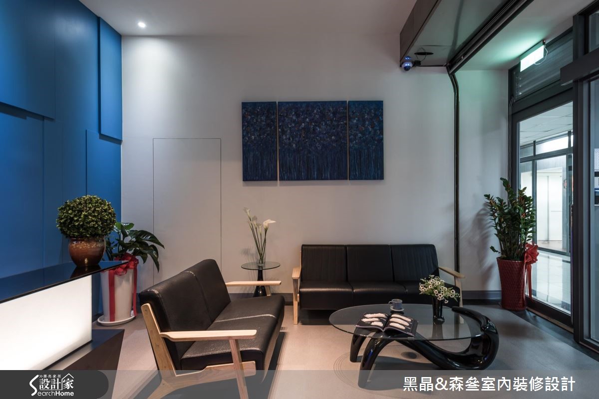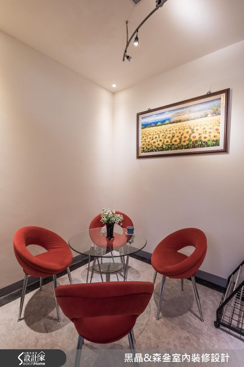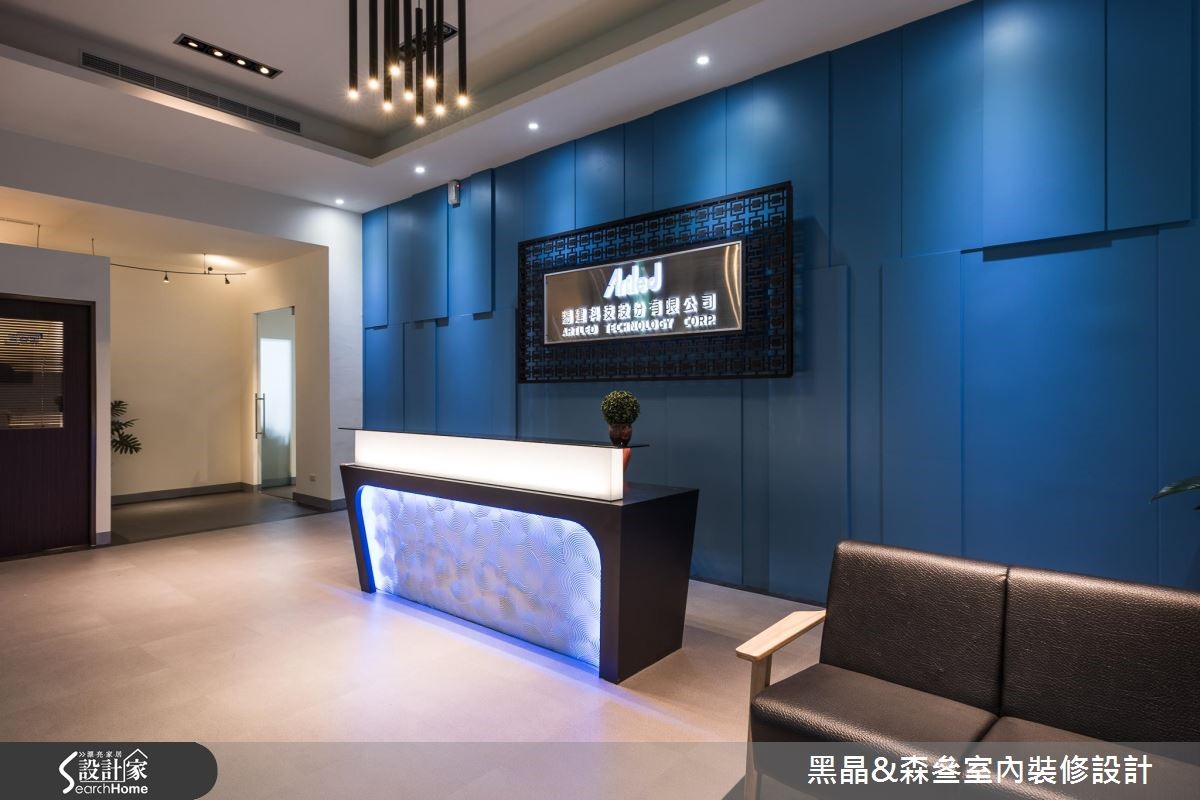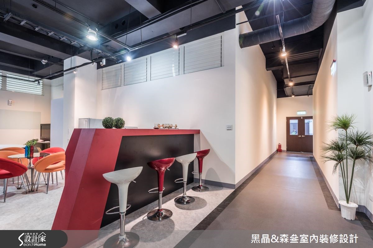 身为LED科技公司的老板,考虑前后端作业流程的沟通与程序,希望能将办公区与工厂做结合;因此,设计师以简约的现代风格为设计主轴,藉由饱和色系的家具或壁面,并搭配艺术画作装饰,创造出独特的时尚美感。【善用颜色,为空间增添活泼氛围】入口柜台处,以宝蓝色系的层次立面打造主体墙,中央悬挂一扇镂空感的黑铁件结构,衬托以LED灯描绘的品牌LOGO;而柜台中央则结合雷射切割的透亮材质,并以内嵌照明的手法,营造出独特情境。考虑经营进口的LED灯具及特殊面板,设计师利用壁面来展示产品特质,不仅传递品牌设计,还可妆点出充满艺术美感的工作氛围;而公共空间里,更替员工打造休憩区,时尚红的吧台以斜角为造型,摆设几张红白相间的高脚椅,营造活力四射的空间氛围。