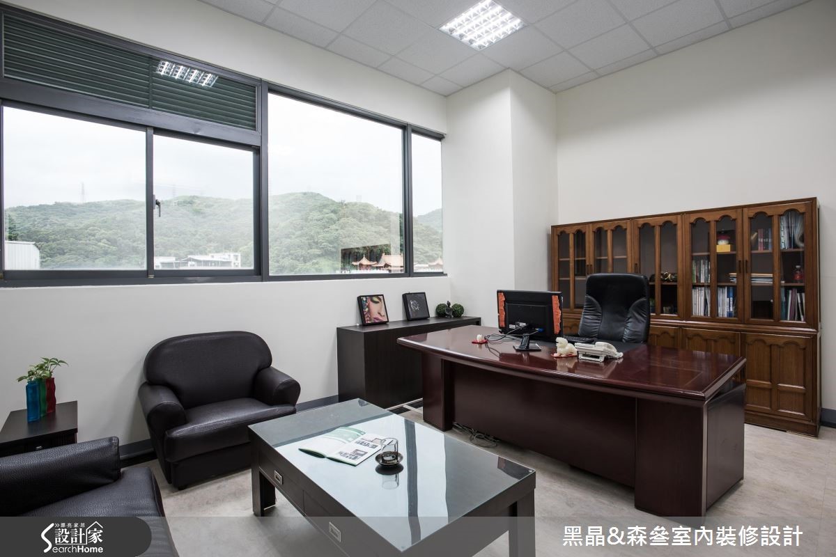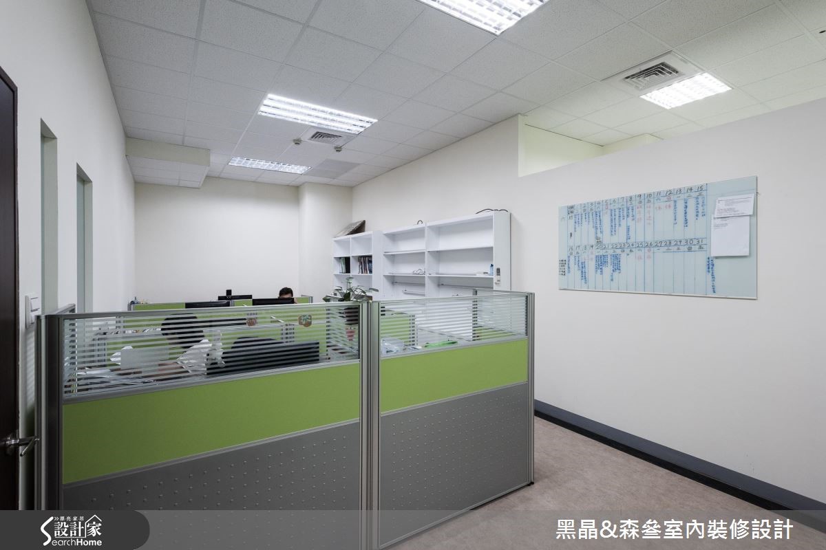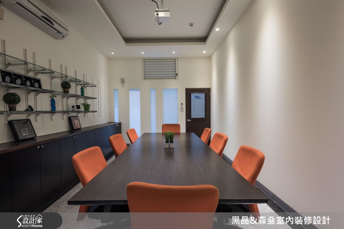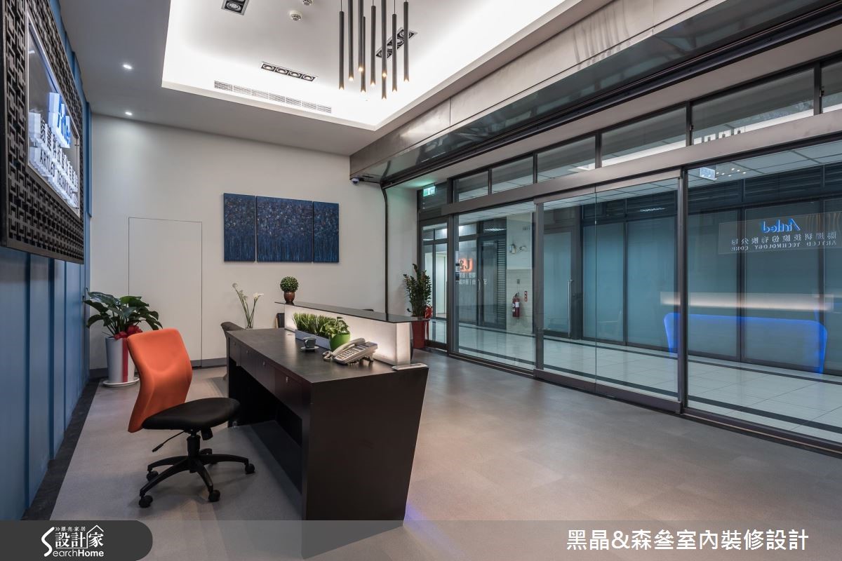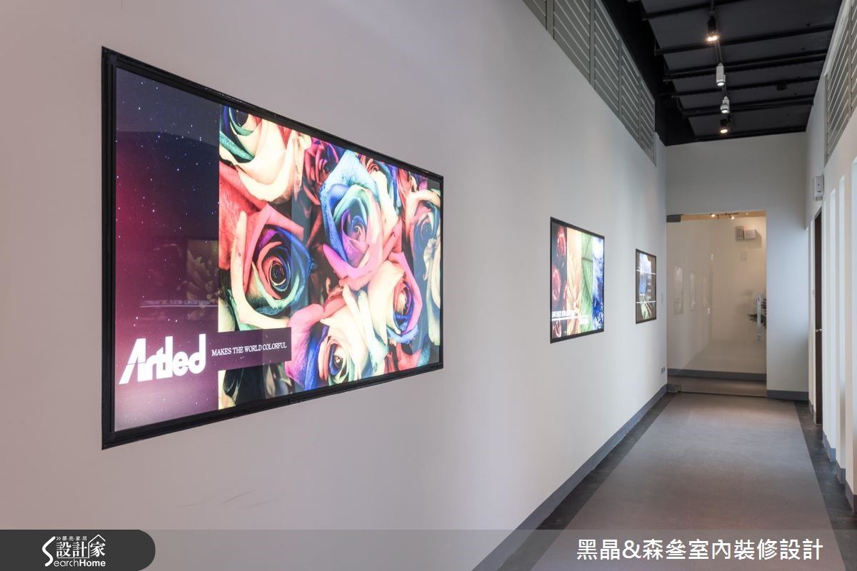 身为LED科技公司的老板,考虑前后端作业流程的沟通与程序,希望能将办公区与工厂做结合;因此,设计师以简约的现代风格为设计主轴,藉由饱和色系的家具或壁面,并搭配艺术画作装饰,创造出独特的时尚美感。【善用颜色,为空间增添活泼氛围】入口柜台处,以宝蓝色系的层次立面打造主体墙,中央悬挂一扇镂空感的黑铁件结构,衬托以LED灯描绘的品牌LOGO;而柜台中央则结合雷射切割的透亮材质,并以内嵌照明的手法,营造出独特情境。考虑经营进口的LED灯具及特殊面板,设计师利用壁面来展示产品特质,不仅传递品牌设计,还可妆点出充满艺术美感的工作氛围;而公共空间里,更替员工打造休憩区,时尚红的吧台以斜角为造型,摆设几张红白相间的高脚椅,营造活力四射的空间氛围。