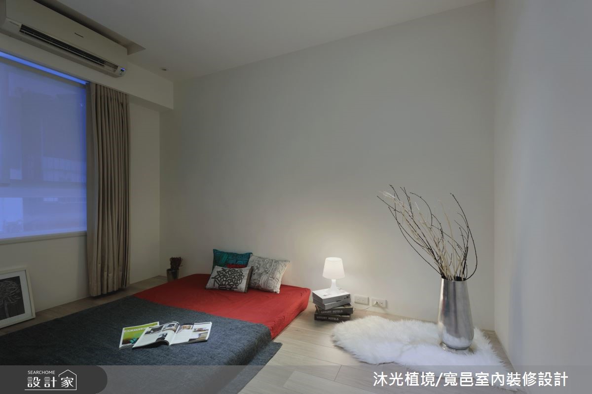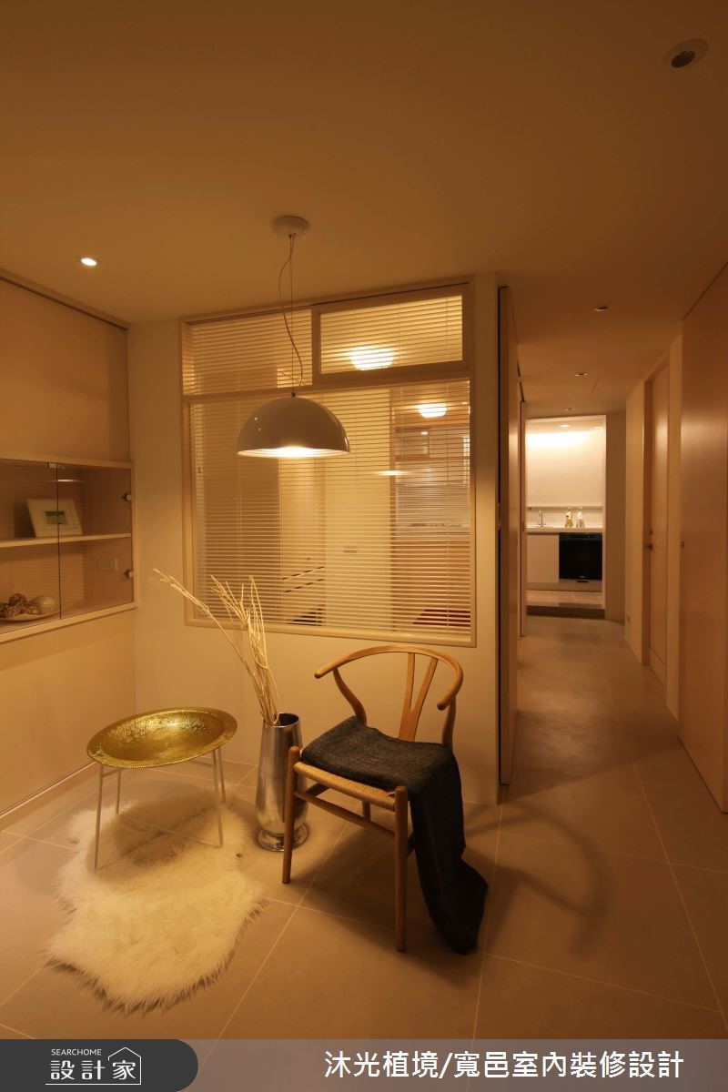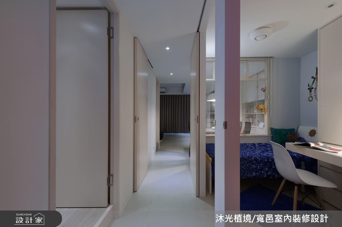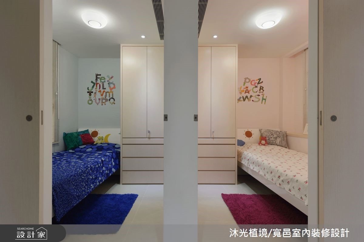 69平方米的老屋,设计师藉由格局重整,以简约现代感的设计,重新定义动线、格局与领域间的连结方式,不仅一扫老屋存在的光线与湿气问题,更巧妙让空间变得更加宽敞。【善用颜色搭配,打造风格空间】以白色系作为室内基底,简约、干净的线条勾勒出现代风情。客厅以L型咖啡色系沙发摆设,定位出核心领域,同时也注入温润的气息,素雅且细腻的织品转化成地毯风景,与印花描绘的抱枕造型相互呼应;并于后方打造书房以及收纳区,充分利用空间各居室皆利用活动式推门,灵活界定出领域,并以玻璃为隔断,藉由穿透的材质特性,让空间更放大;而小孩房则以中间的隔断墙为核心,创造出对称的视觉设计,且运用深浅配色诠释性别之分,壁面更透过缤纷的英文拼贴手法,洋溢着充满想像的童趣。
