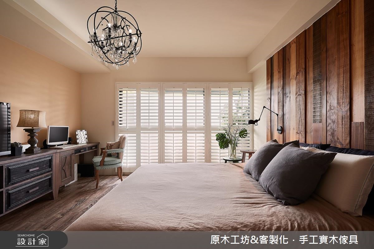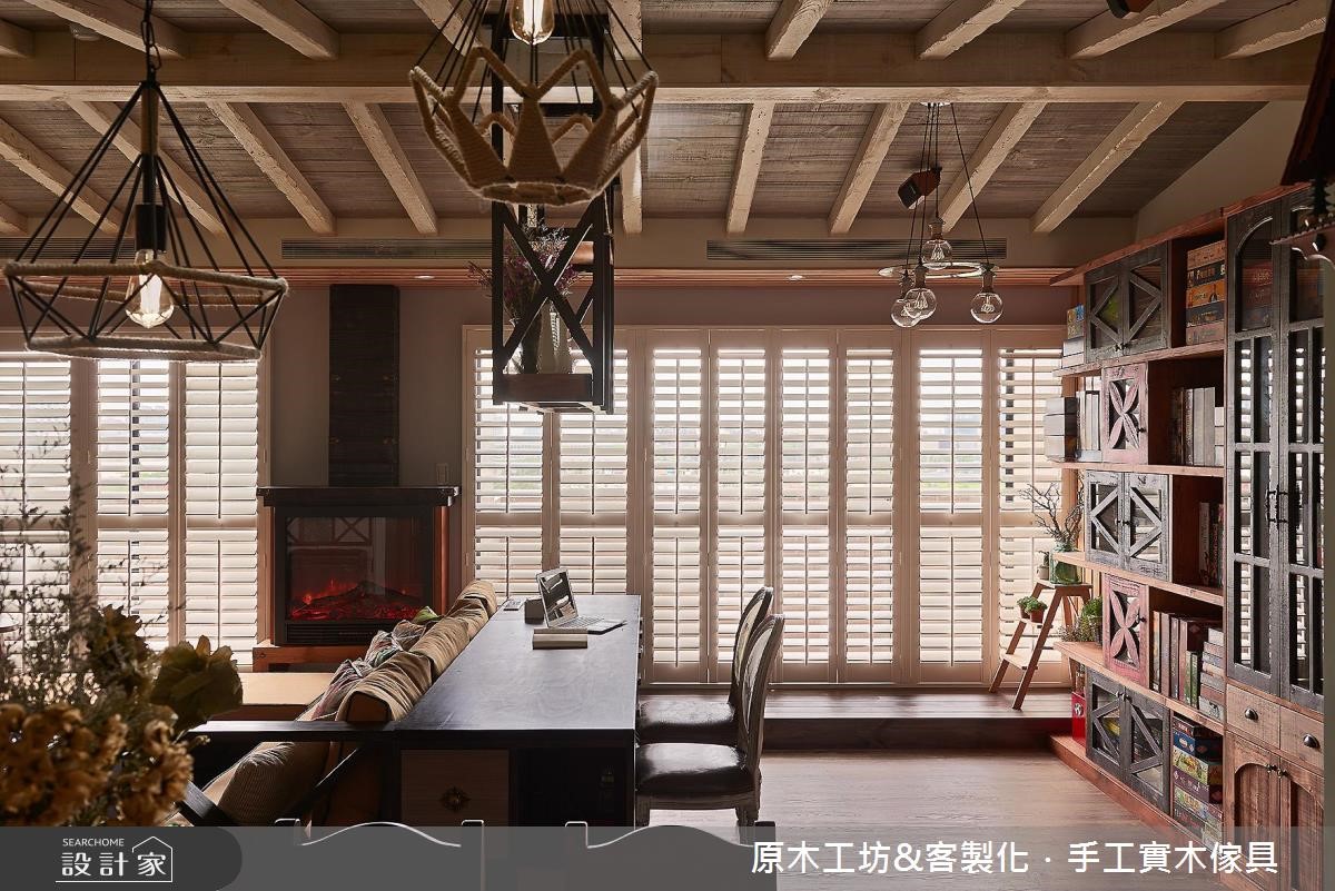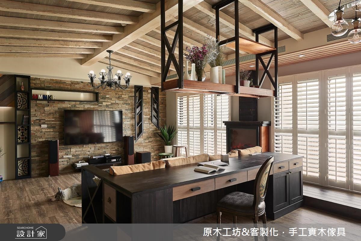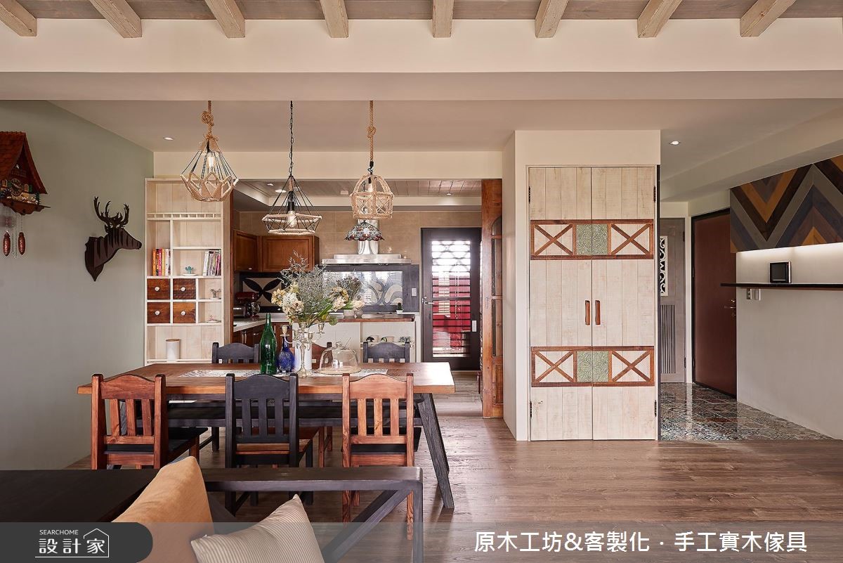 喜欢原木质感,却担心甲醛问题,或是烦恼建材不够健康、环保。那么不妨来参考这对新婚夫妻和4只狗宝贝的149平米新家。设计师从健康自然、友善宠物的设计观点出发,舍弃了木贴皮,运用进口实木材质,打造出独特有型、具有欢乐温馨感的混搭风住宅! 【大量木元素,打造温馨乡村风情】屋主平时喜爱社交和玩桌游,加上需要大空间让宠物们活动跑跳,因此设计师将客厅和餐厅以开放式的规划,让空间更加开阔和放大,斜顶的木屋天花板设计也提升了整体的视觉高度,同时富有度假风情。收纳设计方面,由于屋主所收藏的桌上游戏非常多,甚至可以放满整整一面墙,因此设计师在以多彩柜体,量身定制出独一无二的收纳展示区。客厅靠墙处则规划了屋主期望的壁炉设计,增添了欧式乡村的温馨暖度。主卧室内包含了更衣室的设计,同样运用大量的木质元素,藉由木头的纹痕,表现出复古自然的温润质感。