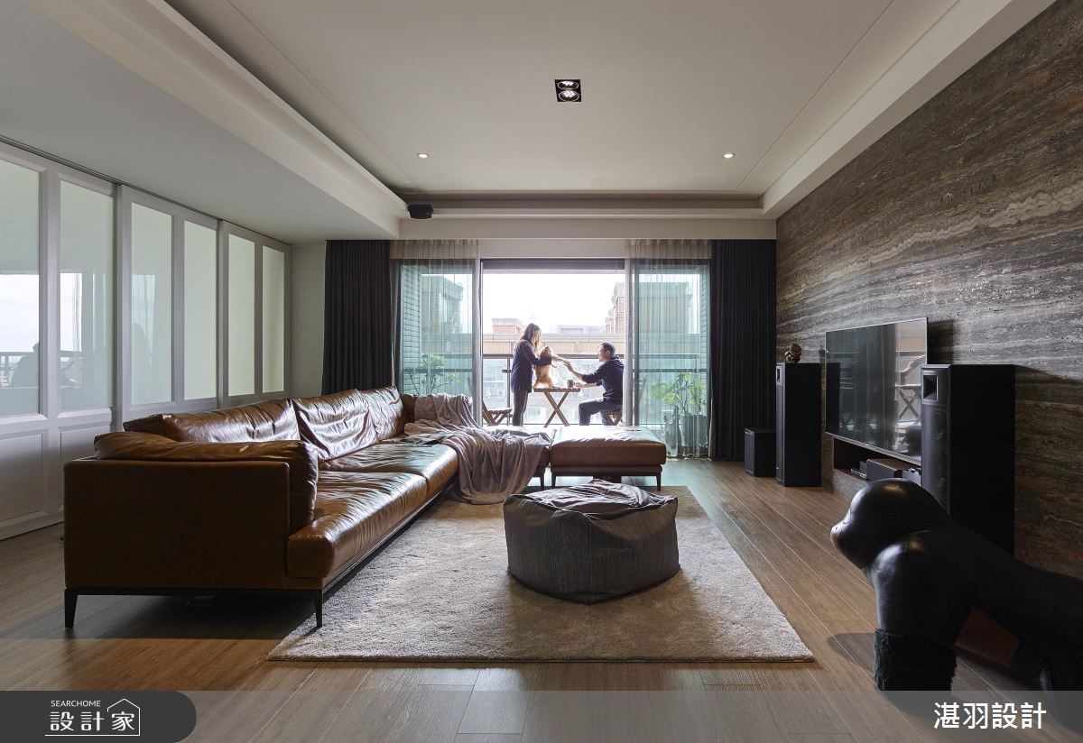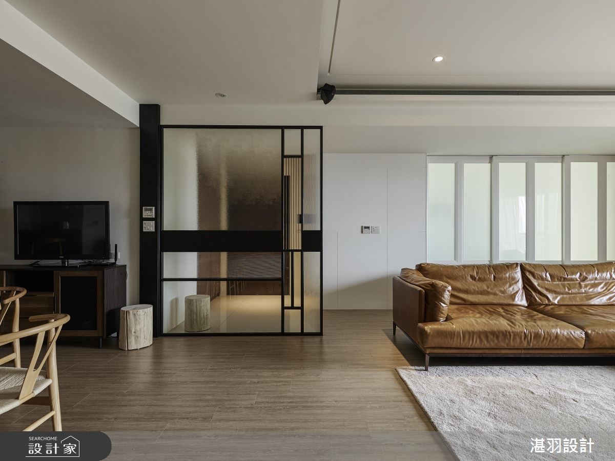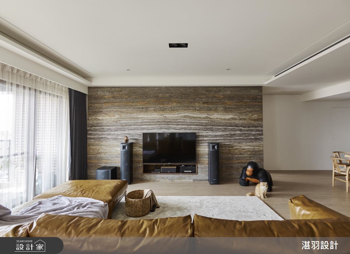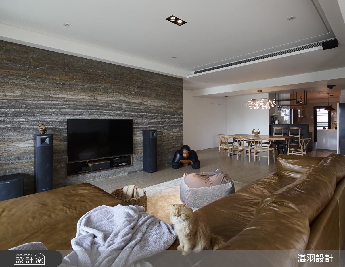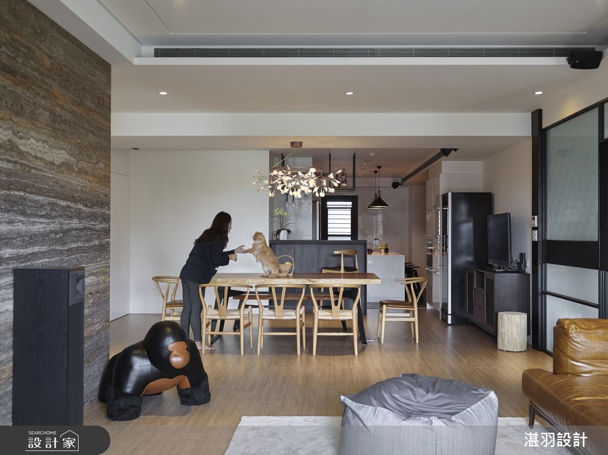 与长辈同住,且饲有猫咪的居家空间,设计师以沉稳自然的木质和石材色泽,带来舒适温润的生活氛围,而宽敞开放的公共空间,连结了户外阳台的风光景色,营造出纾压、疗愈的自在感。【开放式格局,营造宽敞无压空间】设计师以清透的铁件玻璃屏风划分领域,同时也让玄关享有明亮的光感;进入公共空间,沉稳大器的木、石色调,沉淀了空间的氛围,客厅、餐厅与厨房则在平面中依序展开,敞亮的开放式设计,成为全家人团聚、联络感情的区域,而宠物也能拥有足够的活动空间。 餐厨区的安排包含吧台和用餐区,满足多种用餐情境,更以灯饰凝聚了视觉焦点,在简洁的空间调性中,注入精致质感;卧室承袭了木质的温润调性,并依据不同居住者需求,分别赋予更衣间、卫浴等机能,满足生活的舒适度。
