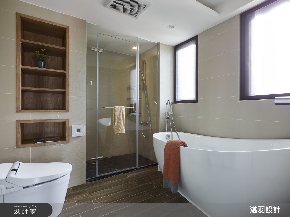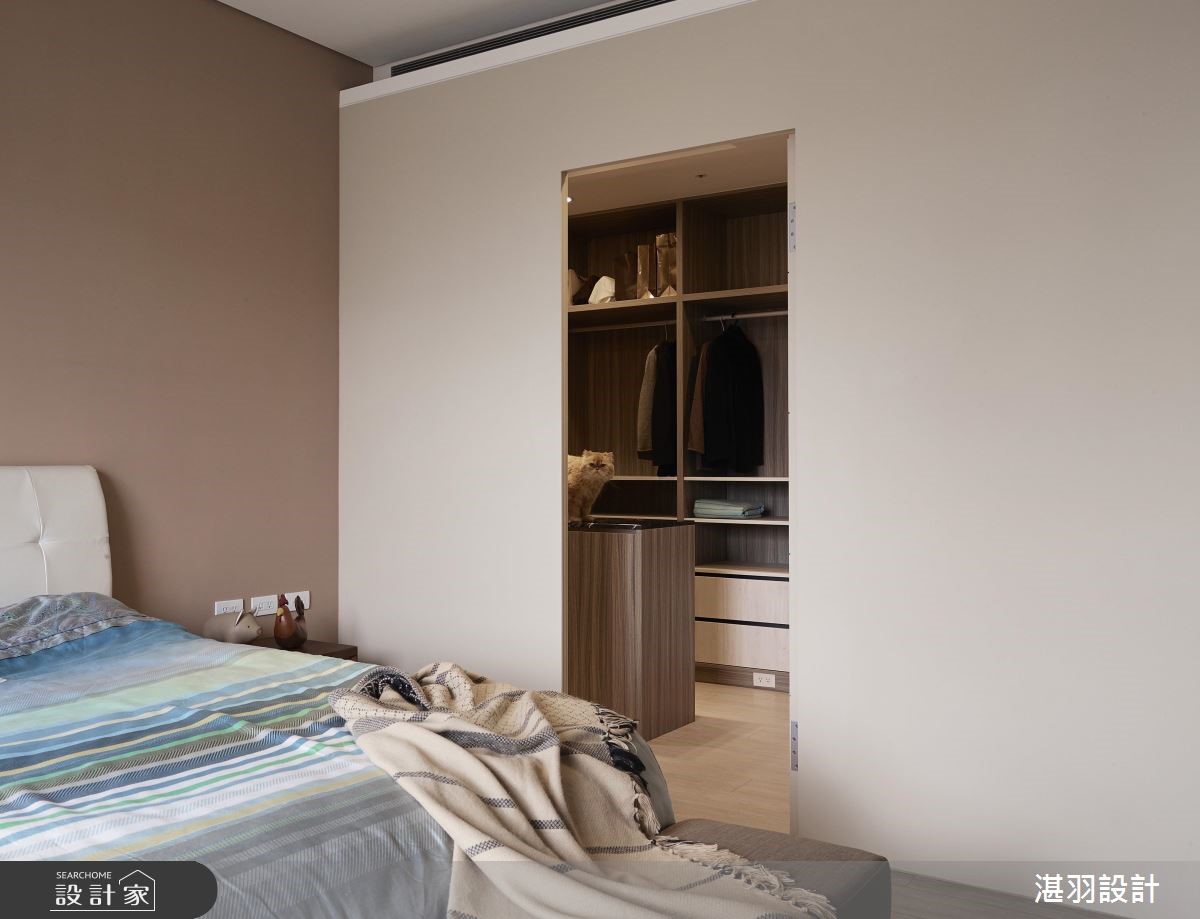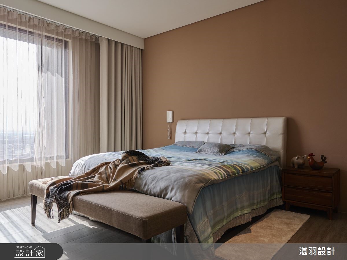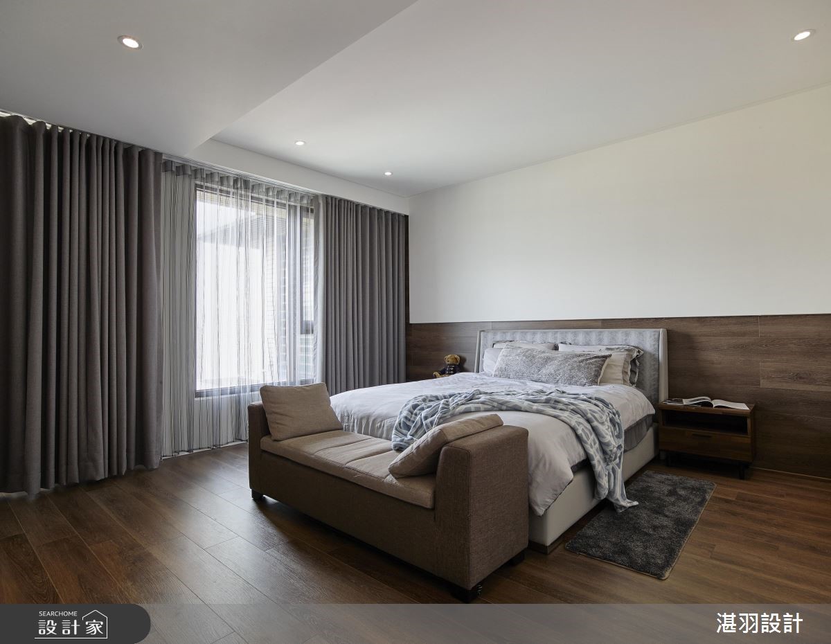 与长辈同住,且饲有猫咪的居家空间,设计师以沉稳自然的木质和石材色泽,带来舒适温润的生活氛围,而宽敞开放的公共空间,连结了户外阳台的风光景色,营造出纾压、疗愈的自在感。【开放式格局,营造宽敞无压空间】设计师以清透的铁件玻璃屏风划分领域,同时也让玄关享有明亮的光感;进入公共空间,沉稳大器的木、石色调,沉淀了空间的氛围,客厅、餐厅与厨房则在平面中依序展开,敞亮的开放式设计,成为全家人团聚、联络感情的区域,而宠物也能拥有足够的活动空间。 餐厨区的安排包含吧台和用餐区,满足多种用餐情境,更以灯饰凝聚了视觉焦点,在简洁的空间调性中,注入精致质感;卧室承袭了木质的温润调性,并依据不同居住者需求,分别赋予更衣间、卫浴等机能,满足生活的舒适度。