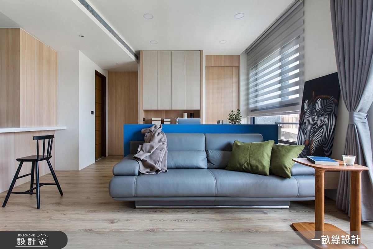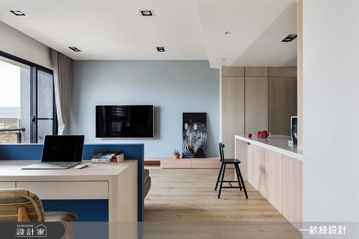 82平方米两室的小户型格局,利用开放设计、木质调与柔和色彩,打造无论是新婚族或小家庭都适合的空间。【开放式设计,置入隐性分界】针对小家庭重视的收纳机能设计,设计师由玄关穿鞋椅旁拉伸大面积棱角的设计柜体,接续电视墙下方矮柜;其次,开放式书房除了侧边的飘窗下方设有置物机能,后方柜体亦能提供充裕收纳量。公领域则以开放设计串连客厅、多功能书房及餐厨,并结合沙发矮墙及书桌的手法,巧妙划分隐形界线。考虑场地、烹饪习性及使用人口,以中岛吧台结合餐桌,并与一字型厨房平行,创造流畅烹饪动线,更能大幅提升居住成员间的互动。为了创造宽敞的视觉效果,除了开放设计,设计师还采用色调轻浅的强化复合地板与实木皮,搭配电视墙沉静的灰蓝色调,为公领域创造清爽、开阔的感受。