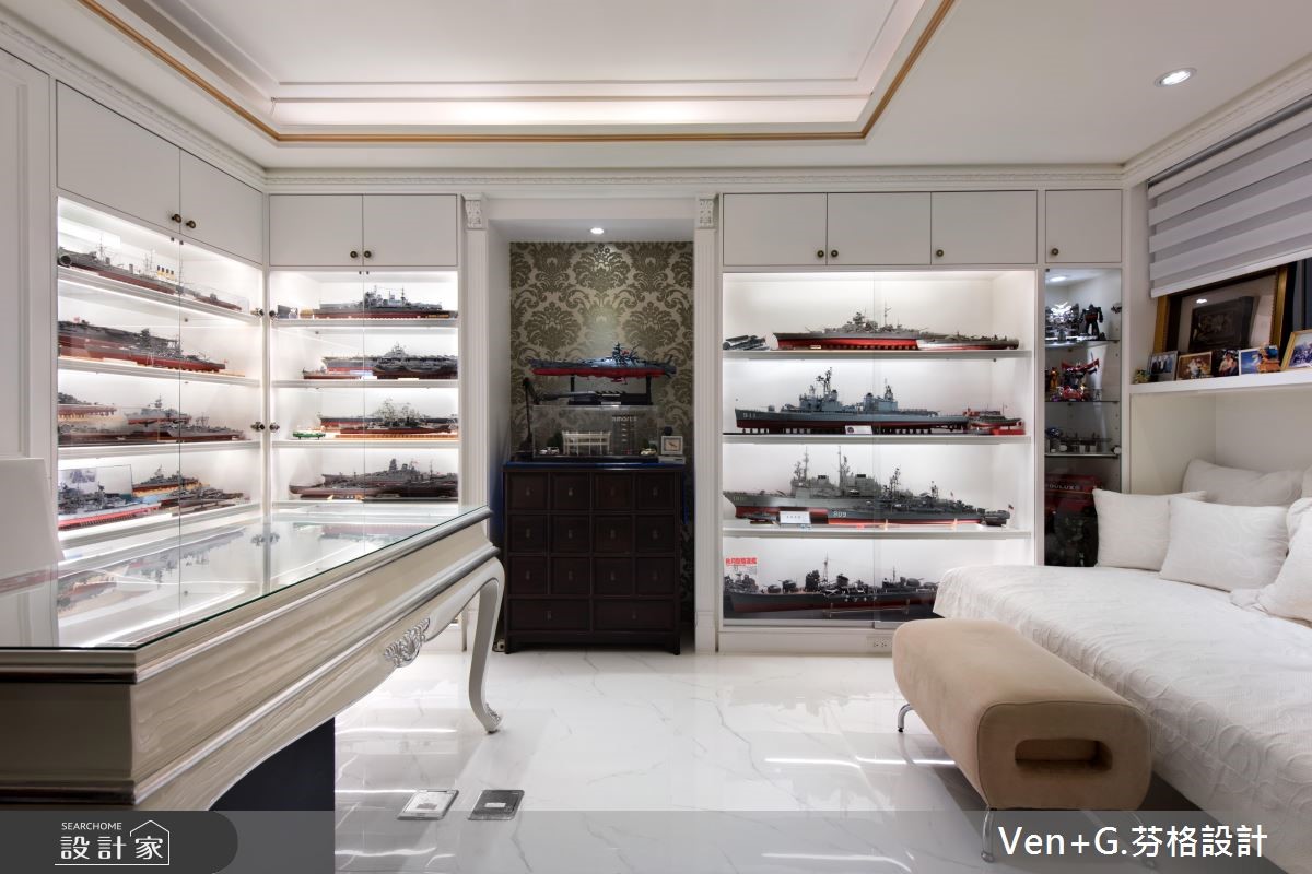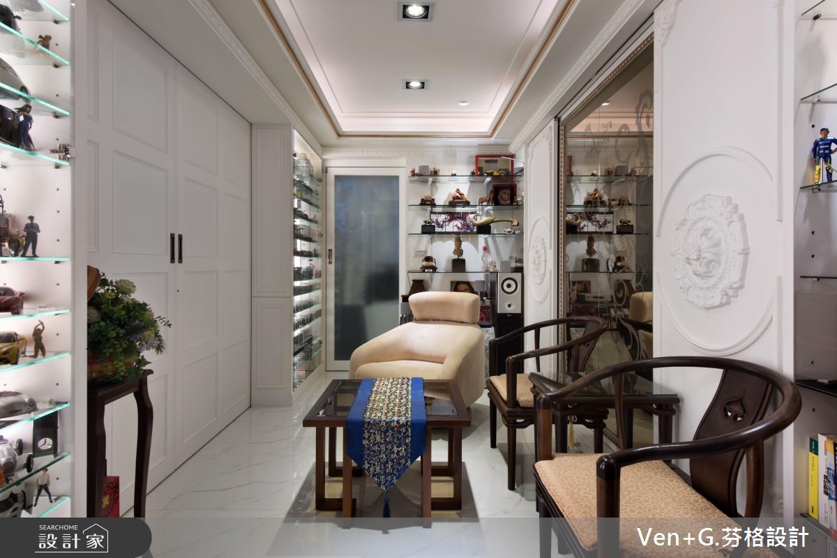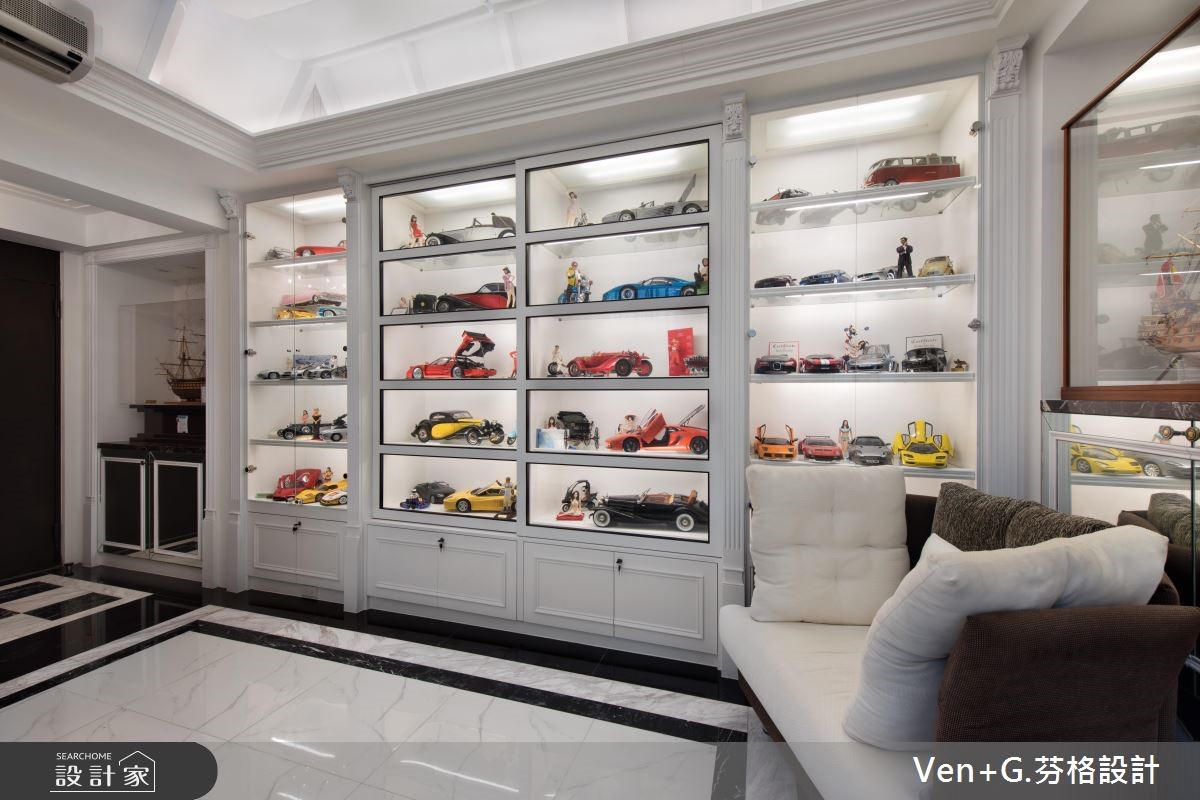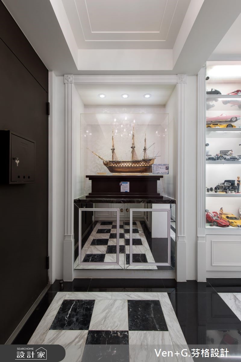 女屋主钟情于巴洛克新古典风情,而男屋主则坐拥大量的模型公仔,强调展示收纳机能,于是设计师将华丽元素结合童趣收藏,透过柜体、家具、装饰等恰到好处的分配,将二者需求融合,重塑老屋的新风貌。【独特收藏品,妆点居家特色】玄关区运用黑白色系,搭配镜柜与展示物,凝聚入门后的奢华印象,一旁则可见到犹如橱窗般的净透收纳柜,让收藏物成为空间焦点,引述着生活的趣味;公共领域藉由线板、家具、灯饰等框造如画的场景,同时让窗面结合风雅窗帘,在优美布艺中展现新古典的雍容大器。卧房内,融入浪漫紫色以及银色系家具,搭配雕花流线与鲜明独特的床头表情等,以大胆但不突兀的设计,诠释新古典特有的空间魅力;并于靠窗处做出架高地板,规划飘窗兼书房,充裕的窗光照拂,打造出专属个人的纾压阅读天地。