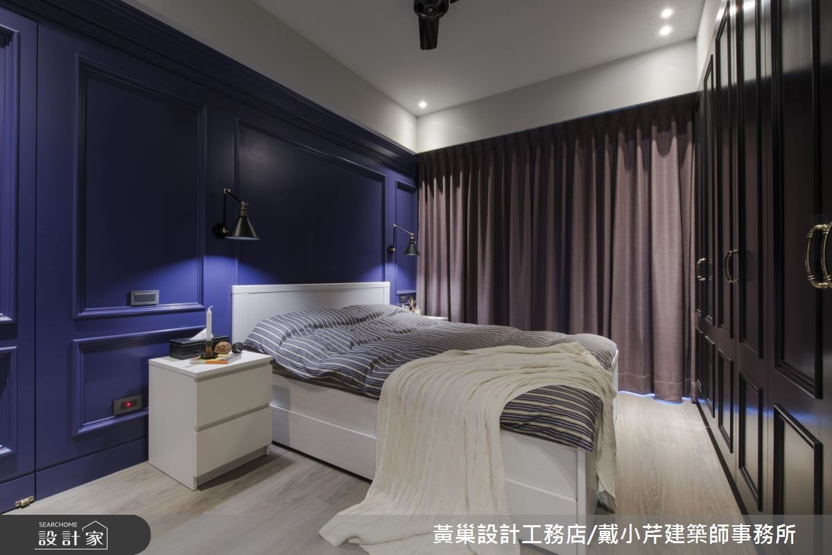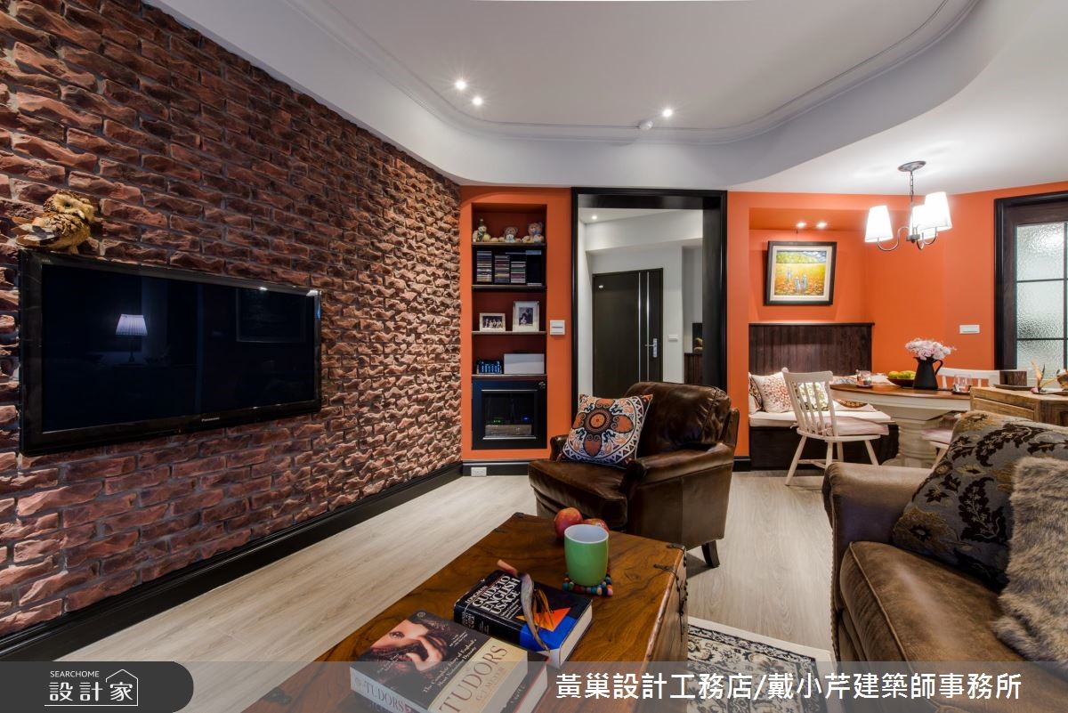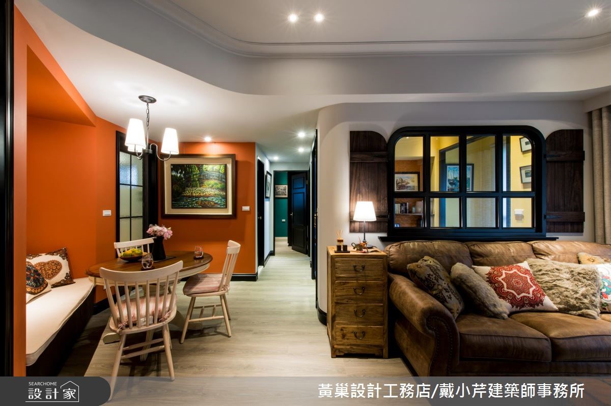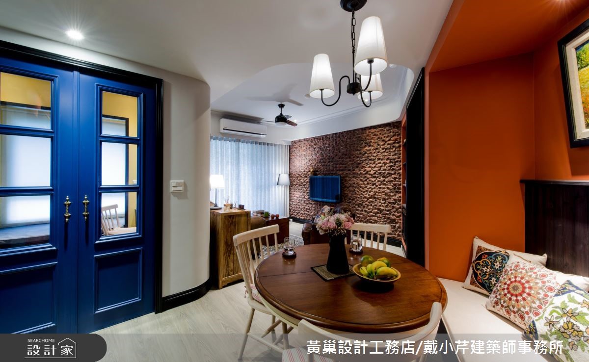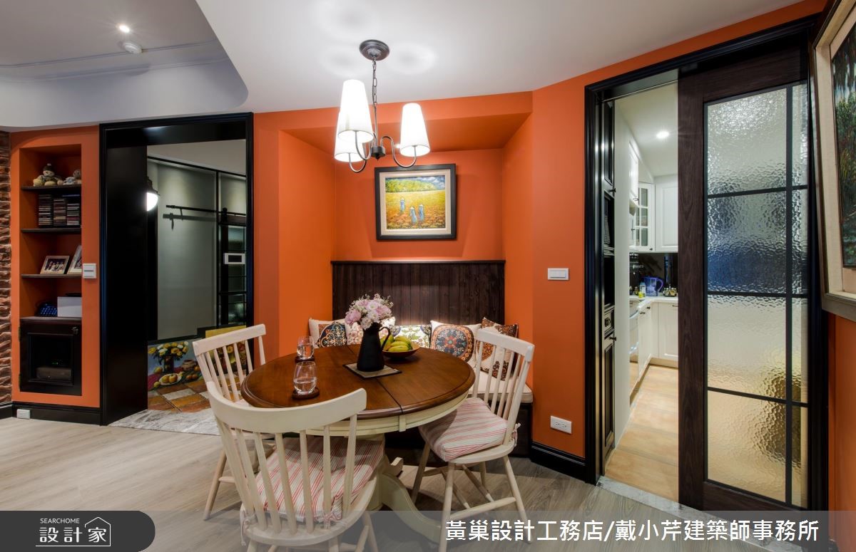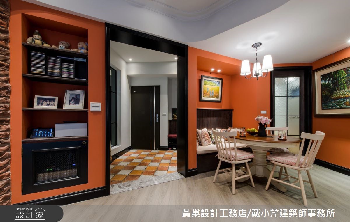 这间83平方米的新屋,由于从开始就和设计师合作,因此量身客变(客户变更;建设公司在施工阶段依照屋主需求,预先提供变更格局、设备等服务),从动线、色调到风格营造,形塑都会女子专属的美式乡村宅。 【注入橘红主色,提升活泼气质】玄关以廊道设计彰显美式乡村风格特色,并加入储藏室提供充裕收纳。进入公共领域则以开放设计串连客餐厅,利用包间式设计配上一座飘窗,让用餐人数更有弹性。 于材质与色调的选用上,玄关利用浅灰色壁面,搭配亮眼的橙白复古地砖做铺陈。客餐厅则以橘红色调为主色,呼应粗犷的砖红文化石;延伸至书房,改由鲜明的黄色和宝蓝色形成跳色趣味,营造多维却不显杂乱的色彩美学。 巧妙以黑色烤漆为踢脚与门框收尾,展现沉稳富有质调的风格。主卧则以浪漫的熏衣草紫为基底,床头墙的紫色烤漆与造型线板,将通往卫浴空间的入口巧妙隐藏,形塑优雅气派的背景。