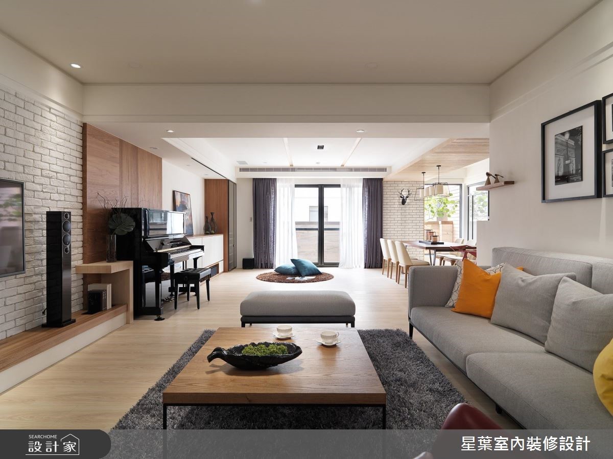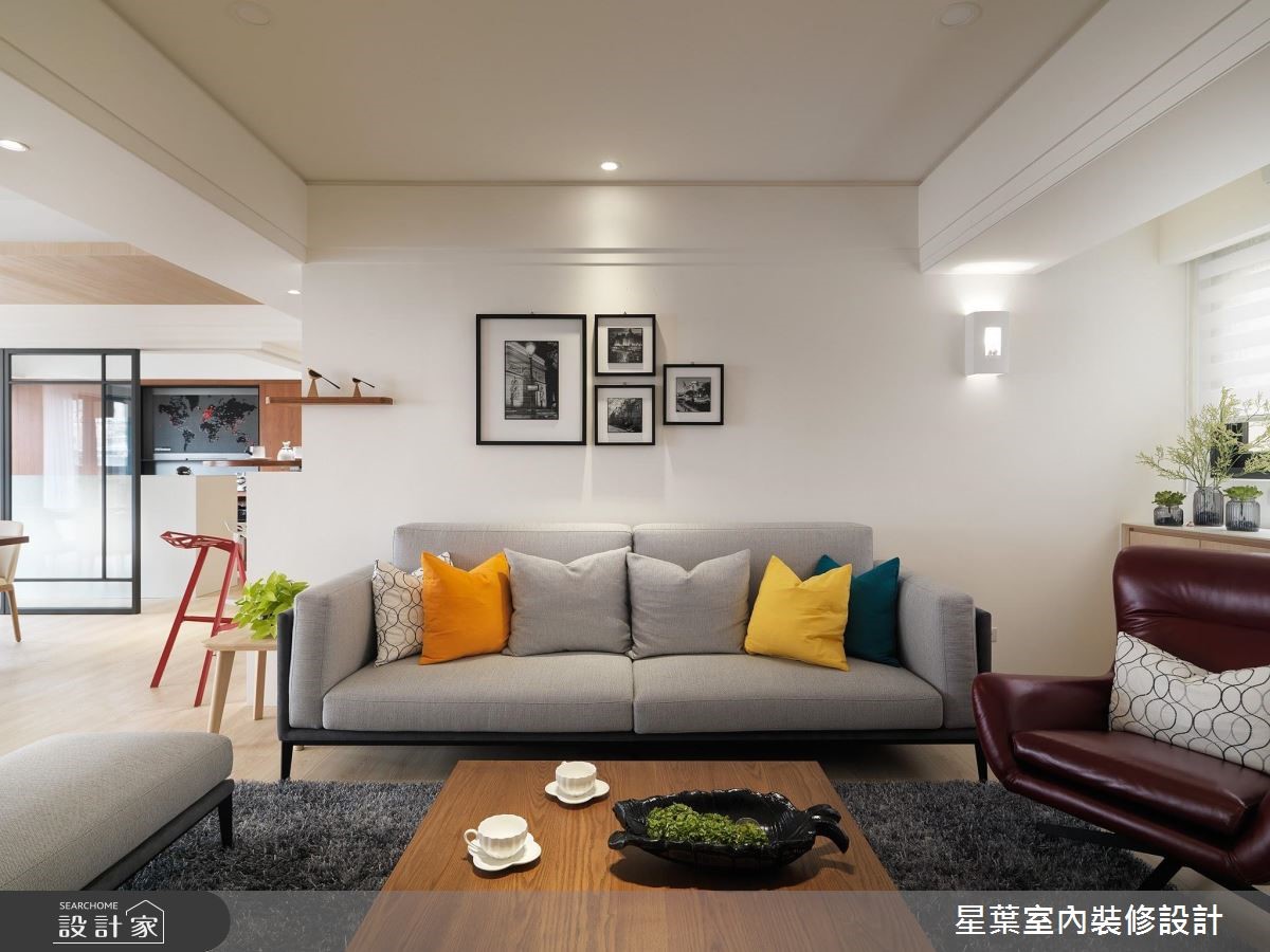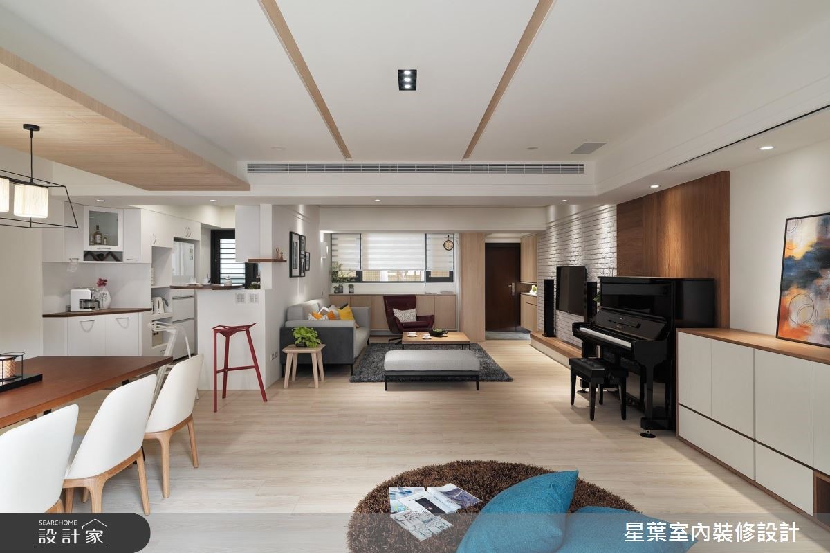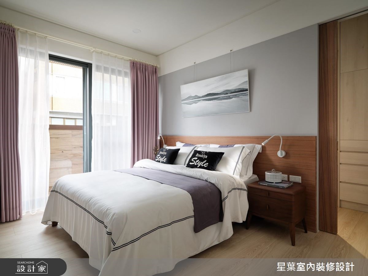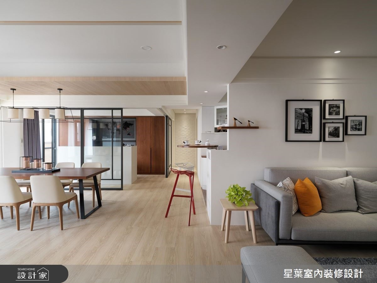 142平方米的居宅,是屋主送给女儿的新婚宅,设计师改善空间采光问题,将两扇半的高窗拆除改为落地窗,让住家每一处都可接收到阳光照拂,同时亦变更格局,打造更为宽广的公领域范围,替屋主网罗风格美学及实用机能。【三面大窗,达成空气与光线流通】公领域以三面大窗援引采光,达成空气与光线的自在流通,再加上设计师特别于入口处的45度角加开一扇固定景窗,藉由户外日光与南方松挹注明亮绿意,同时给予开放式的公领域规划,让天花展现简洁线条,创造宽阔敞朗的视野感受。【通透门片,延续住宅明亮度】设计师更配置具通透性的书房门片,延续住宅整体的明亮度,书房背墙采以木作、黑色铁件打造书柜,强化空间收纳机能。主卧则承袭温煦的明亮度,呈现简约舒适的调性,在床头处拼接木质肌理与浅灰色调,型塑充满利落层次的墙面表情!