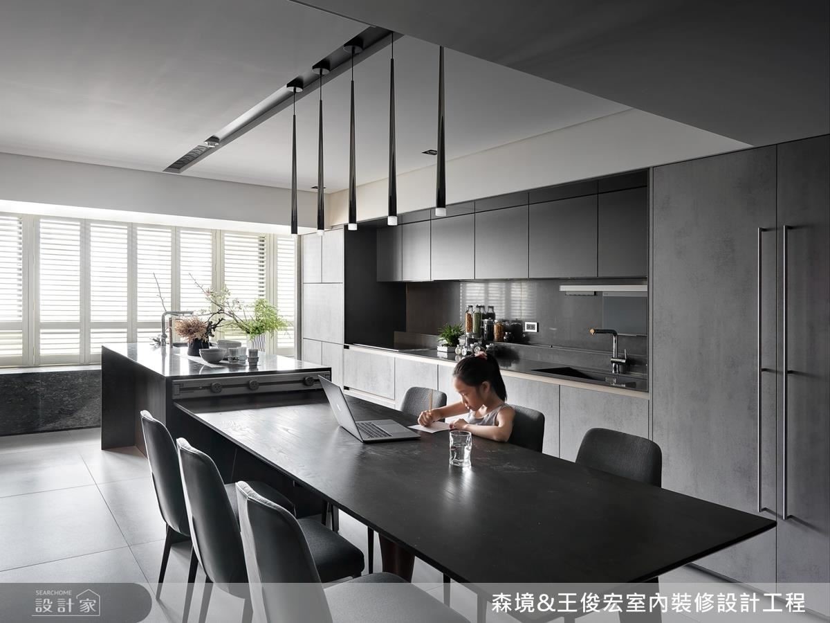实用机能是住宅设计不可忽略的一环。开放式餐厨的空间中,沿结构梁下方与壁面规画收纳。中央并设置中岛,长餐桌俨然是中岛的延伸,同时也是孩子们阅读、学习的书桌,让餐厨区成为凝聚家人情感的重心。