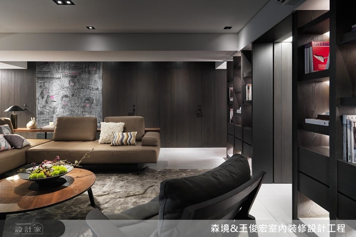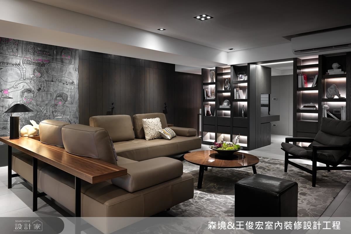 在色彩规划上,全室皆以灰、白、黑为基调,奠定沉稳基础。沙发背后的黑板墙,则由艺术家Joseph手工绘制漫画风的大幅插图,结合同系列抱枕,充满趣味活力的设计,成功创造视觉亮点。