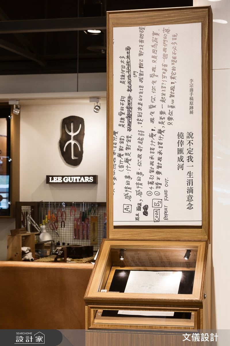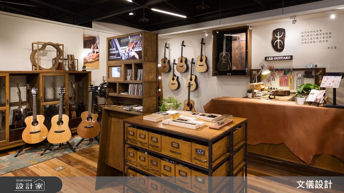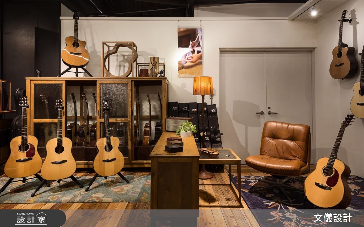 56平方米的混搭风手工吉他店,设计师选用大量的实木材质,利用木材的自然纹理,搭配了雅致的地毯,让全然木质的空间瞬间变得更加鲜活有温度。藉由温柔漂亮的花卉图腾,细细衬托着属于台湾的手工吉他品牌,表现出随兴、自在的感受,进行一场设计和音乐的冒险。【木质与铁件刻画自在工业风】店内氛围宛如木吉他的音韵,细腻中带点粗犷。设计师保留实木质感,再以铁件元素勾勒,带出工业风格的随兴。而不做天花的设计,则能保有原本的空间高度,呈现开阔感受。一把把的木吉他端坐于地面和开放柜体中,没有精品般的距离感,反而亲切的令人不禁细细端详。旁边角落是吉他工作台,铁网架挂置各式工具,搭配一盏台灯,聚焦着匠人忙碌而专注的神情。