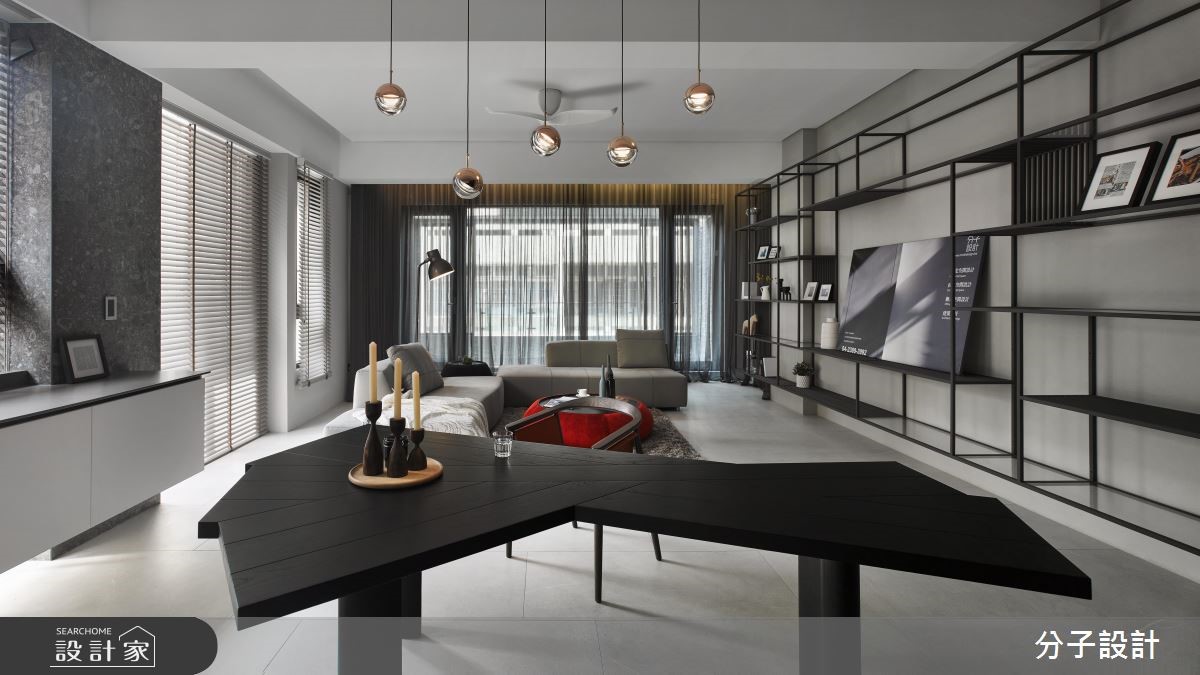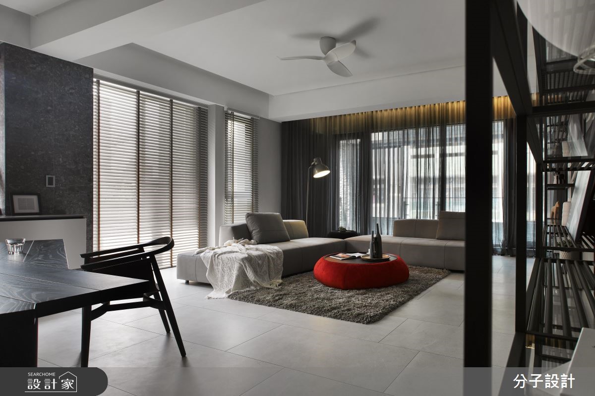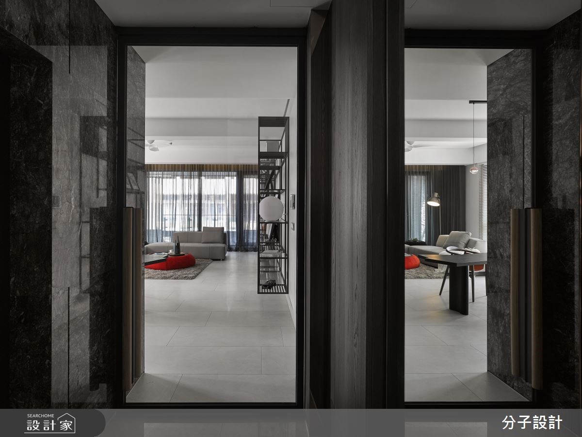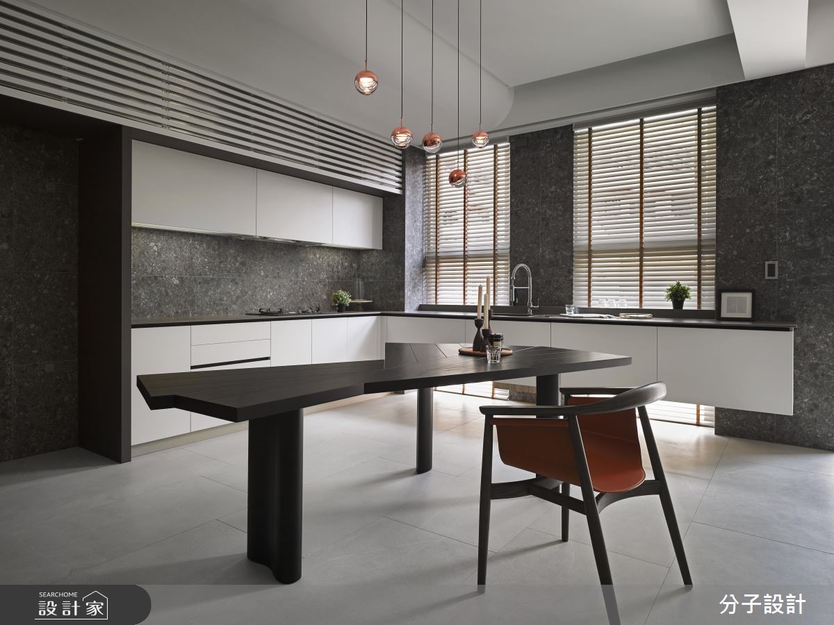 165平方米的独栋别墅,建物原始现况较为狭长,使屋型显得狭隘不透气,于是设计师安排厨房、餐桌、客厅三者的平行关系,凝聚前、中、后的空间呼应,并透过色调及软件的合宜分布,展现居宅的深度层次。【窗面与灰白色调,奠定清冷基调】设计师运用窗面导引明亮氛围,并挹注灰色、白色等底调铺叙,在天然质感和纹理之中,奠定空间的清冷基质,电视墙则呈现延伸尺度,采用方管铁件贯穿架构,营造视觉上的轻盈质量,并于客厅陈列红色软件,恰如其分地网罗焦点,形成整体之中的灵魂要角。【木纹柜体,实用与好看兼具】卧室采以浅色大理石建构桌台,简易通透地界定出个别区域,且藉由深色木纹带出质朴风韵,而大面积的柜体安排,除了满足收纳需求,也预留未来增加电视机的可能性;客厕选用浅色瓷砖,再配置可透光的铁件门片,既保有隐私功能,也适度引渡光线、维持清透感。